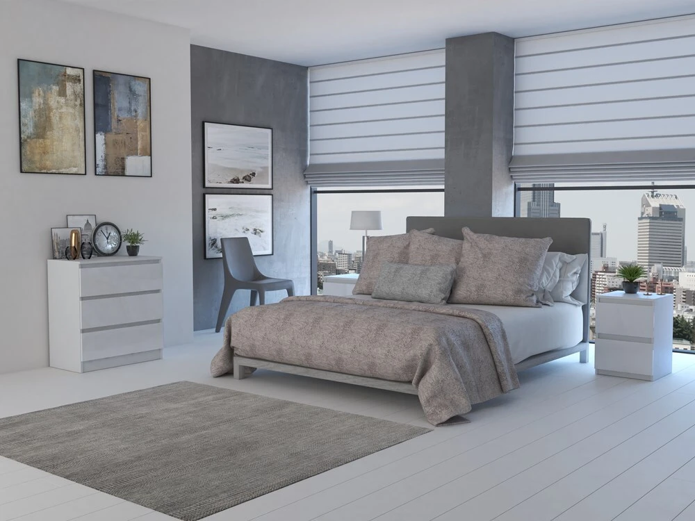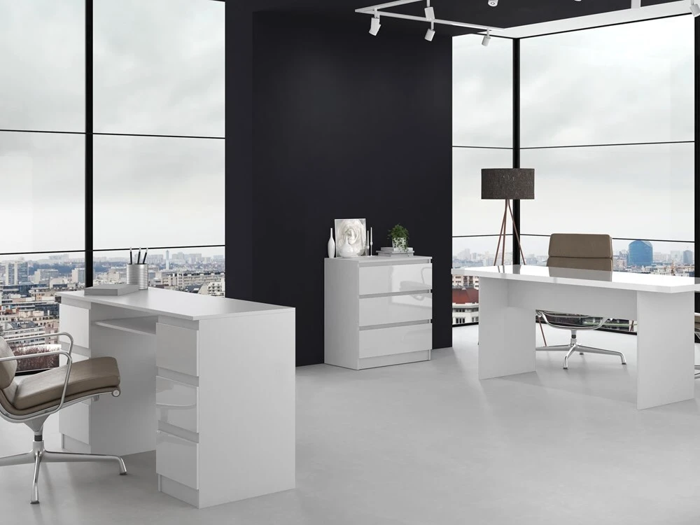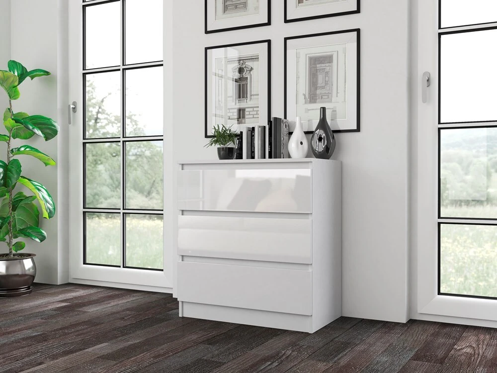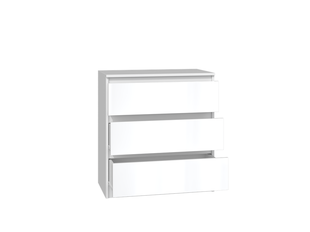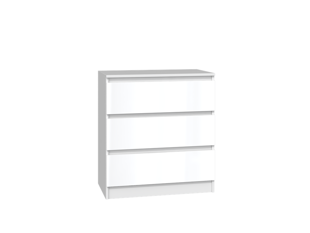 Trijų stalčių komoda;Komodos išmatavimai: aukštis - 77 cm, plotis - 70 cm, gylis - 40 cm;Korpusas pagamintas iš laminuotos medžio drožlių plokštės (MDP);Priekinė komodos dalis - dengta aukštos kokybės laku, naudojamu apdailai; Lakas - atsparus spalvos pokyčiams, kuriuos sukelia UV spinduliai, todėl paviršių lengva išlaikyti švarų;Komodos kraštų apdaila - PVC, pasižymintis dideliu mechaniniu bei cheminiu atsparumu;Korpuso spalva - balta; priekinės dalies spalva - blizgi balta;Stalčių bėgeliai ritininiai;