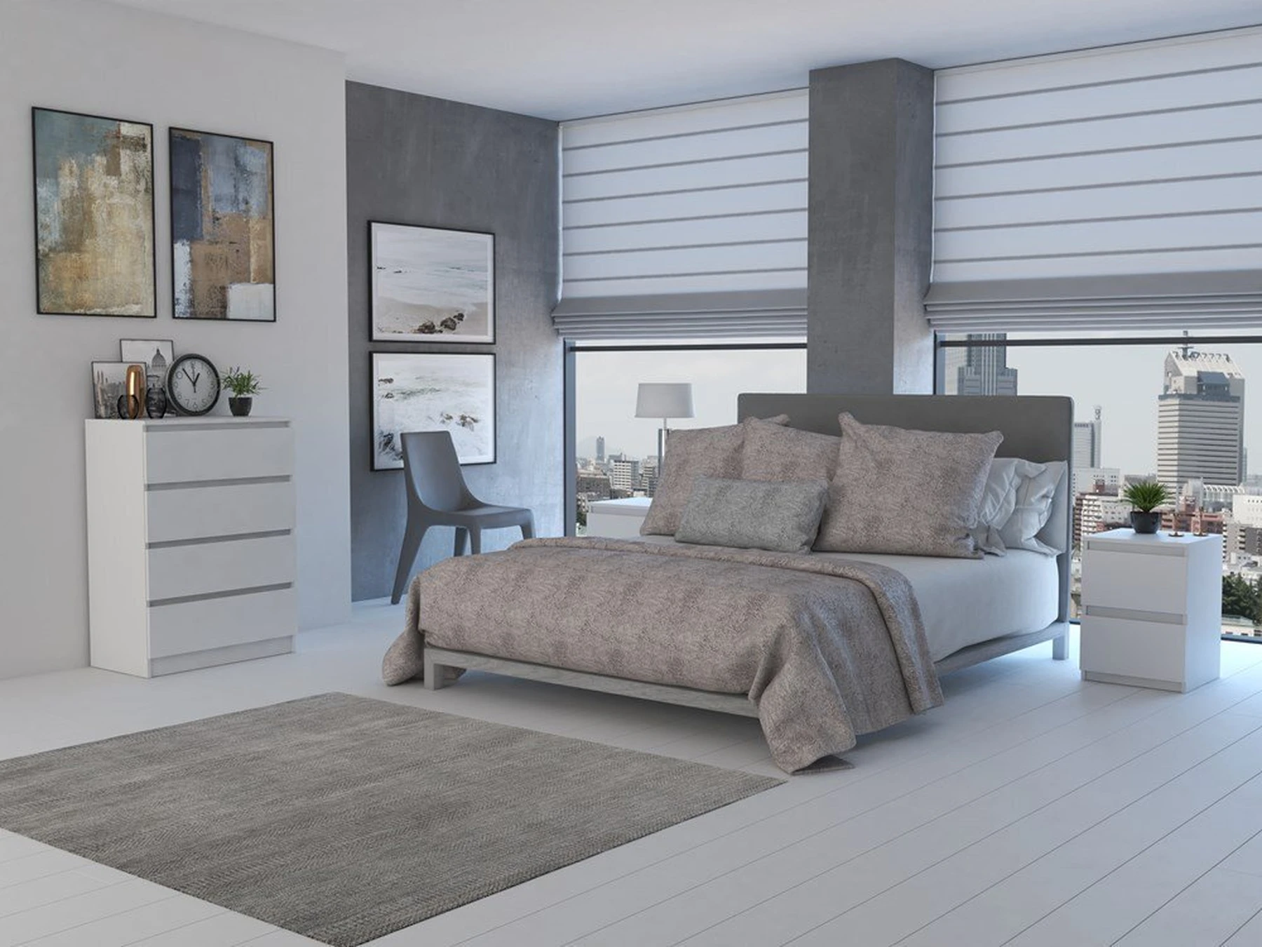Keturių stalčių komoda;Komodos išmatavimai: aukštis - 97 cm, plotis - 70 cm, gylis - 40 cm;Korpusas pagamintas iš laminuotos medžio drožlių plokštės (MDP);Komodos kraštų apdaila - PVC, pasižymintis dideliu mechaniniu bei cheminiu atsparumu;Korpuso spalva - balta;Stalčių bėgeliai ritininiai;