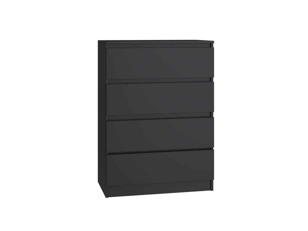 Keturių stalčių komoda;Komodos išmatavimai: aukštis - 97 cm, plotis - 70 cm, gylis - 40 cm;Korpusas pagamintas iš laminuotos medžio drožlių plokštės (MDP);Komodos kraštų apdaila - PVC, pasižymintis dideliu mechaniniu bei cheminiu atsparumu;Korpuso spalva - juoda;Stalčių bėgeliai ritininiai;