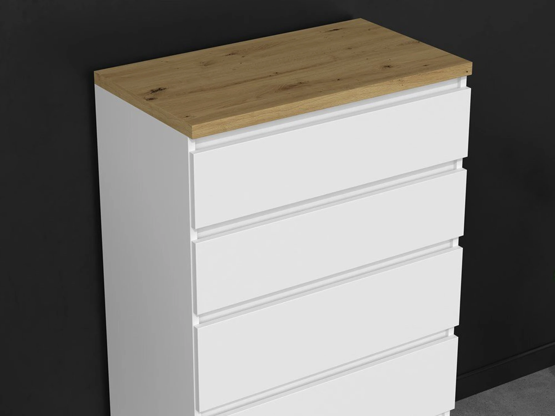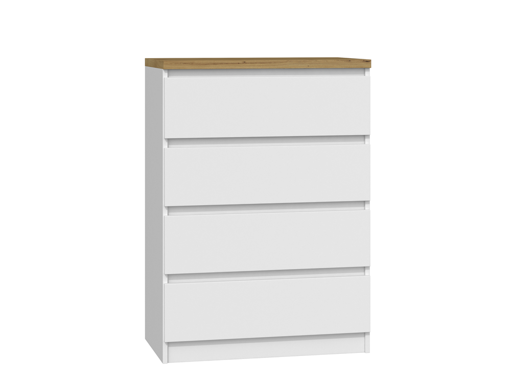 Keturių stalčių komoda;Komodos išmatavimai: aukštis - 98 cm, plotis - 70 cm, gylis - 40 cm;Korpusas pagamintas iš laminuotos medžio drožlių plokštės (MDP);Komodos kraštų apdaila - PVC, pasižymintis dideliu mechaniniu bei cheminiu atsparumu;Korpuso spalva - balta, viršutinė dalis - ruda (artisan oak);Stalčių bėgeliai ritininiai;