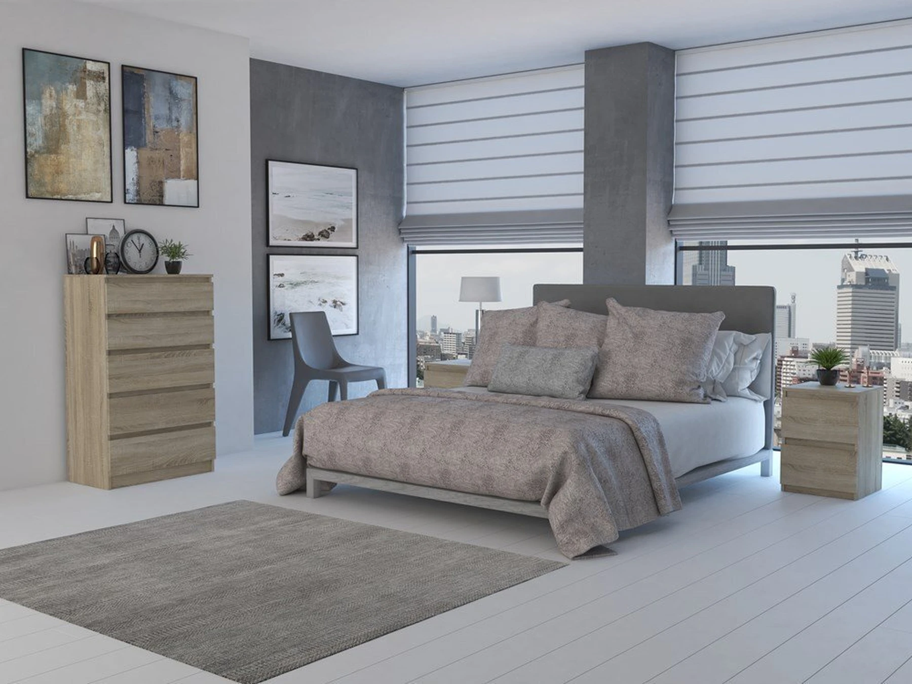Penkių stalčių komoda;Komodos išmatavimai: aukštis - 112 cm, plotis - 70 cm, gylis - 40 cm;Korpusas pagamintas iš laminuotos medžio drožlių plokštės (MDP);Komodos kraštų apdaila - PVC, pasižymintis dideliu mechaniniu bei cheminiu atsparumu;Spalva: ąžuolo;Stalčių bėgeliai ritininiai;