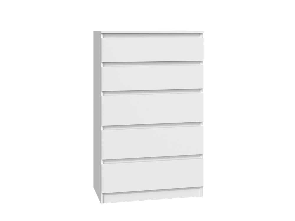 Penkių stalčių komoda;Komodos išmatavimai: aukštis - 112 cm, plotis - 70 cm, gylis - 40 cm;Korpusas pagamintas iš laminuotos medžio drožlių plokštės (MDP);Komodos kraštų apdaila - PVC, pasižymintis dideliu mechaniniu bei cheminiu atsparumu;Spalva: balta;Stalčių bėgeliai ritininiai;