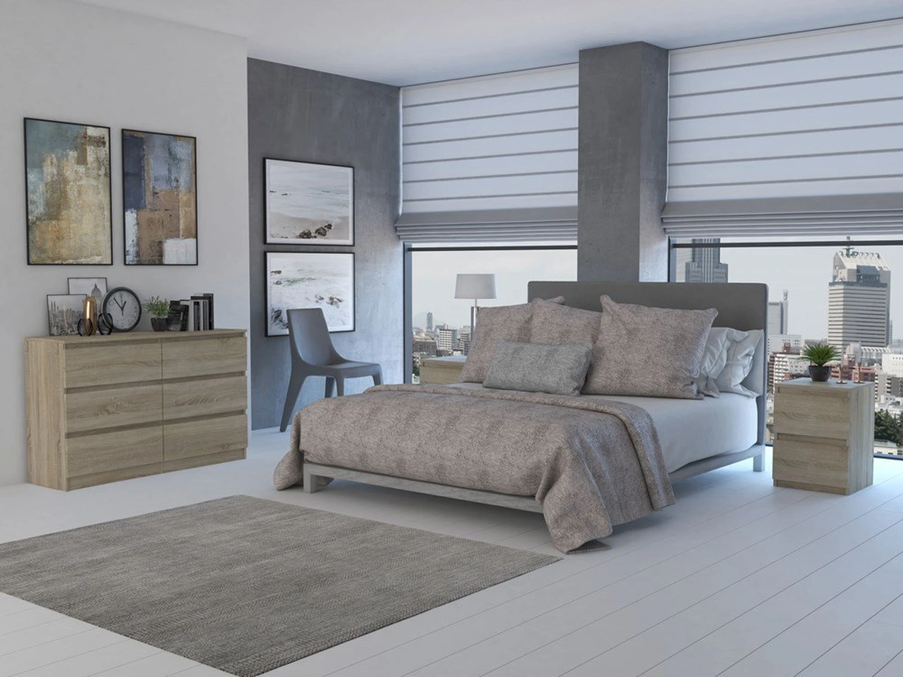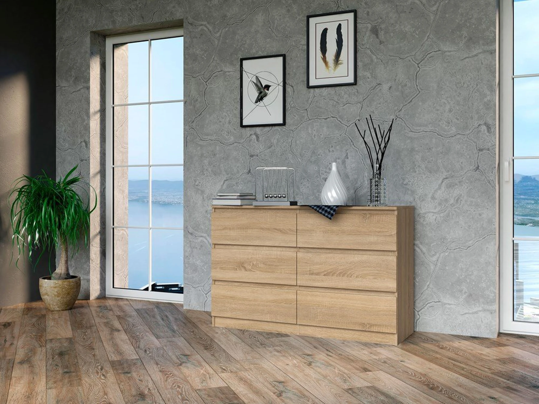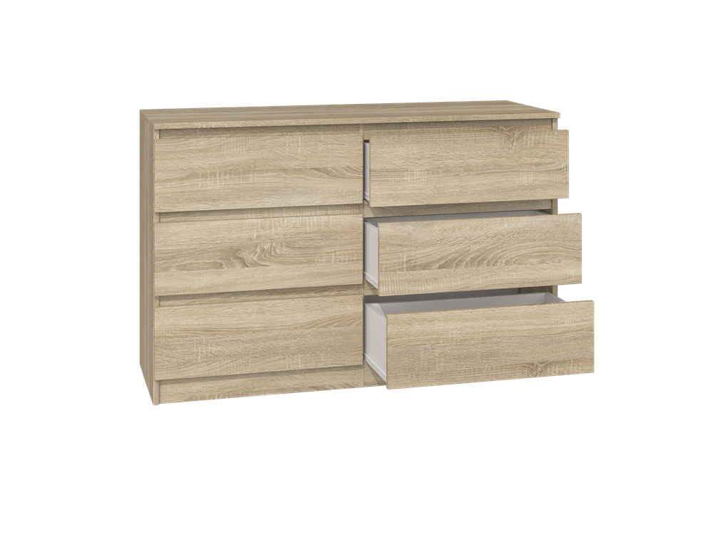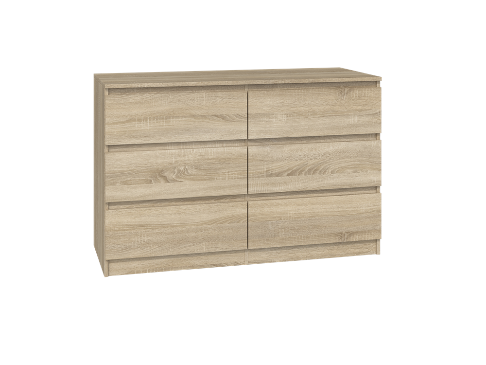 pastatoma 6-ų stalčių komoda;komoda pagaminta iš 16 mm storio laminuotos medžio drožlių plokštės su ABS kraštų apdaila;ritininiai bėgeliai apsaugos stalius nuo iškritimo;komodos išmatavimai: plotis - 120 cm, gylis - 40 cm, aukštis - 75 cm;vidinis išplanavimas pavaizduotas 2 nuotraukoje;komodos spalva: korpusas - sonoma ąžuolas (matinė), fadasas - sonoma ąžuolas (matinė);tvirta ir stabili konstrukcija;