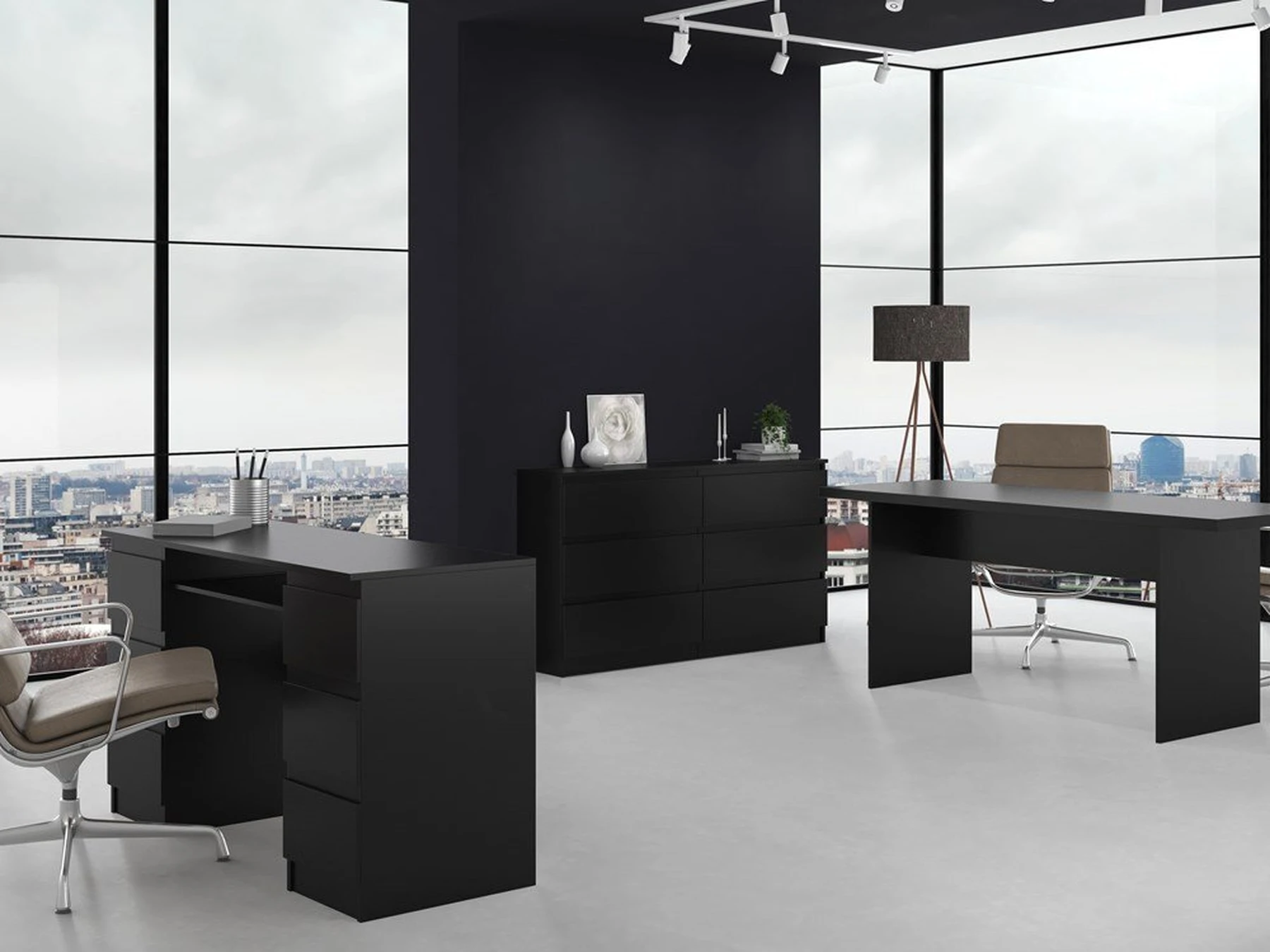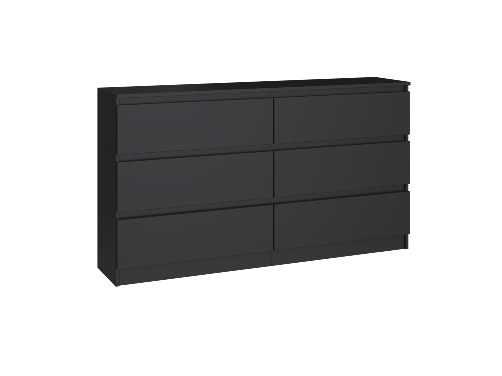 Šešių stalčių komoda;Komodos išmatavimai: aukštis - 77 cm, plotis - 138 cm, gylis - 40 cm;Korpusas pagamintas iš laminuotos medžio drožlių plokštės, kurios storis 16 mm (MDP);Komodos kraštų apdaila - PVC, pasižymintis dideliu mechaniniu bei cheminiu atsparumu;Spalva - juoda; Stalčių bėgeliai ritininiai;