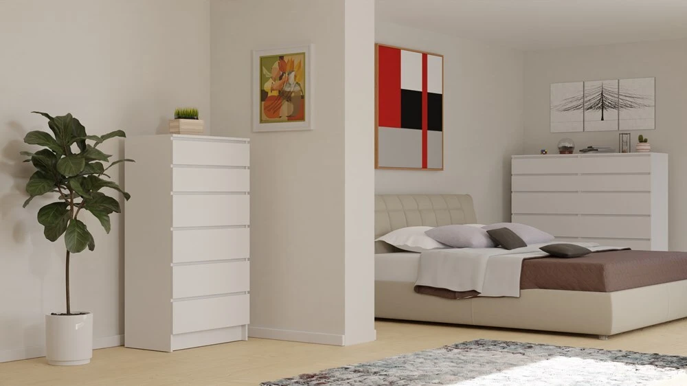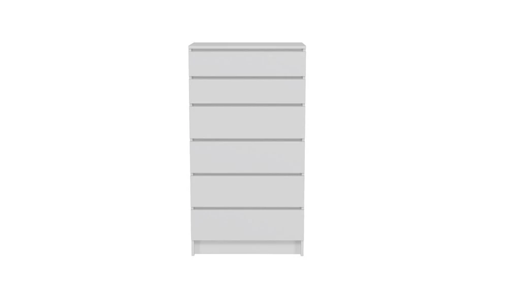 Minimalistinio, modernaus dizaino komoda su šešiais stalčiais;Komodos išmatavimai: plotis - 70 cm, aukštis - 132 cm, gylis - 40 cm;Pagaminta iš: 16 mm laminuotos medžio drožlių plokštės (MDP);Spalva: matinė balta;Komodos kraštų apdailos medžiaga: ABS;Stalčių bėgeliai ritininiai, metaliniai;