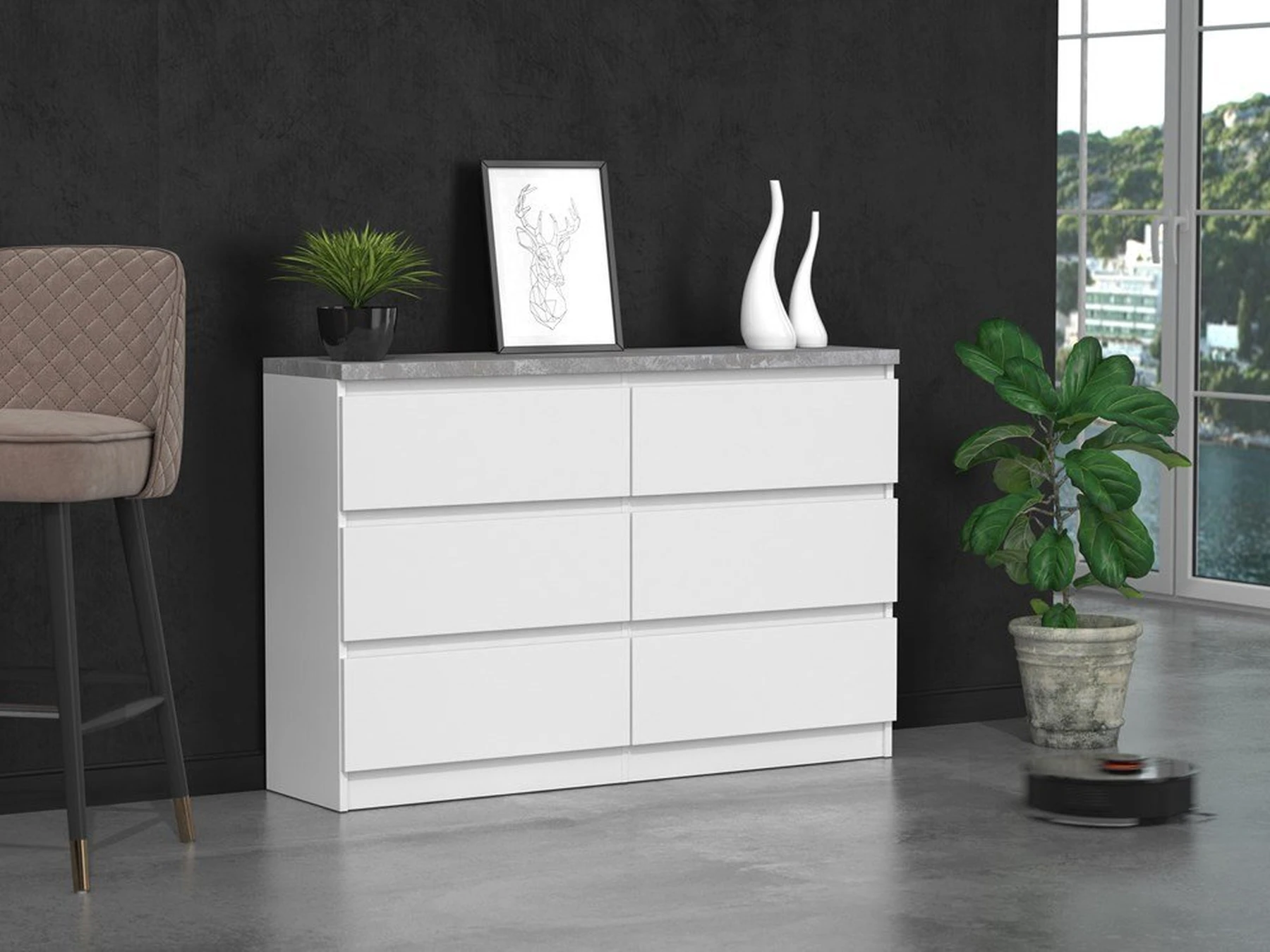Šešių stalčių komoda;Komodos išmatavimai: aukštis - 78 cm, plotis - 120 cm, gylis - 30 cm;Korpusas pagamintas iš laminuotos medžio drožlių plokštės, kurios storis 16 mm (MDP);Komodos kraštų apdaila - PVC, pasižymintis dideliu mechaniniu bei cheminiu atsparumu;Korpuso spalva: balta; viršutinė dalis: pilka (beton);Stalčių bėgeliai ritininiai;
