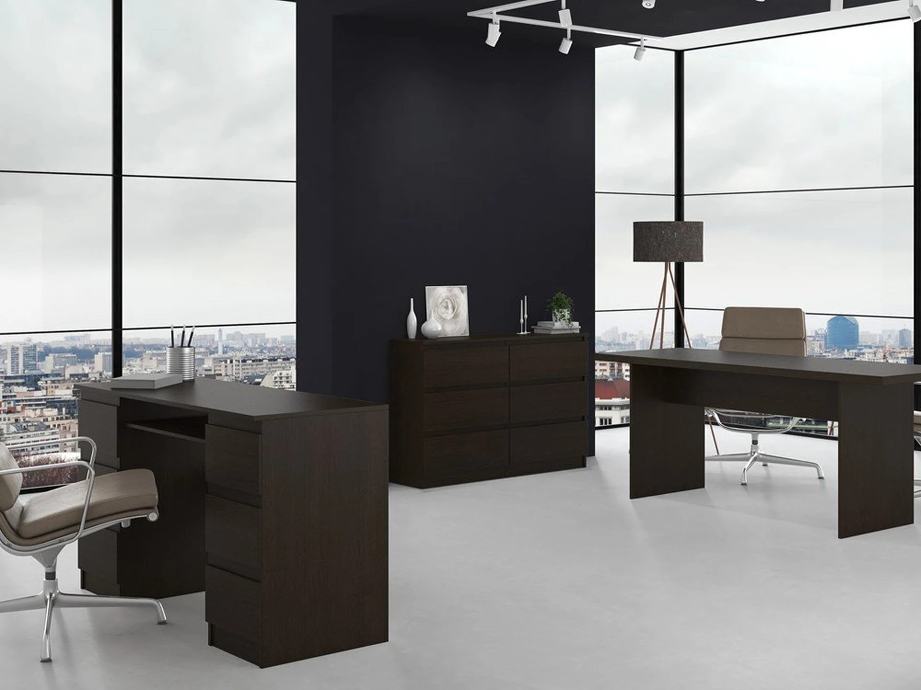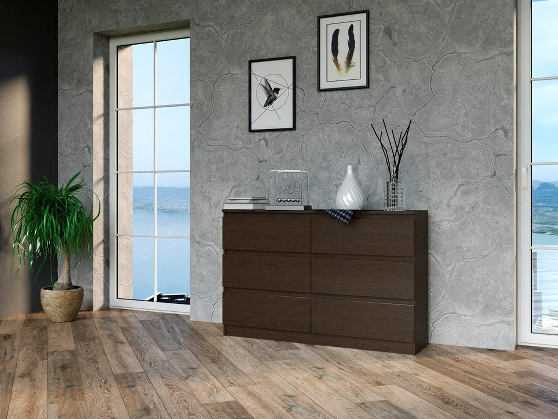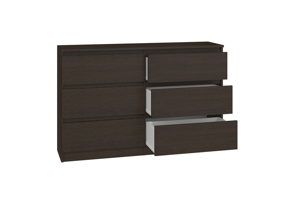 Minimalistinio stiliaus šešių stalčių komoda;Komodos išmatavimai: aukštis - 77 cm, plotis - 120 cm, gylis - 30 cm;Pagaminta iš laminuotos medžio drožlių plokštės (MDP);Spalva: tamsiai ruda (wenge);Komodos kraštų apdailos medžiaga: PVC;Komodos stalčiai su metaliniais ritininiais bėgeliais;Svoris: 35 kg;