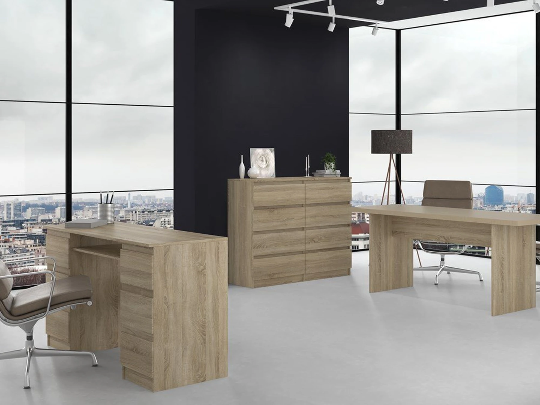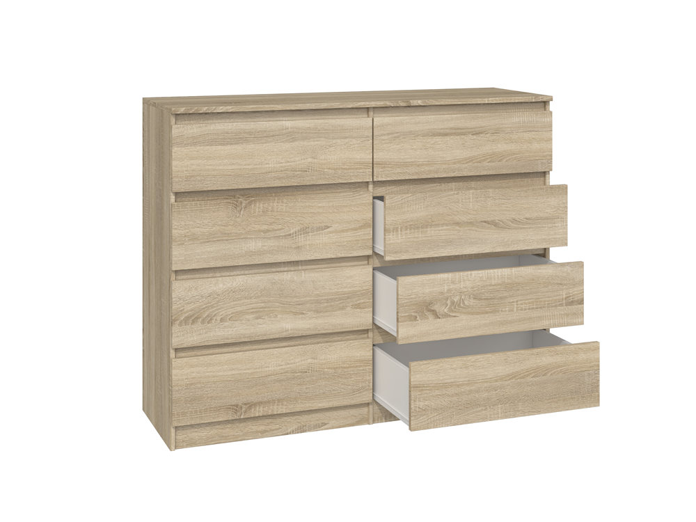Aštuonių stalčių komoda;Komodos išmatavimai: aukštis - 97 cm, plotis - 120 cm, gylis - 40 cm;Korpusas pagamintas iš laminuotos medžio drožlių plokštės, kurios storis 16 mm (MDP);Komodos kraštų apdaila - PVC, pasižymintis dideliu mechaniniu bei cheminiu atsparumu;Spalva: ąžuolo (sonoma oak);Stalčių bėgeliai ritininiai;