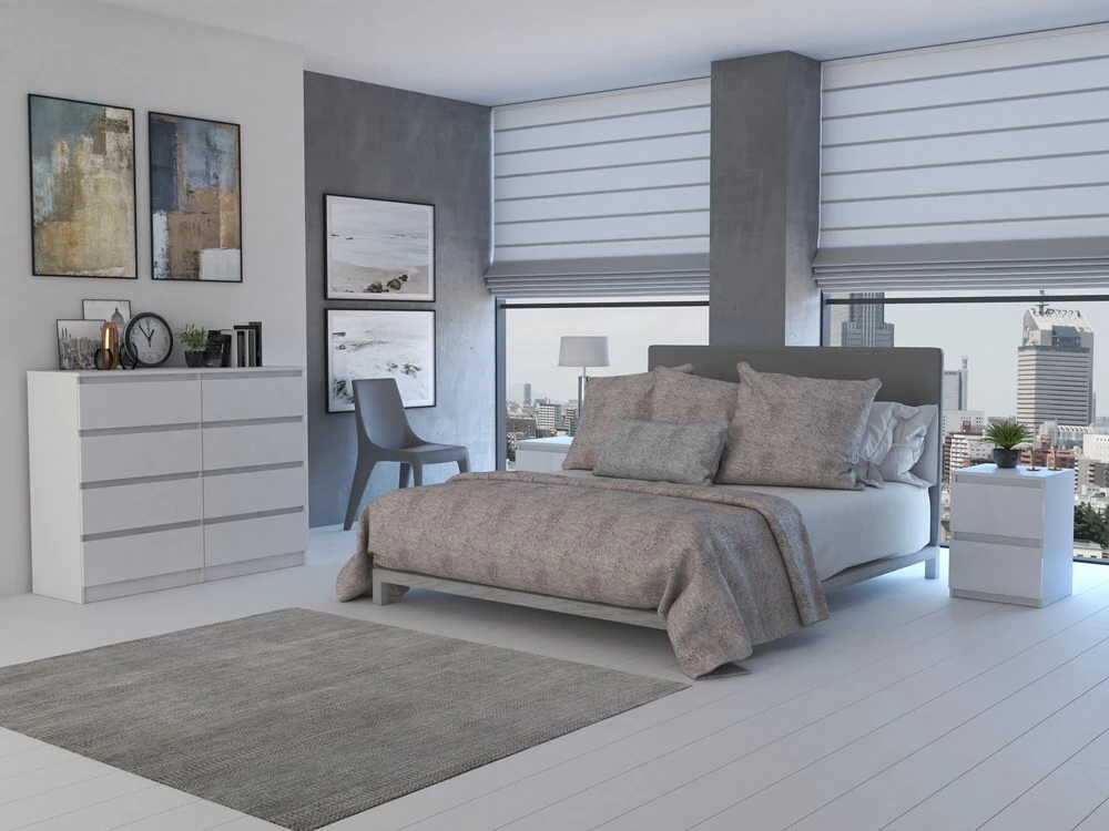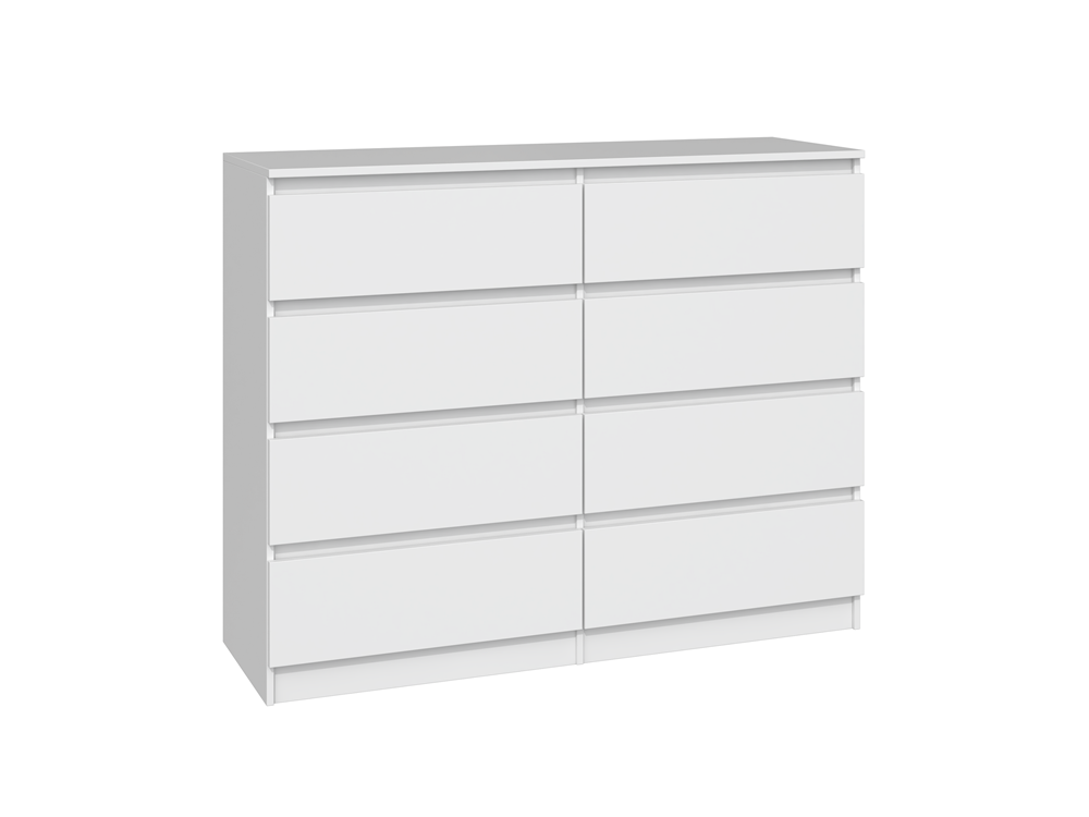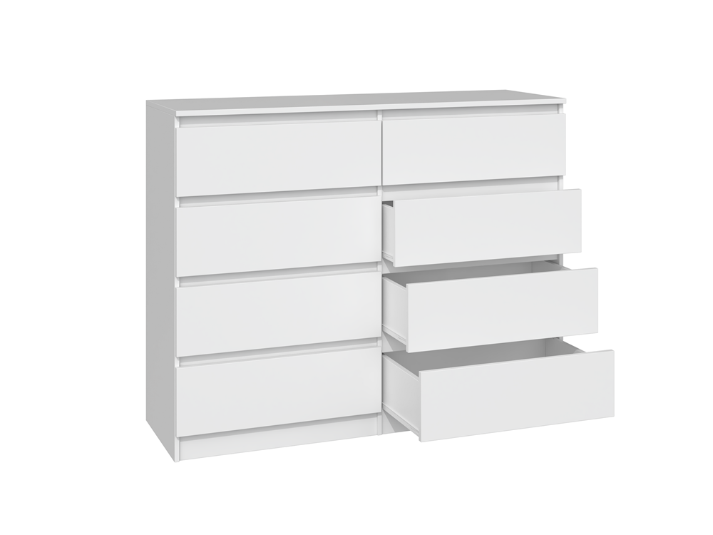 Aštuonių stalčių komoda;Komodos išmatavimai: aukštis - 97 cm, plotis - 120 cm, gylis - 40 cm;Korpusas pagamintas iš laminuotos medžio drožlių plokštės, kurios storis 16 mm (MDP);Komodos kraštų apdaila - PVC, pasižymintis dideliu mechaniniu bei cheminiu atsparumu;Spalva: balta;Stalčių bėgeliai ritininiai;