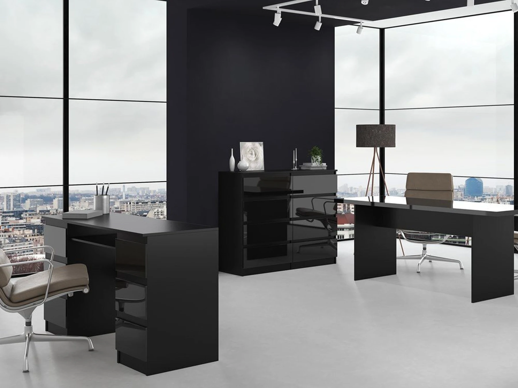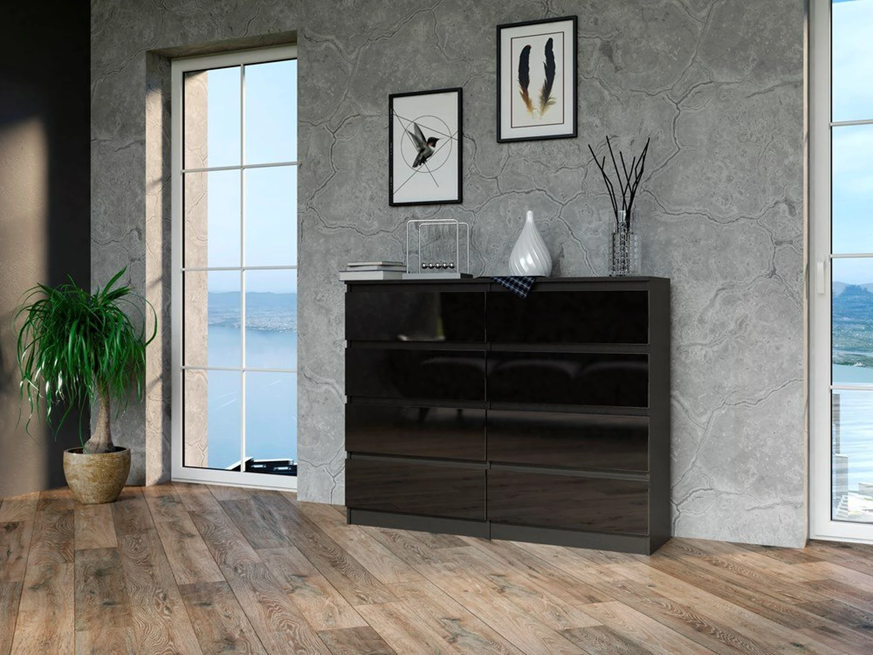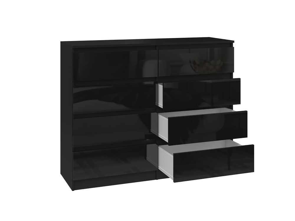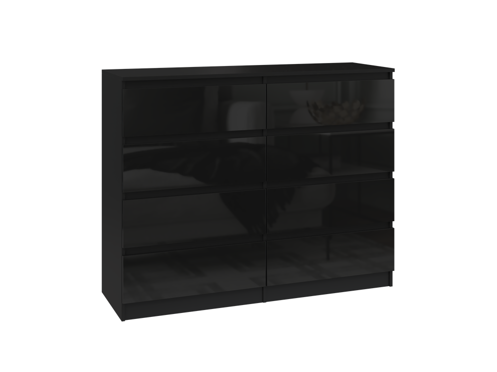 Aštuonių stalčių komoda;Komodos išmatavimai: aukštis - 97 cm, plotis - 120 cm, gylis - 40 cm;Korpusas pagamintas iš laminuotos medžio drožlių plokštės, kurios storis 16 mm (MDP);Priekinė komodos dalis - dengta aukštos kokybės laku, naudojamu apdailai; Lakas - atsparus spalvos pokyčiams, kuriuos sukelia UV spinduliai, todėl paviršių lengva išlaikyti švarų;Komodos kraštų apdaila - PVC, pasižymintis dideliu mechaniniu bei cheminiu atsparumu;Korpuso spalva - juoda; priekinės dalies spalva - blizgi juoda;Stalčių bėgeliai ritininiai;