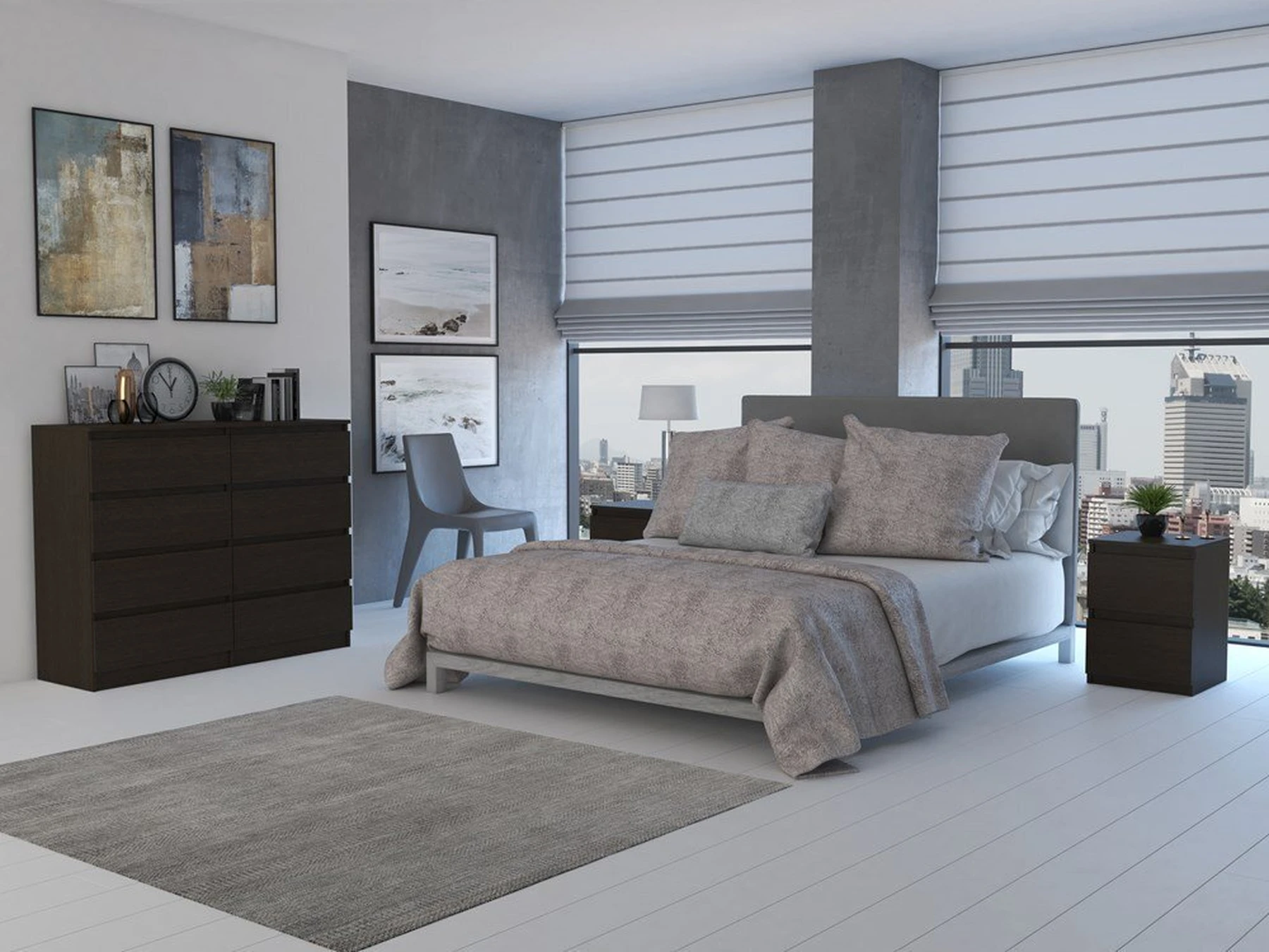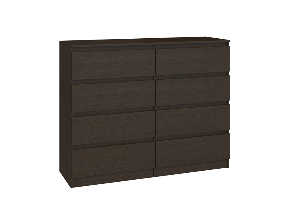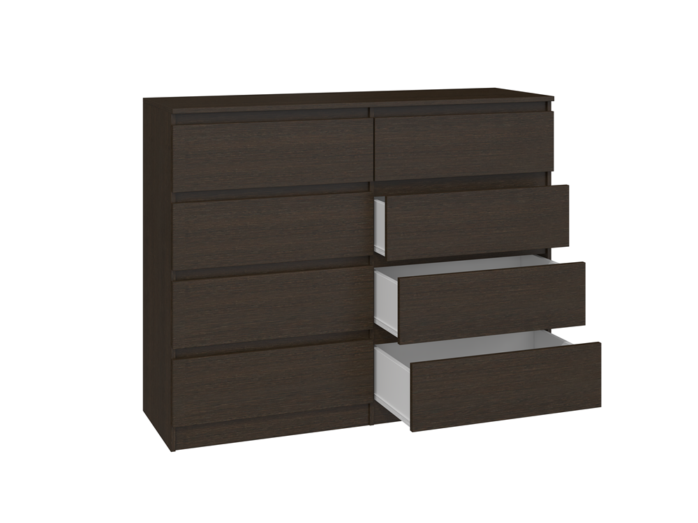 Aštuonių stalčių komoda;Komodos išmatavimai: aukštis - 97 cm, plotis - 120 cm, gylis - 40 cm;Korpusas pagamintas iš laminuotos medžio drožlių plokštės, kurios storis 16 mm (MDP);Komodos kraštų apdaila - PVC, pasižymintis dideliu mechaniniu bei cheminiu atsparumu;Spalva: tamsiai ruda (wenge);Stalčių bėgeliai ritininiai;