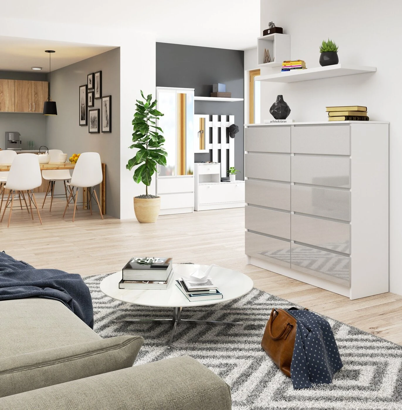 Aprašymas buvo automatiškai išverstas, gali pasitaikyti klaidų. Komoda, modelis K, 120 cm, pagaminta iš madingo metalo blizgesio. Pilki, blizgūs fasadai sudaryti su matinės baltos spalvos korpusu, kuris yra nuoseklus ir harmoningas spalvų derinys. Tokia spalvų kompozicija puikiai dera su kitais atspalviais, todėl baldai puikiai tinka bet kokiam stiliui. Baltos / metalo blizgesio komoda yra įranga, kuri patenkins net išrankiausią vartotoją. Tai užtikrina patogias laikymo sąlygas, o tai garantuoja net 10 erdvių stalčių. Į juos galite susidėti drabužius, vaikiškus žaislus, dokumentus ar darbui reikalingus aksesuarus. Baldai gali atlikti įvairias funkcijas: stalčiai naudojami pagalbiniams tikslams, o viršus gali būti naudojamas kaip dekoracijų pagrindas. Metalinio blizgesio skrynios yra puikus pasirinkimas žmonėms, vertinantiems naujoviškumą ir madingi sprendimai. Tai labai geros kokybės gaminys, sukurtas taip, kad atitiktų šiuolaikinių vartotojų poreikius. Elegancija ir funkcionalumas niekada neišeina iš mados. - Komodos korpusas pagamintas iš laminuotos plokštės balto kilimėlio 16 mm atsparus trinčiai - Priekinės dalys pagamintos iš MDF akrilo akrilo metalo blizgus - Stalčiai yra ant metalinių ritinėlių kreiptuvų. - Kraštai padengti ABS briauna, kad būtų apsaugota nuo pažeidimų. - Savaime surenkama komoda stalčiai – Pristatyme pateikiamos instrukcijos – 24 mėnesių garantija