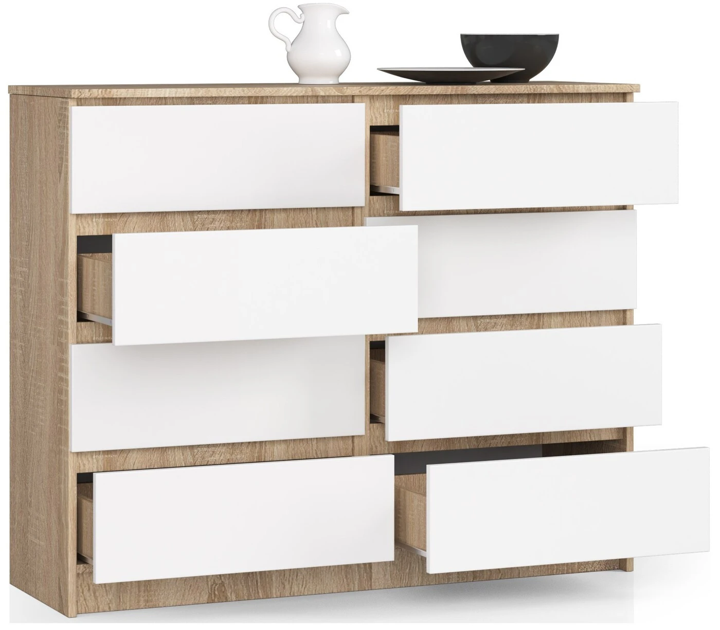 Aprašymas buvo automatiškai išverstas, gali pasitaikyti klaidų. Graži, moderni komoda, kurią galima sėkmingai naudoti svetainėje, miegamajame ar valgomajame, yra aukštos kokybės gaminys. Baldai pagaminti iš 16 milimetrų storio laminuotos plokštės, atsparios trinčiai, patvarios ir gražiai pateikiamos bet kokiame interjere. Komodos kraštai padengti ABS apvadu. Baltos spalvos fasadai puikiai dera prie dabartinių tendencijų, o solidžios baldų struktūros, kurioje buvo įrengti aštuoni erdvūs stalčiai, nusipelno ypatingo dėmesio. Stalčiai eina ant metalinių ritininių kreiptuvų, o visas baldas skirtas savarankiškai surinkti. Šis pasiūlymas skirtas žmonėms, kurie nori eiti su laiku, renkantis nesenstančių, universalių spalvų baldus. Komoda gali būti derinama su kitais to paties stiliaus baldais, kurie taip pat yra mūsų pasiūlyme. Raginame daugiau sužinoti apie mūsų platų asortimentą, siūlomą už palankią kainą. - Komoda pagaminta iš trinčiai atsparios laminuotos plokštės - Stalčių fasadai iš laminuotos plokštės - Stalčiai yra ant metalinių ritinėlių kreiptuvų - Kraštai padengti ABS briauna, užtikrinančia aukštą apsaugą nuo pažeidimų - Savarankiškai surenkama komoda - Instrukcija pridedama - 24 mėnesių garantija