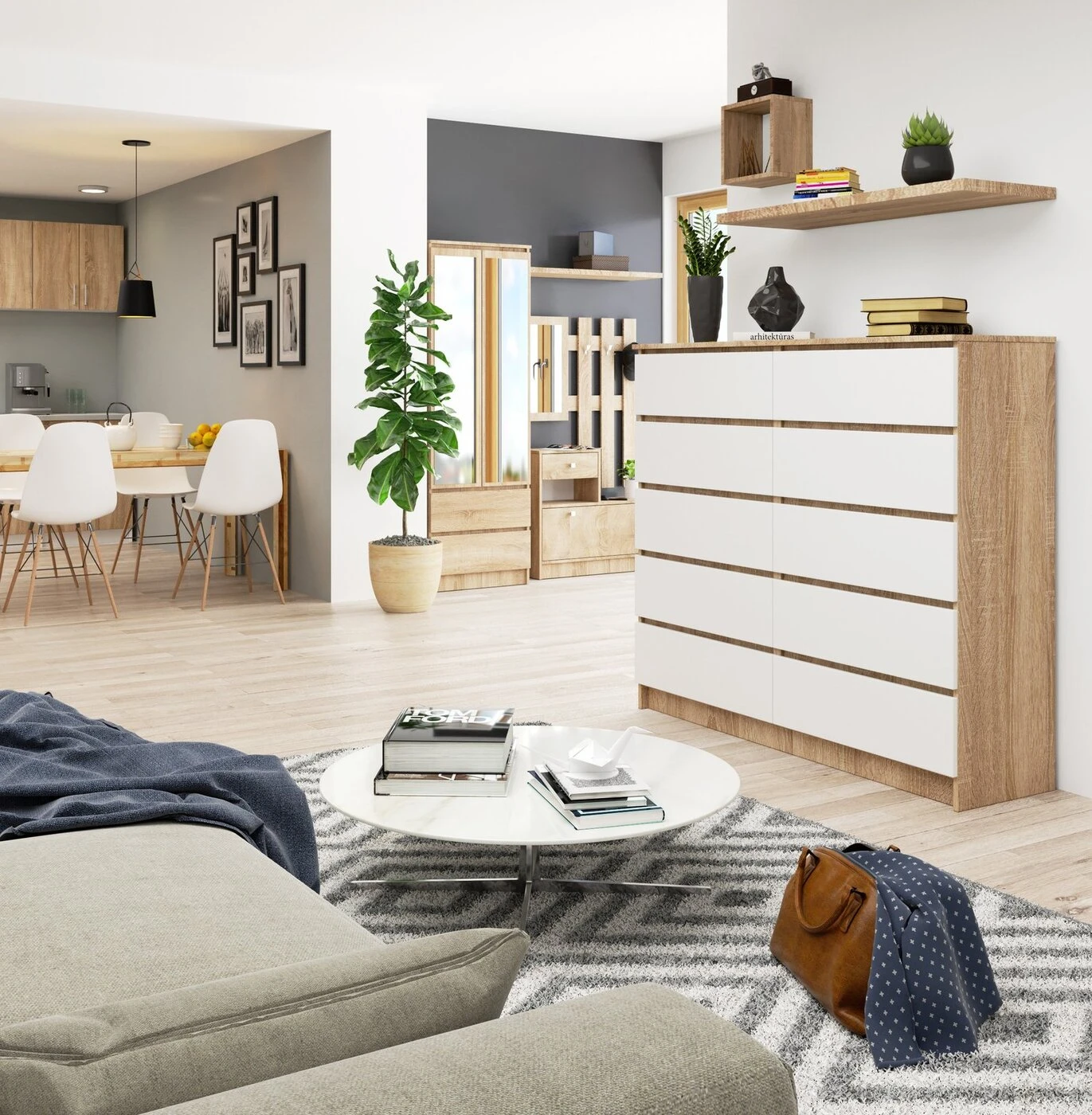 Aprašymas buvo automatiškai išverstas, gali pasitaikyti klaidų. Sonoma ąžuolas pastaruoju metu tapo viena populiariausių baldų spalvų. Klientų akyse jis sulaukė pripažinimo dėl itin universalaus pobūdžio. Be to, sonomos ąžuolo spalvos baldus labai lengva valyti – tai ir neabejotinas jų privalumas. Antroji, ne mažiau populiari spalva – nesenstanti balta. Mūsų siūlomi baldai yra subtilus šių dviejų spalvų derinys, kuris davė puikų efektą. Didžiausią dėmesį skiriame kokybei Mums svarbiausia aukšta gaminių kokybė, todėl Jums siūlome baldą iš patvarių, pažeidimams atsparių medžiagų. 140 cm ilgio K komodoje yra aštuoni praktiški ir talpūs stalčiai. Baldai pagaminti iš 16 milimetrų storio laminuotos plokštės, atsparios trinčiai. Kraštai padengti ABS apvadu. Baldo aukštis – 121 centimetras, o gylis – 40 centimetrų. Pastatoma spintelė yra iš kolekcijos, kurioje gausu ir daug kitų įrenginių, kuriuos derinant vienas su kitu, bus sukurtas gražus išdėstymas. Geros kainos ir funkcionalumas Mūsų produktų pranašumai taip pat yra funkcionalumas ir konkurencingos kainos. Rekomenduojame įsigyti komodą, kuri yra sonomos ąžuolo ir klasikinės baltos spalvos derinys. Jis tikrai papuoš bet kokį modernų interjerą – miegamojo, svetainės, jaunimo, svečių kambario ar biuro interjerą. - Komoda pagaminta iš dilimui atsparios laminuotos plokštės - Stalčių fasadai iš laminuotos plokštės - Stalčiai eina ant metalinių ritinėlių kreiptuvų - Kraštai padengti ABS briauna aukštai apsauga nuo pažeidimų - Savarankiškai surenkama komoda - Instrukcija pridedama - Garantija 24 mėn.