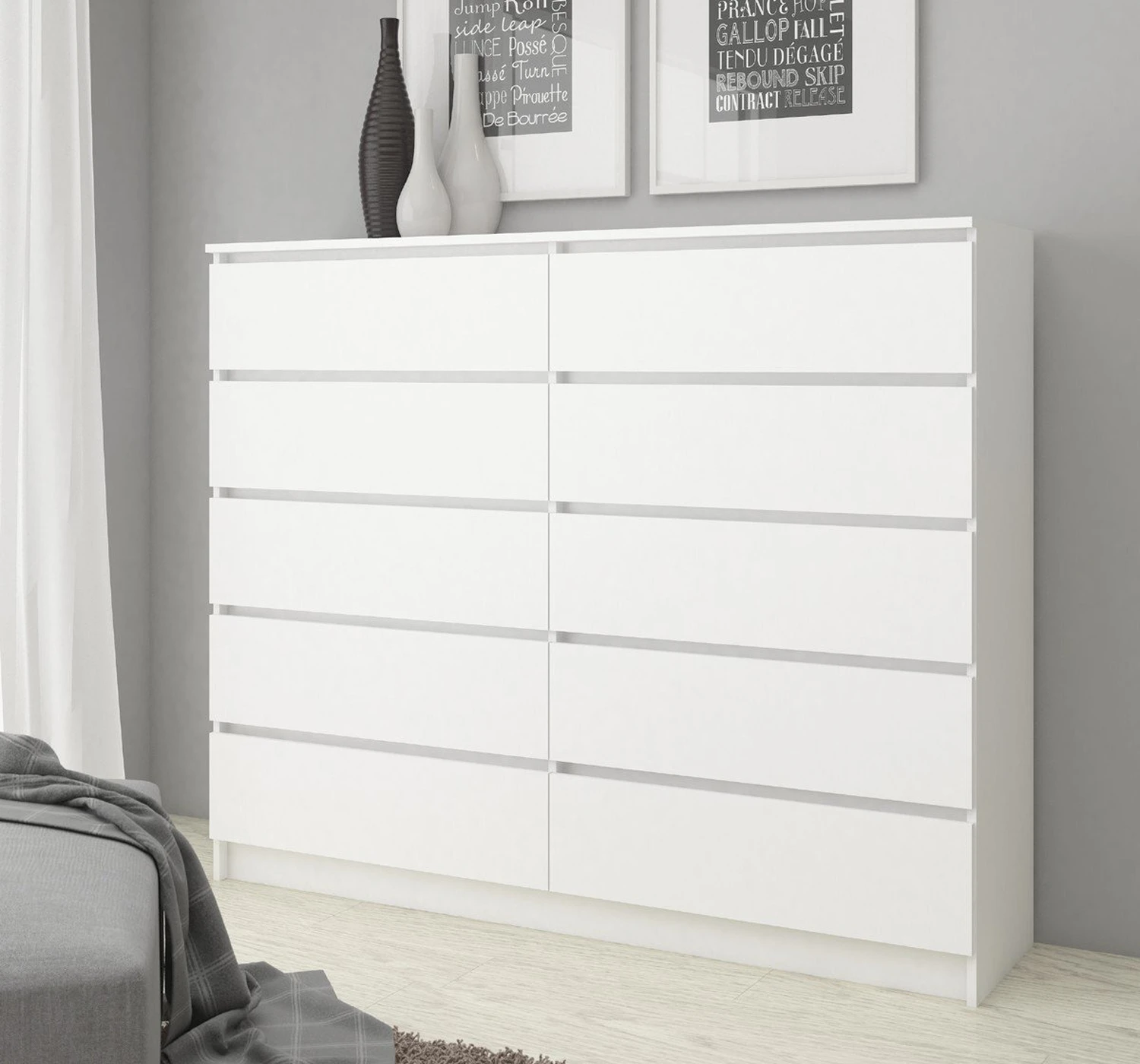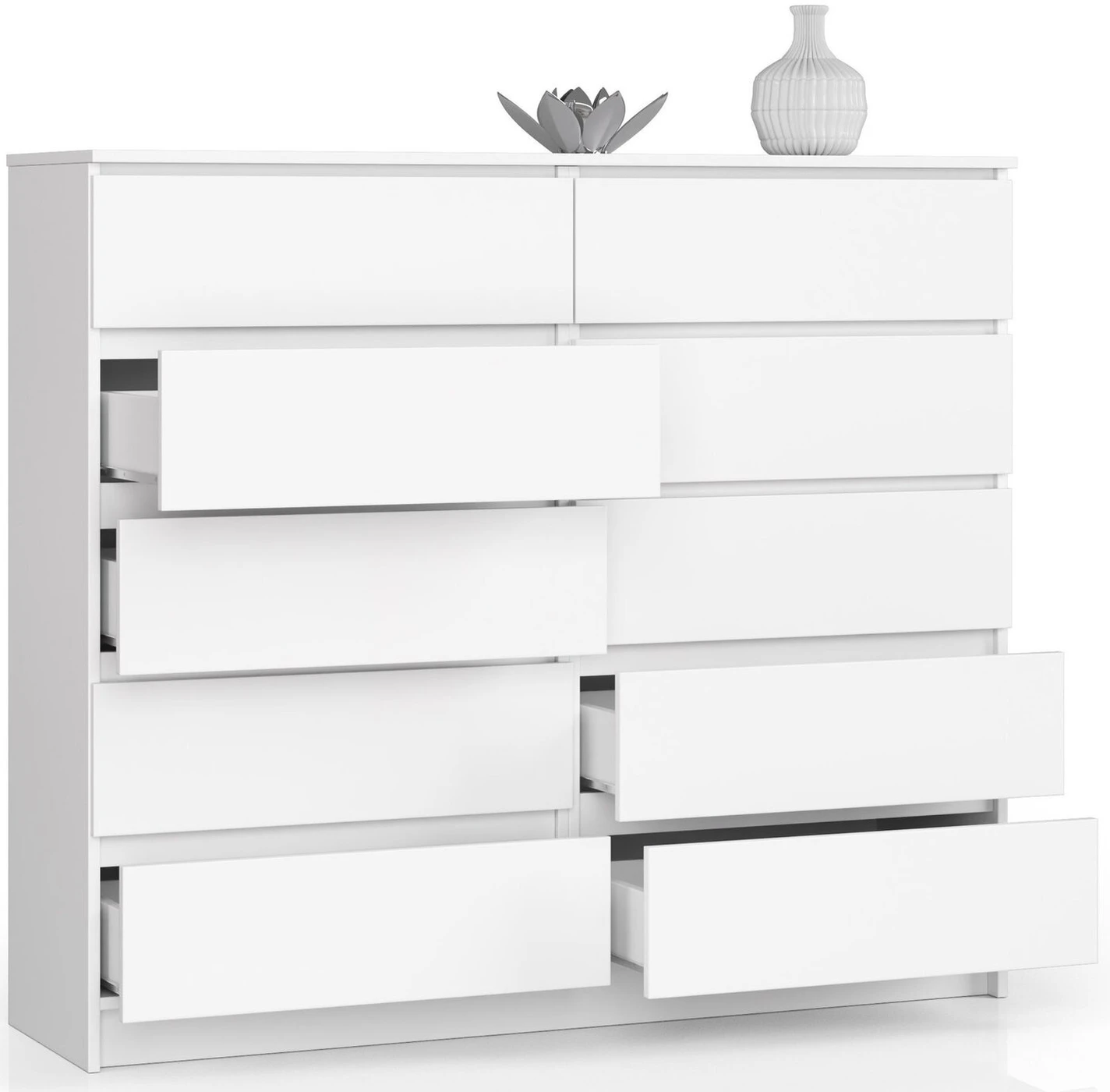 Aprašymas buvo automatiškai išverstas, gali pasitaikyti klaidų. Balta, minimalistinė komoda, puikiai tinkanti tiek moderniam interjerui, tiek mažoms patalpoms, kuriose reikia šviesinimo ir optinio padidinimo. Tai bus praktiška vieta daiktams laikyti – jame yra dešimt erdvių stalčių, kurių dėka galėsite tvarkyti savo butą. Puikiai atrodo svetainėje, biure ar siauroje salėje. Ši komoda pagaminta iš aukštos kokybės, dilimui atsparios laminuotos plokštės iš a. patikimas gamintojas, kuris garantuoja ilgaamžiškumą ir aukštą kokybę.kokybę. Dažniausiai pažeidžiami spintelių kraštai – jas lengva užkliūti, plyšti ar subraižyti. Siekiant to išvengti, komodos kraštai papildomai padengti ABS apvadu, užtikrinančiu dar didesnę apsaugą nuo pažeidimų . Tai reiškia, kad net ir naudojant kasdien, baldai tarnaus daug metų ir vis tiek atrodys kaip nauji. Būtent ergonomikos principai daro mus kasdien lydinčius daiktus patogius ir saugius naudoti. Todėl šios komodos kokybę demonstruoja funkcionalūs sprendimai: - Stalčiai, pastatyti ant metalinių ritinėlių kreiptuvų, kad galėtų sklandžiai ir netrukdyti - Stalčių fasadai pagaminti iš patvarios laminuotos plokštės - Komodos kraštai padengti ABS apvadu - Tarpai tarp stalčių leidžia patogiai paimti už priekio ir atsidaryti nereikia montuoti rankenėlių, rankenėlių ir rankenų, kad komoda stalčiai išlieka minimalistiniai, neprarasdami nė vieno savo funkcionalumo. Baldai skirti savarankiškai surinkti, o tai palengvina pridedama išsami instrukcija. Komodai suteikiama 24 mėnesių garantija.