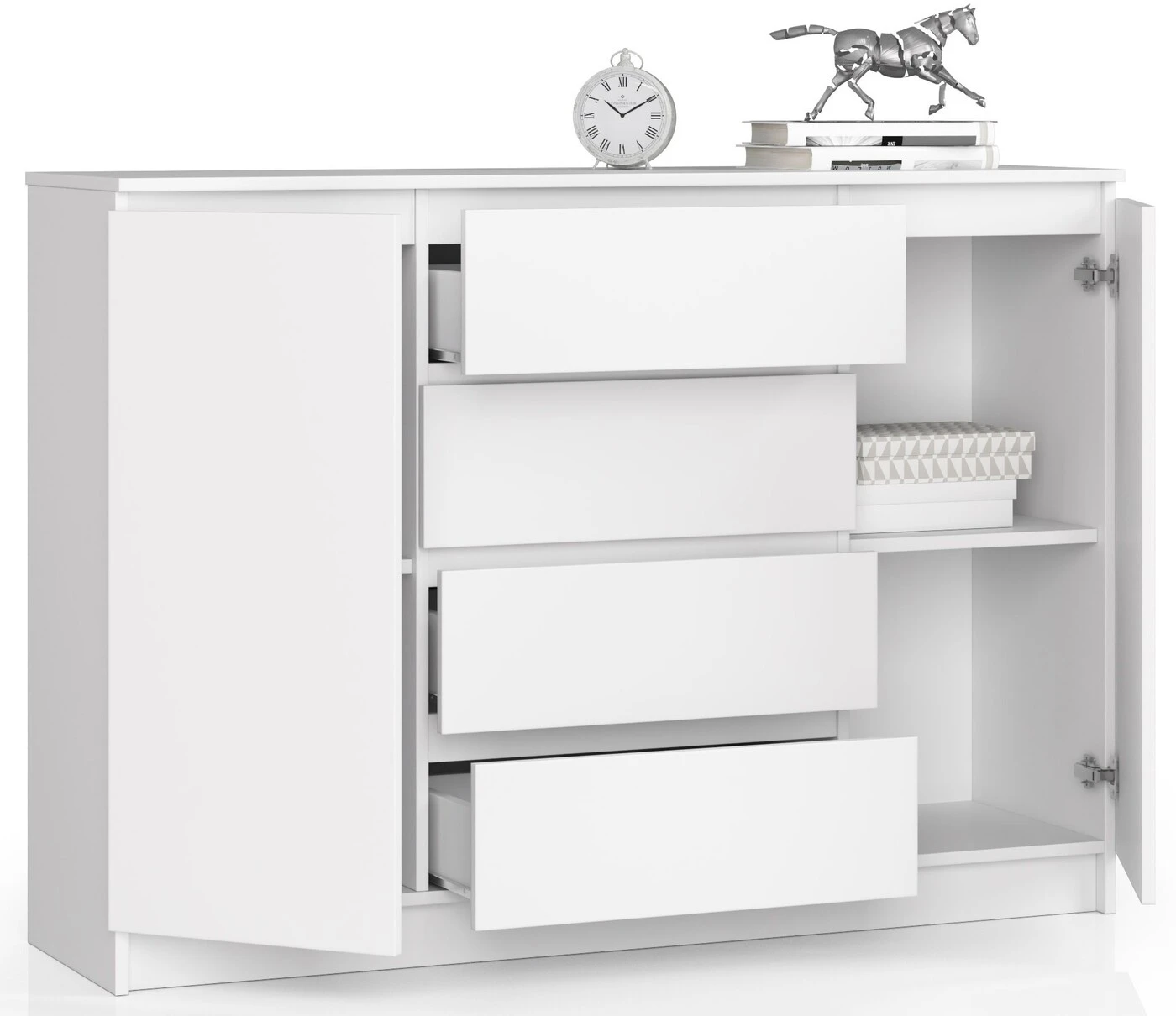Aprašymas buvo automatiškai išverstas, gali pasitaikyti klaidų. Balta yra itin universali ir nesenstanti spalva, kuri puikiai dera su visomis kitomis spalvomis. Nieko keisto, kad daugelis renkasi baltus baldus, kurie žavi tiek savo išvaizda, tiek lengvumu valyti. Mūsų pasiūloje negali trūkti baltų baldų. Džiaugiamės galėdami pristatyti vieną iš pasiūlymų – tai balta komoda su keturiais stalčiais ir dviem spintelėmis su lentynomis. Baldai pagaminti iš 16 milimetrų storio laminuotos plokštės, pasižyminčios dideliu atsparumu dilimui. Kraštai padengti ABS apvadu. Praktiškas baldas tikrai gražiai atrodys tiek svetainėje, tiek miegamajame. Jis taip pat gali būti naudojamas svečių kambaryje, jaunimo kambaryje, valgomajame, salėje, biure ar viešbučio kambaryje. Pažymėtina labai gera kokybė, kruopštus ir tvirtas darbas bei konkurencinga kaina. Raginame pasinaudoti mūsų paslaugomis.