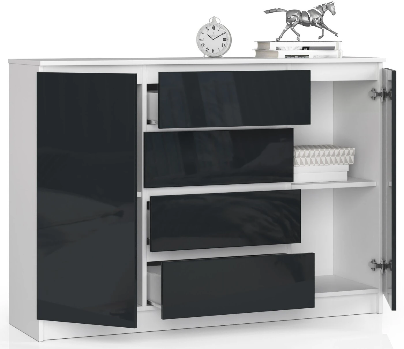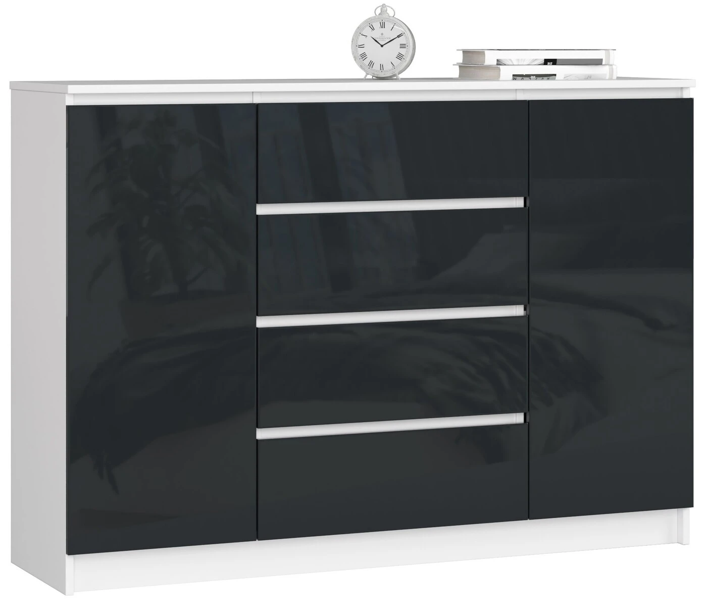 Aprašymas buvo automatiškai išverstas, gali pasitaikyti klaidų. Dviejų spalvų komoda K 140 su 2 spintelėmis ir 4 stalčiais pagaminta iš MDF plokštės su akrilo danga (gamintojas Kronospan). Baldo korpusas išlaikytas baltos spalvos, o spintelių ir stalčių fasadai pagaminti iš itin blizgios kontrastingos grafito plokštės. Komoda sukurta simetriškai. Jo centrinė dalis – 4 stalčių eilė, o kairėje ir dešinėje – spintelės su viengubomis durelėmis, atsidarančiomis į baldo išorę. Stalčiai ištraukiami dėl metalinių ritinėlių kreiptuvų ir patogiai laikomi dėl didelės erdvės. Kiekvienoje komodoje yra po 2 lentynas. Baltos ir grafito spalvos K 140 komodos privalumai: didelė baldų talpa (138 cm pločio, 99 cm aukščio ir 40 cm gylio); įvairi sandėliavimo vieta – galite naudoti tiek erdvias spinteles, tiek stalčius; apsauga baldo krašto dėka ABS medžiagos; dviejų spalvų dizainas, kuris padidina vartotojo išdėstymo galimybes; komodos gamyba CLP baldų sistemoje – tai leidžia lengvai derinamas su kitų gamintojų baldais; 24 mėnesių gamintojo garantija. Komoda K 140 balta ir grafitas yra universalus baldas su daugybe pritaikymo galimybių. Puikiai tinka beveik bet kokiam šiuolaikiniam interjerui. Jis gali veikti kaip skalbinių spinta miegamajame ar vaikų kambaryje, bet ir kaip baldas, skirtas naudingiems smulkiems daiktams susidėti svetainėje. Valgomajame tai bus erdvi indauja, o prieškambaryje - vieta raktams, krepšiams, kepurėms ir šalikams susidėti.