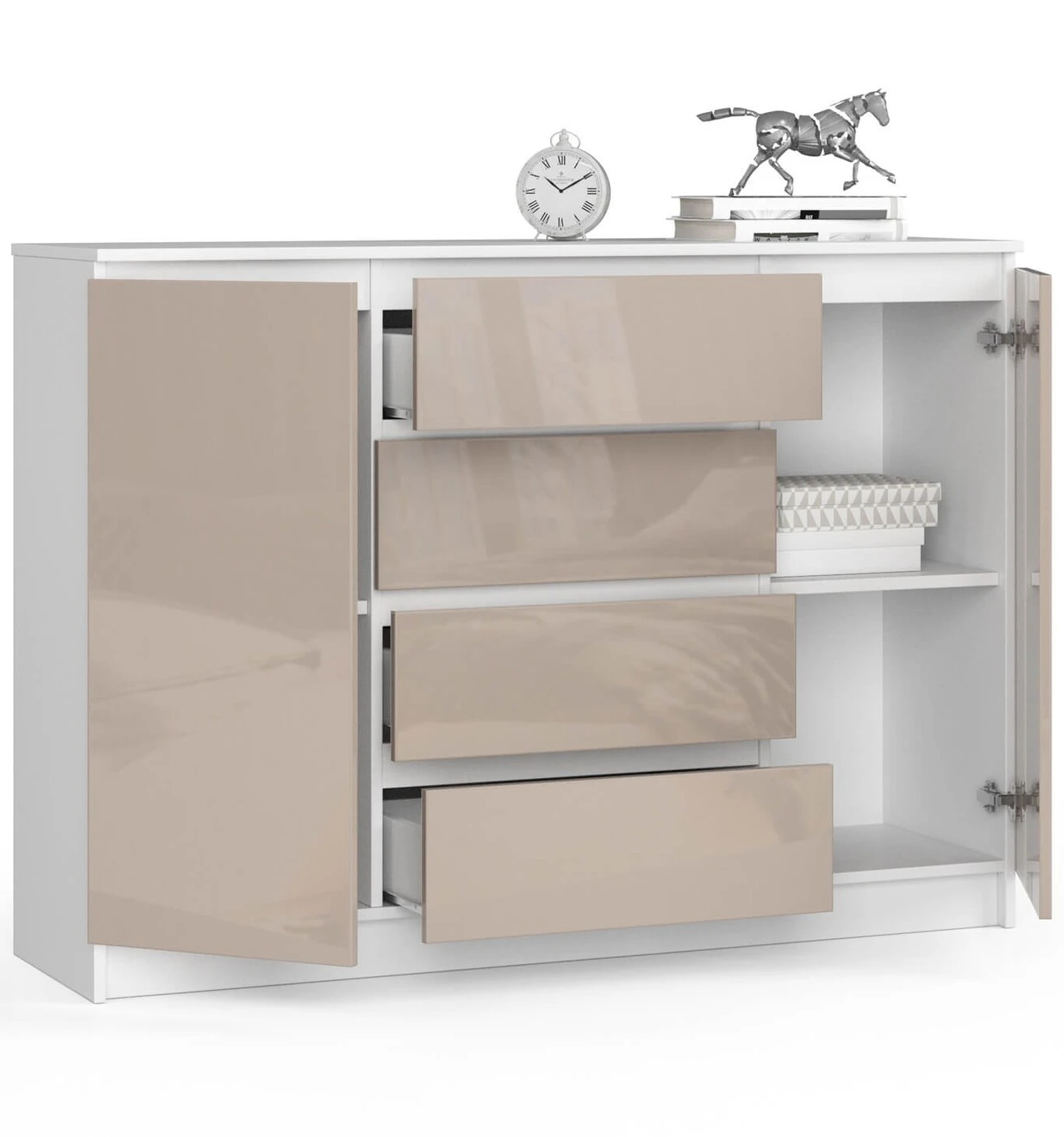 Aprašymas buvo automatiškai išverstas, gali pasitaikyti klaidų. Didelė ir erdvi, moderniu dizainu pasižyminti komoda tikrai patiks žmonėms, norintiems sekti tendencijas ir tuo pačiu ieškoti universalių sprendimų. Pristatomas komodos modelis buvo sukurtas naudojant 16 milimetrų storio laminuotą plokštę (balta pusiau matinė) ir 19 milimetrų storio plokštę AKRYL dekoro CAPPUCCINO (labai blizgi). Šis baldas puikiai tiks biure, tiks ir gyvenamosiose patalpose – svetainėse, miegamuosiuose, valgomuosiuose, jaunimo kambariuose ir kituose šiuolaikiškuose interjeruose. Komodoje K140 yra keturi erdvūs stalčiai, taip pat dvi uždaros spintelės. Gražus ir tvirtai pagamintas gaminys yra prieinamas už konkurencingą kainą. Taip pat kviečiame peržiūrėti kitus šios serijos pasiūlymus. - Komoda iš aukštos kokybės 16 mm dilimui atsparios laminuotos plokštės, gamintojas Kronospan - Stalčių fasadai pagaminti iš laminuotos lentos - Stalčiai juda ant metalinių ritinėlių kreiptuvų - Kraštai padengti ABS briauna, kad būtų gerai apsaugota nuo pažeidimų - Kiekvienos durelės viduje yra po vieną lentyną - Savarankiškai surenkama komoda - Instrukcija pridedama - Garantija 24 mėn.