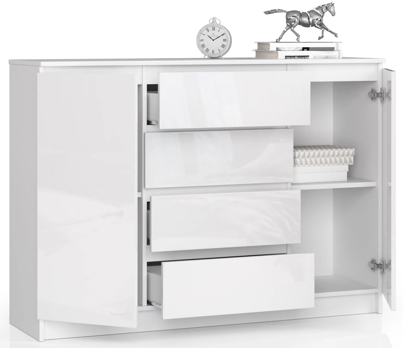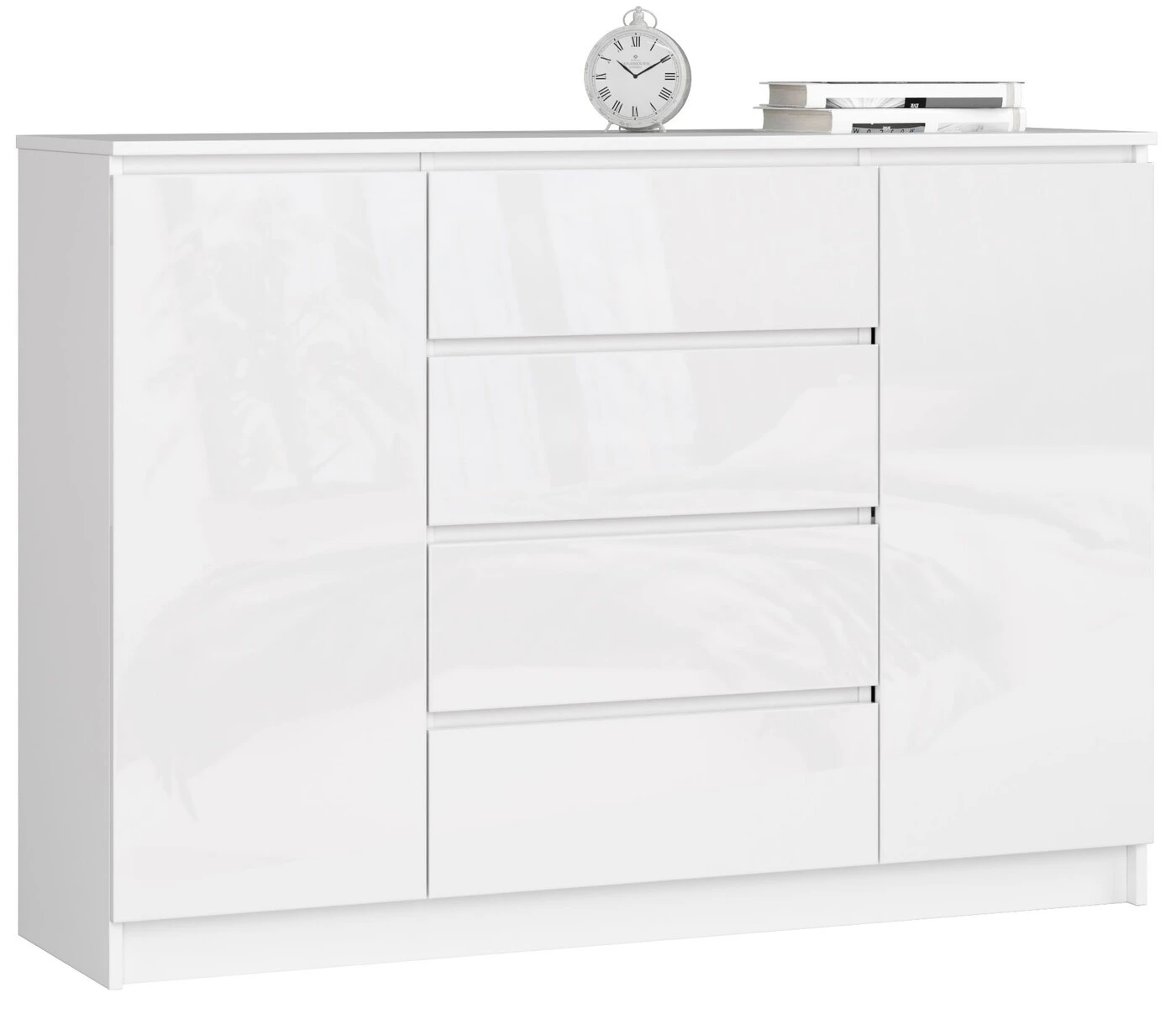 Aprašymas buvo automatiškai išverstas, gali pasitaikyti klaidų. Itin estetiškai pagaminta daili balta komoda tikrai puikiai atliks savo praktinę funkciją, o papildomai būtų efektyvus puošybos elementas daugelyje patalpų, pavyzdžiui, svetainėje, valgomajame, namų biure ar miegamajame. Baldai pasižymi nesenstančia baltos spalvos gama. Blizgūs fasadai gali teigiamai paveikti optinį erdvės padidinimą, todėl dažniausiai jie pasirenkami mažoms patalpoms. Komoda susideda iš dviejų uždarų spintelių ir keturių erdvių stalčių. Balduose dera paprastumas ir elegancija. Komoda pagaminta iš kokybiškos 16 mm storio laminuotos plokštės, atsparios trinčiai (gam. : Kronospan); Stalčių fasadai pagaminti iš laminuotos plokštės; Stalčiai yra ant metalinių ritinėlių kreiptuvų; Kraštai padengti ABS apvadu, kuris garantuoja aukštą apsaugą nuo pažeidimų; > Kiekvienos spintelės viduje yra po dvi lentynas; Komoda skirta montuoti savarankiškai, pridedama instrukcija ; Produktui taikoma 24 mėnesių garantija. Komoda K 140 cm. buvo pagamintas iš aukštos kokybės medžiagų, kurių dėka jis fantastiškai papildys bet kurią patalpą, kurioje bus naudojamas. Dėl patrauklaus kainos ir kokybės santykio tai labai populiarus produktas. Dėl savo išvaizdos, nesenstančių spalvų ir akrilo fasadų jis tinka daugybei skirtingų išdėstymų, todėl yra efektyvus ir kartu labai praktiškas baldas.