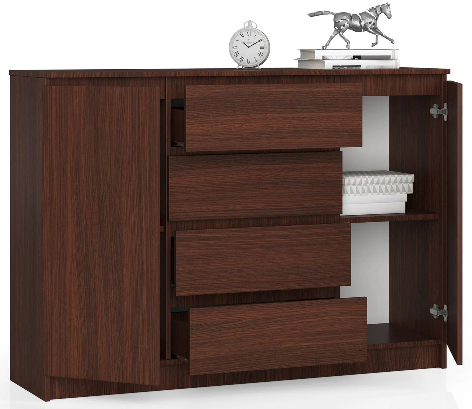 Aprašymas buvo automatiškai išverstas, gali pasitaikyti klaidų. Graži ir funkcionali – tai komoda K140. Jo skoninga spalva – wenge vis dar madinga – o ergonomiškas ir estetiškas dizainas paverčia baldu, kuris puikiai tiks miegamajame, svetainėje ar prieškambaryje. Puikiai apgalvotas komodos dizainas suteikia daug vietos daiktams susidėti. Dviejų spintelių su lentynomis ir keturių stalčių, judančių ant metalinių ritinėlių kreiptuvų, dėka jame tilps daug kasdienių daiktų, o ant erdvaus stalviršio puikiai atrodys šeimos suvenyrai, dekoracijos ar aksesuarai, kuriuos verta turėti po ranka. Medžiaga, iš kurios pagaminta pristatoma komoda, yra firmos Kronospan laminuota plokštė. Jis yra 16 mm storio ir itin atsparus dilimui. Jo matomos briaunos padengtos ABS briauna – šio metodo naudojimas leidžia baldams būti itin atspariems mechaniniams pažeidimams. Komoda K140 yra stabili, talpi ir lengvai valoma. Pristatomas baldas skirtas montuoti savarankiškai. Komplekte yra jo vadovas. „Akord“ internetinėje baldų parduotuvėje įsigytai komodai suteikiama 24 mėnesių garantija. - Komoda iš aukštos kokybės 16 mm dilimui atsparios laminuotos plokštės, gamintojas kronospan - Stalčių fasadai pagaminti iš laminuotos lentos - Stalčiai juda ant metalinių ritinėlių kreiptuvų - Kraštai padengti ABS briauna, kad būtų apsaugota nuo pažeidimų - Kiekvienoje viduje yra po vieną lentyną durys - Komoda, skirta savarankiškai surinkti - Instrukcija pridedama - Garantija 24 mėn.