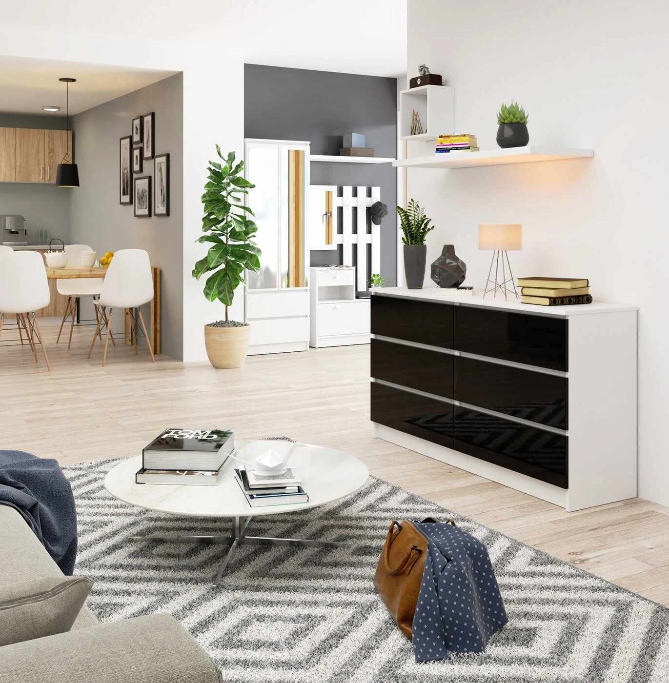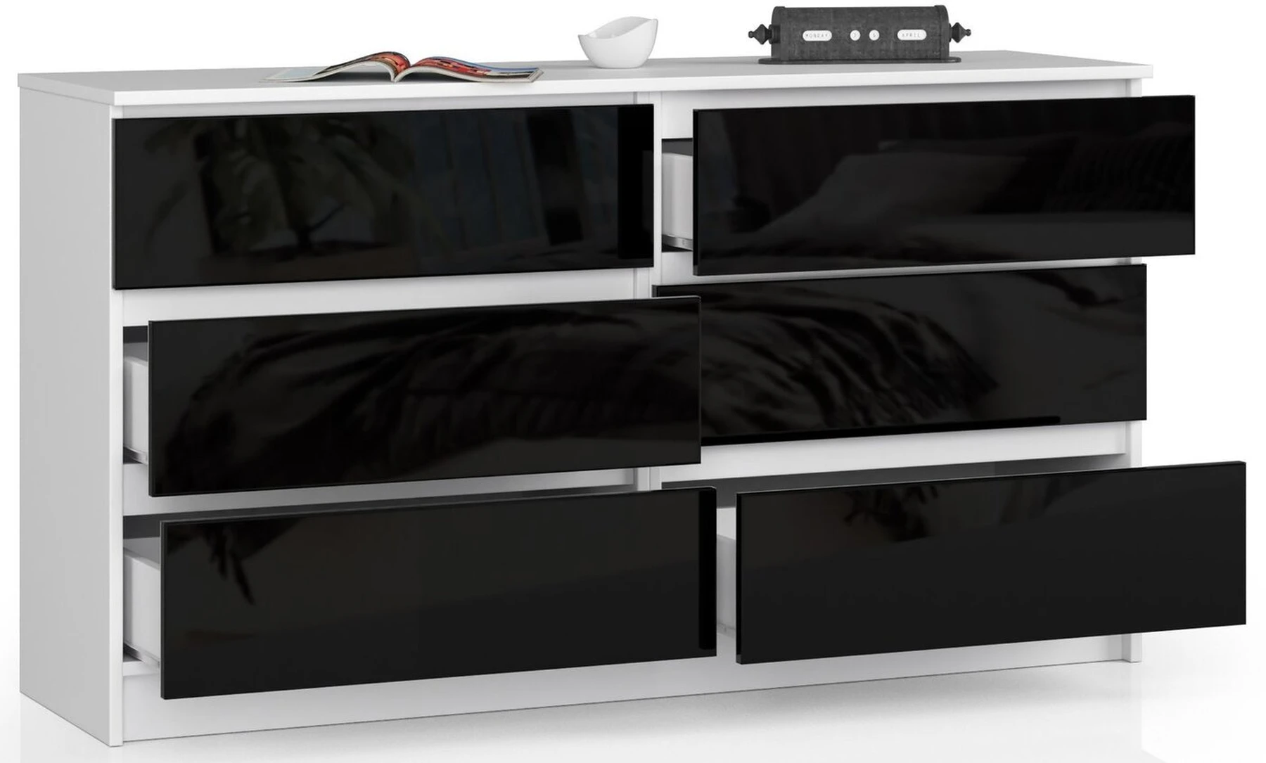 Aprašymas buvo automatiškai išverstas, gali pasitaikyti klaidų. – Komodos korpusas pagamintas iš laminuotos plokštės balto kilimėlio, atsparus dilimui 16 mm - Priekiniai skydai pagaminti iš 19 mm akrilo lentos su juodu blizgiu dekoru – Stalčiai juda ant metalinių ritinėlių kreiptuvų - Kraštai padengti ABS briauna, užtikrinančia aukštą apsaugą nuo pažeidimų - Savarankiškai surenkama komoda - Pristatyme pateikiamos instrukcijos - 24 mėnesių garantija