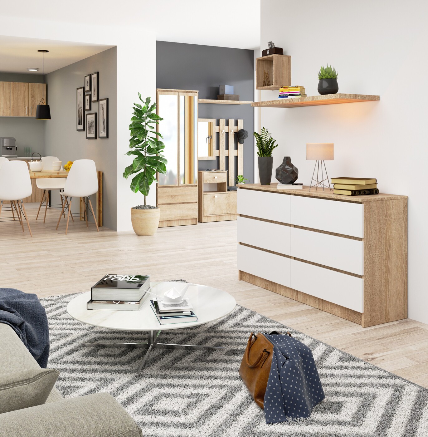 Aprašymas buvo automatiškai išverstas, gali pasitaikyti klaidų. Didelė komoda su šešiais stalčiais yra įdomus pasiūlymas, pagrįstas klientų poreikiais ir lūkesčiais, atsižvelgiant į naujausias išdėstymo tendencijas, pirmenybę teikiančių šviesiems, lengvai valomiems ir, svarbiausia, funkcionaliems baldams. Komoda K140 yra dviejų itin madingų spalvų – baltos ir sonomos ąžuolo – derinys. Baldai gali būti sėkmingai naudojami svetainėje, taip pat jaunimo ar svečių kambaryje. Jis taip pat tiks miegamajame, valgomajame ar biure. Būdingos siūlomo gaminio savybės yra patraukli kaina, tvirta konstrukcija ir kruopštus kokybiškų medžiagų apdirbimas. Erdvūs stalčiai gali lengvai sutalpinti viską, ko reikia tam tikroje patalpoje. Komoda džiugins ne tik praktiškumu, bet ir efektinga išvaizda, kuri pagyvins erdvę. - Komoda iš dilimui atsparios laminuotos plokštės - Stalčių fasadai pagaminti iš laminuotos plokštės - Stalčiai juda ant metalinių ritinėlių kreipiančiųjų - Kraštai padengti ABS briauna, kad būtų gerai apsaugota nuo pažeidimų - Savarankiškai surenkama komoda - Instrukcija pridedama - Garantija 24 mėn.