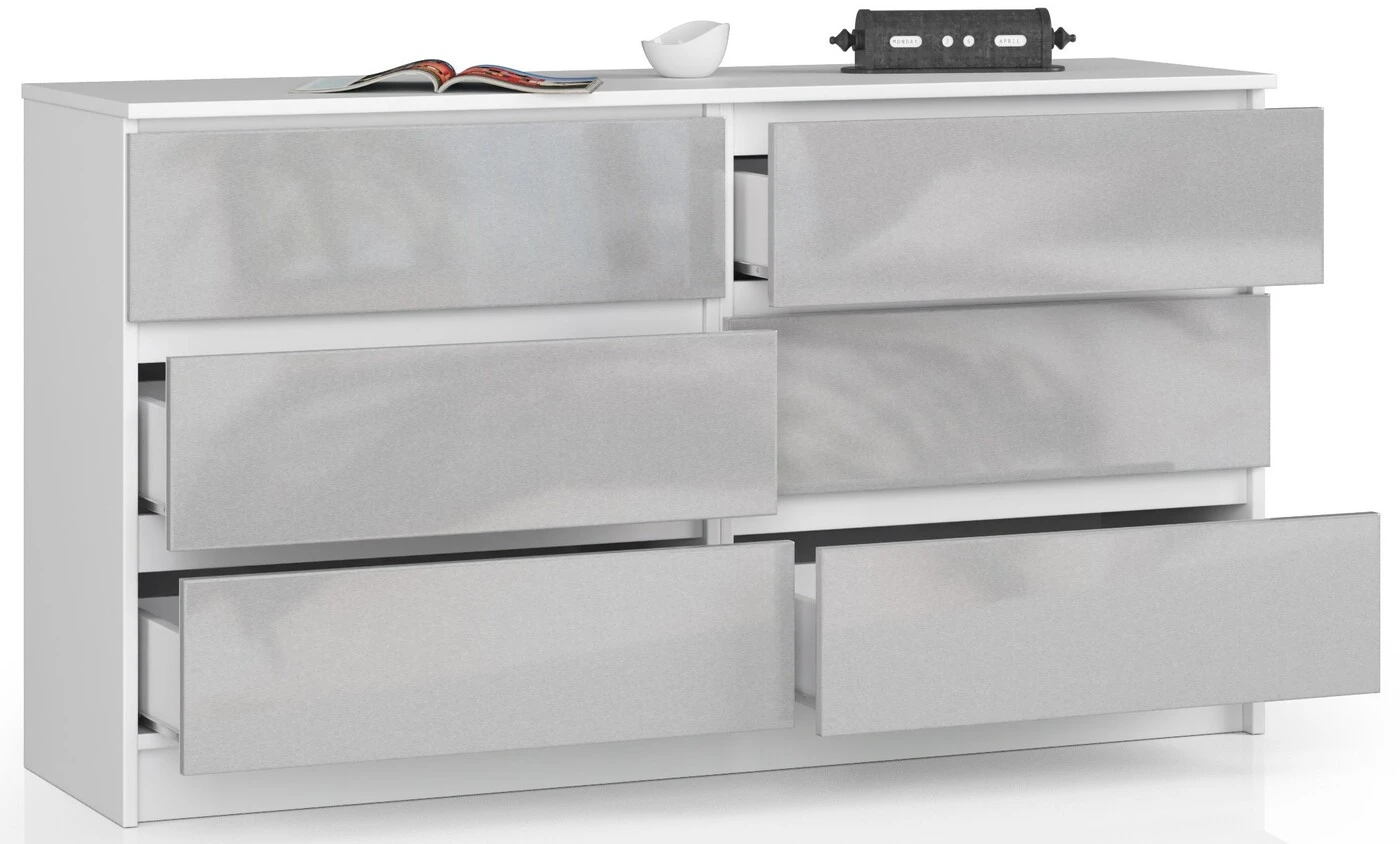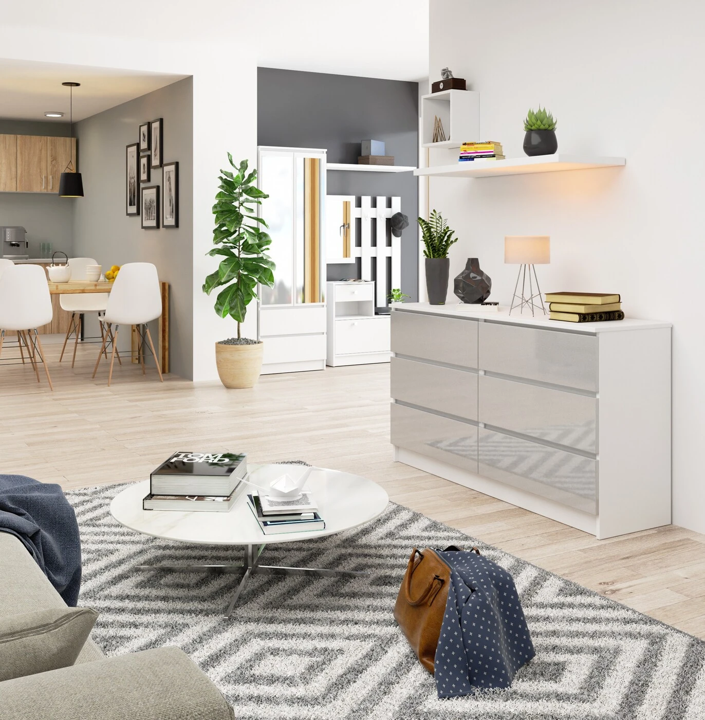 Aprašymas buvo automatiškai išverstas, gali pasitaikyti klaidų. – Komodos korpusas pagamintas iš laminuotos plokštės balto kilimėlio, atsparus dilimui 16 mm - Priekiniai skydai pagaminti iš 19 mm AKRYL plokštės su blizgiu metaliniu dekoru – Stalčiai juda ant metalinių ritinėlių kreiptuvų - Kraštai padengti ABS briauna, užtikrinančia aukštą apsaugą nuo pažeidimų - Savarankiškai surenkama komoda - Pristatyme pateikiamos instrukcijos - 24 mėnesių garantija