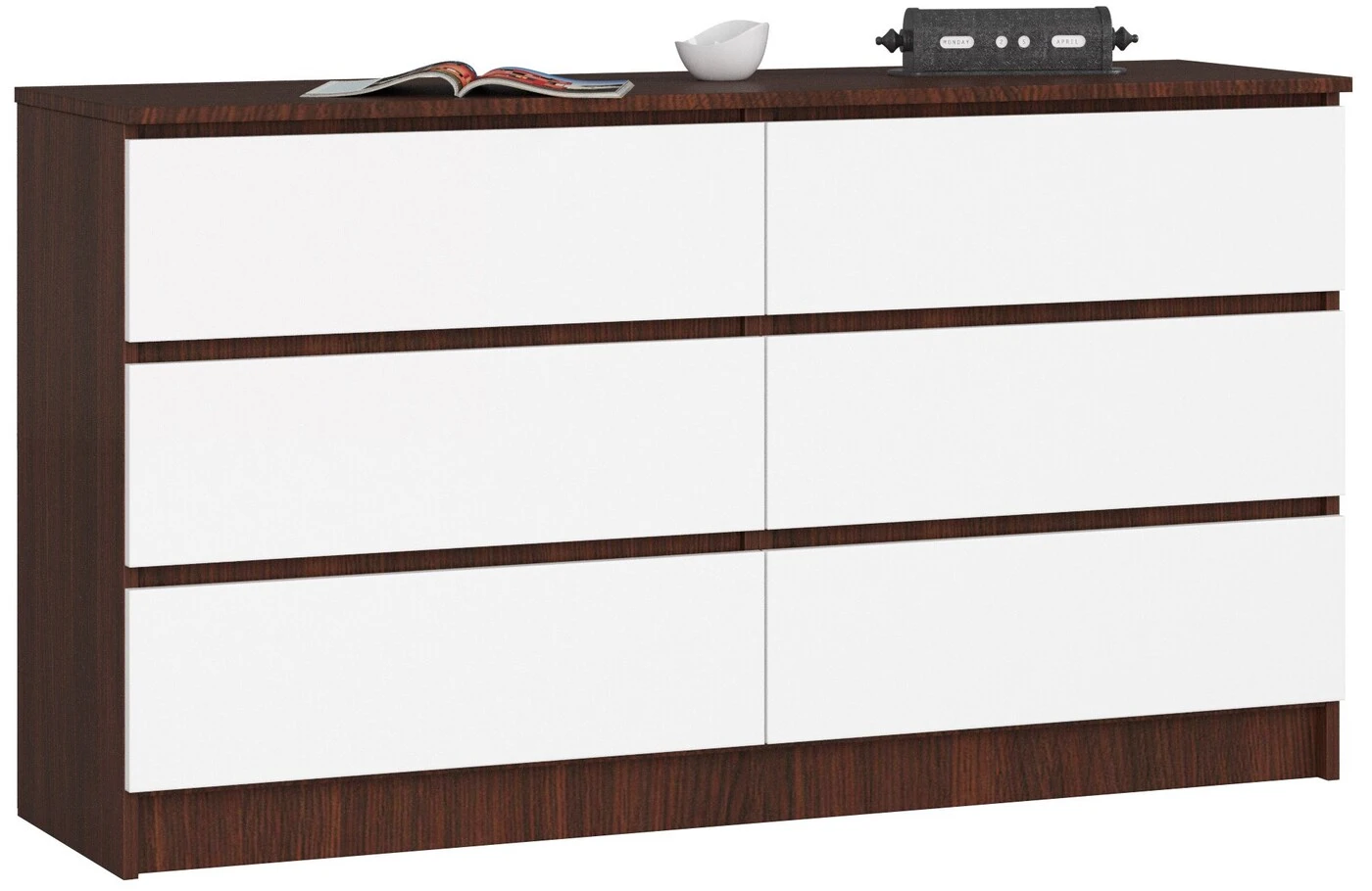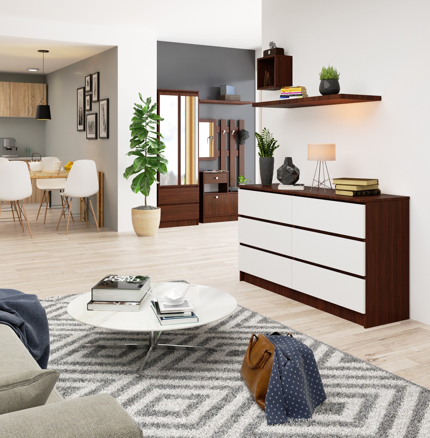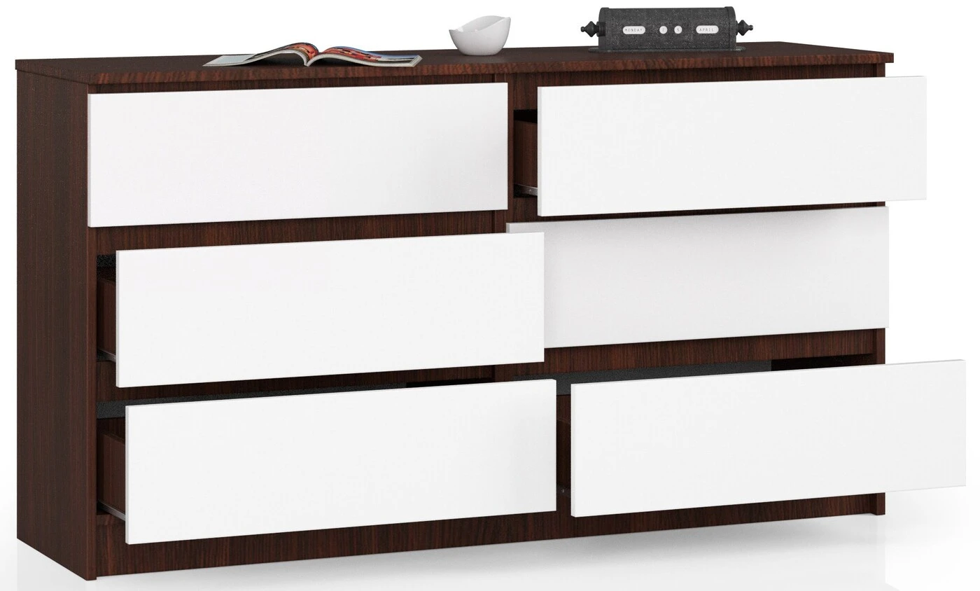 Aprašymas buvo automatiškai išverstas, gali pasitaikyti klaidų. Kiekvienas iš mūsų nori, kad jo interjeras atrodytų puikiai, būtų naudojami praktiški sprendimai, kurie sutaupys vietos ir bus funkcionalūs. Puikus pasiūlymas, kuris puikiai tiks miegamajame, vaikų kambaryje ar svetainėje – komoda K140, kurioje yra net 6 stalčiai. Dėl to gausite daug vietos, kurioje galėsite laikyti, pavyzdžiui, suvenyrus, apatinius. Komoda pagaminta iš 16 mm storio laminuotos plokštės, kuri yra labai atspari trinčiai ir pvz., skalbimo poveikiui. Galite būti tikri, kad jis jums tarnaus labai ilgai. Be to, kraštai buvo faneruoti ABS apvadu. Spintelės korpusas yra wenge spalvos, fasadai balti. Jo matmenys nėra labai dideli, o funkcionalumas užtikrinamas aukščiausiu lygiu. Matmenys: Ilgis - 138cm Aukštis - 77cm Gylis – 40 cm svoris – 54 kg Norėdami padidinti Stalčiai veikia ant metalinių ritininių kreiptuvų. Komoda buvo paruošta surinkti savarankiškai, tačiau ji turi labai paprastą vadovą. Produkto garantija yra 24 mėnesiai.