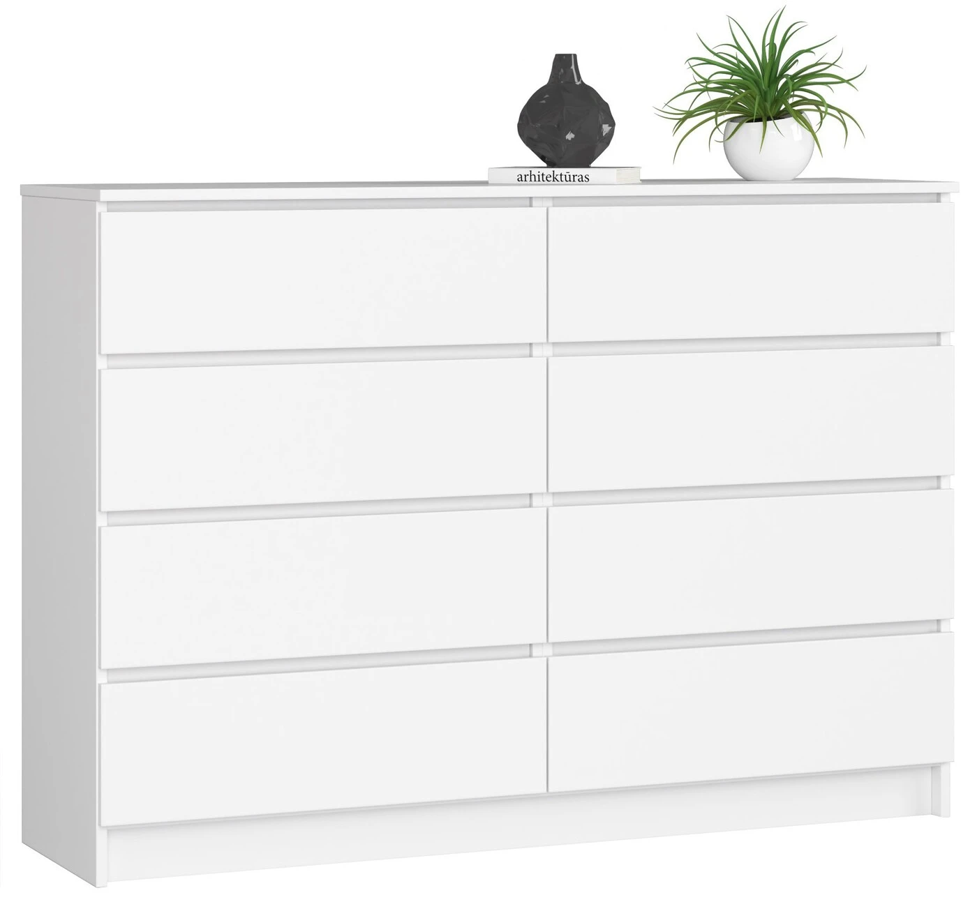 Aprašymas buvo automatiškai išverstas, gali pasitaikyti klaidų. Balta yra nesenstanti spalva, kuri nuolat mėgaujasi dideliu populiarumu tarp pirkėjų, vertinančių šviesų, jaukų interjerą. Be to, baltus baldus lengva valyti, o tai taip pat nusipelno dėmesio. Komoda K140 yra baltas baldas su aštuoniais stalčiais. Pažymėtinas skandinavišku modeliu sukurto gaminio paprastumas ir elegancija. Tokio tipo įranga puikiai atrodys daugelyje patalpų – tiek gyvenamųjų, tiek biurų – kasdien, džiugindama naudojimo laisve ir funkcionalumu. Stalčiai lengvai išstumiami, todėl galėsite susidėti įvairius daiktus, o visa tai pagaminta iš geros kokybės medžiagų, pasižyminčių dideliu atsparumu galimiems įbrėžimams ir pažeidimams. Produktą galima įsigyti už puikią kainą. - Komoda pagaminta iš laminuotos plokštės, atspari dilimui - Stalčių fasadai iš laminuotos plokštės p> - Stalčiai yra ant metalinių ritinėlių kreiptuvų - Kraštai padengti ABS briauna, kad būtų gerai apsaugota nuo pažeidimų. - Savarankiškai surenkama komoda – Instrukcijos pridedamos – 24 mėnesių garantija