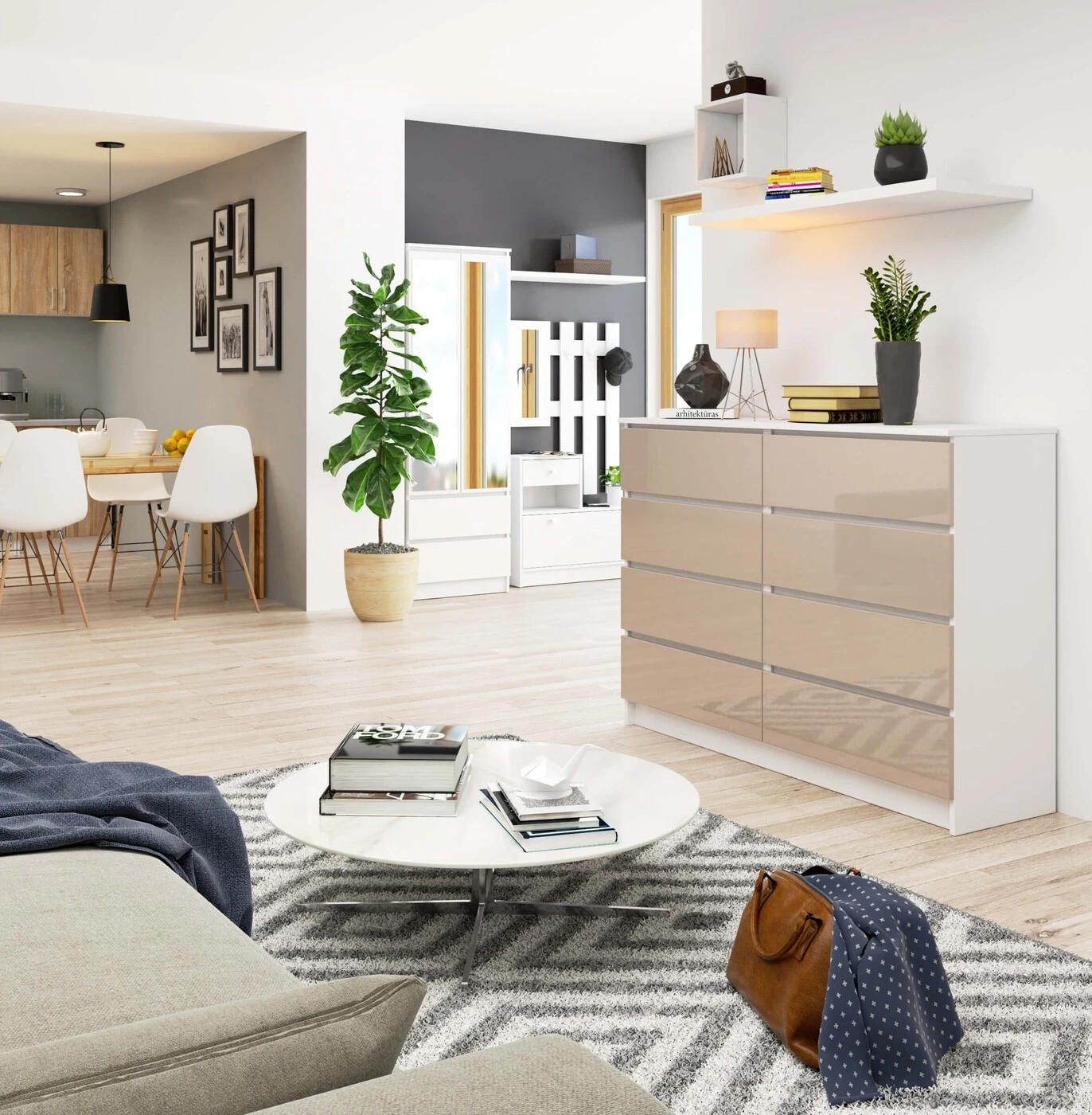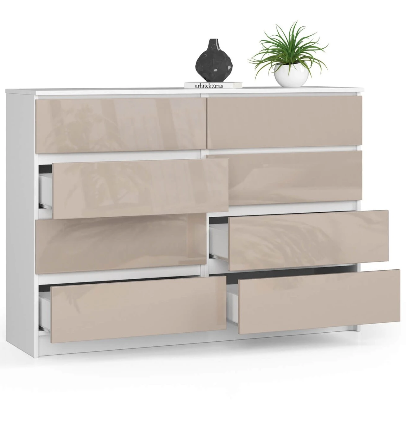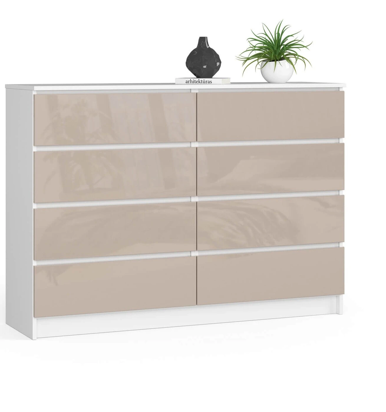 Aprašymas buvo automatiškai išverstas, gali pasitaikyti klaidų. Svetainės komoda, modelis K 140 cm – tai didelis baldas, savo naudotojams siūlantis itin funkcionalius sprendimus. Jame įrengti net 8 erdvūs stalčiai, o tai itin praktiška ir patogu. Kruopščiai apgalvotas dizainas sukuria patrauklias išdėstymo galimybes, o tai reiškia, kad ją galima pastatyti ne tik svetainėje, bet ir kitose patalpose, pavyzdžiui, miegamajame ar svečių kambaryje. Komoda atrodo labai įspūdingai, o tai dėl tobulai suderintų spalvų. Blizgūs kapučino spalvos fasadai puikiai dera su baltu baldo korpusu. Toks derinys atitinka dabartines interjero dizaino tendencijas, kurias įvertins kiekvienas vartotojas, vertinantis modernų ir neįprastą dizainą. Didelė balta / blizgi kapučino komoda yra puikus pasiūlymas interjerui dekoruoti įvairūs susitarimai. Toks įrangos elementas puikiai derės tiek prie modernaus, tiek prie kaimiško, skandinaviško ir glamūrinio stiliaus. Puikiai tinka ir mažiems plotams, nes baldo blizgesys vizualiai padidins patalpą. - Komodos korpusas pagamintas iš laminuotos plokštės balto kilimėlio 16mm atsparus trinčiai - Priekinės dalys pagamintos iš 19 mm AKRYL plokštės su blizgiu CAPPUCCINO dekoru - Stalčiai juda ant metalinių ritinėlių kreiptuvų - Kraštai padengti ABS briauna, užtikrinančia aukštą apsaugą nuo pažeidimų - Savarankiškai surenkama komoda - Pridedama instrukcija - Garantija 24 mėn.
