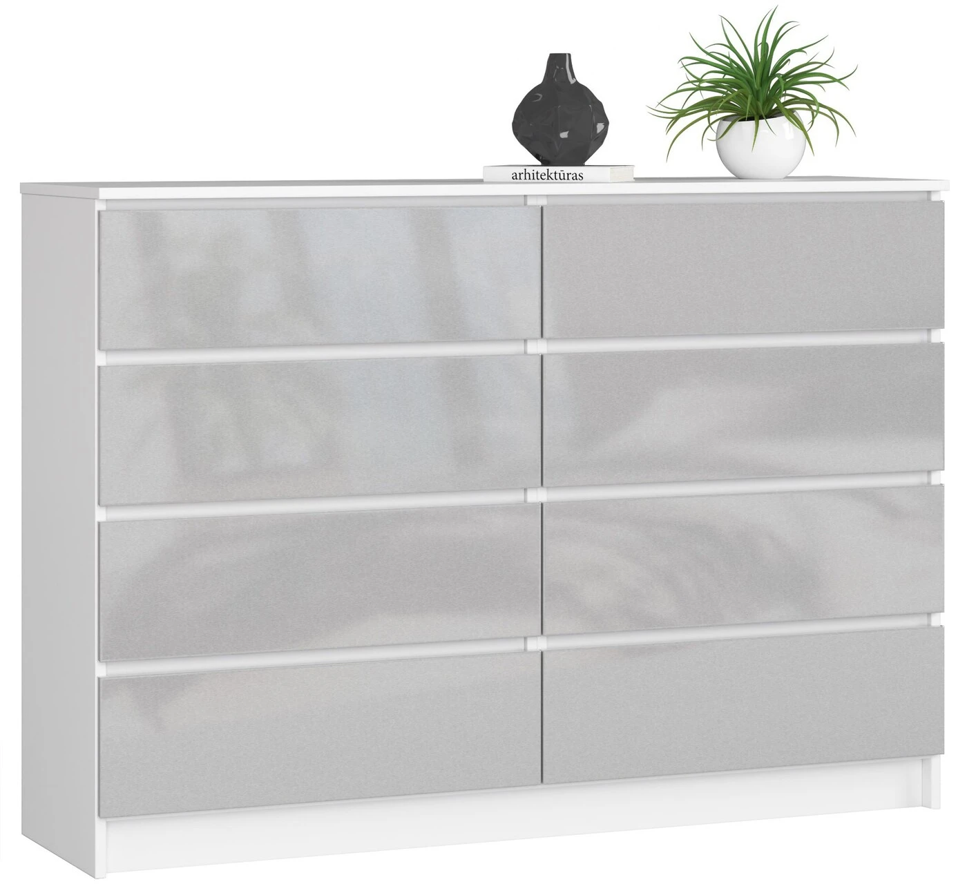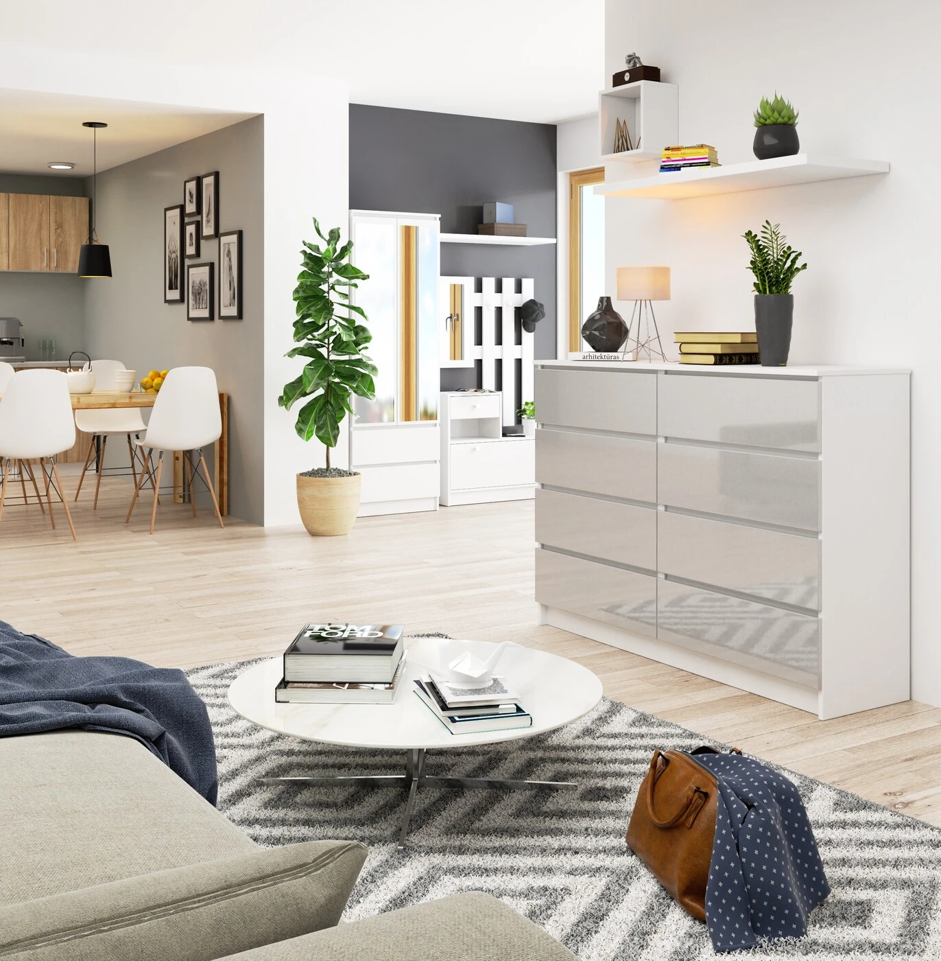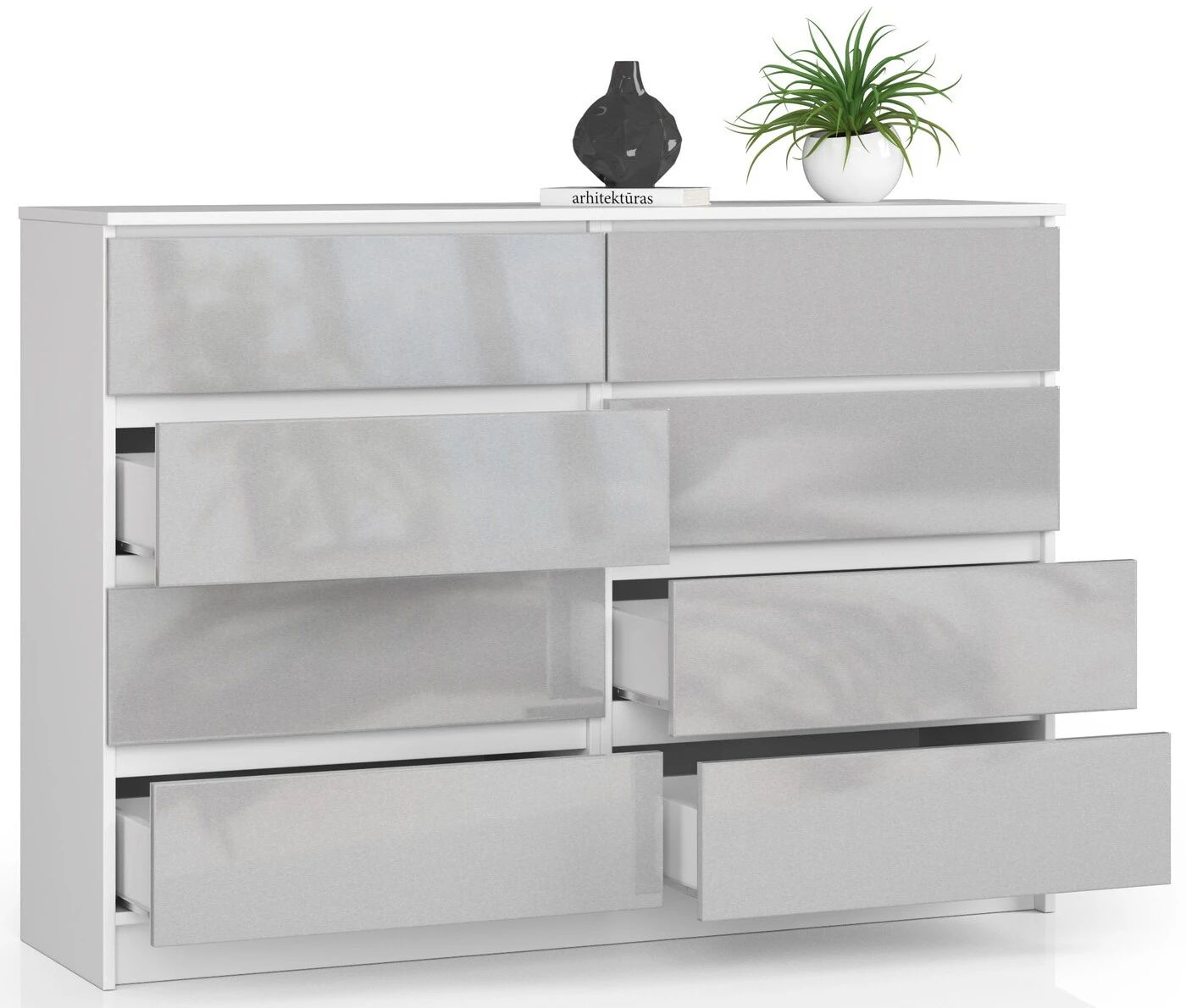 Aprašymas buvo automatiškai išverstas, gali pasitaikyti klaidų. – Komodos korpusas pagamintas iš laminuotos plokštės balto kilimėlio, atsparus dilimui 16 mm - Priekiniai skydai pagaminti iš 19 mm AKRYL plokštės su blizgiu metaliniu dekoru – Stalčiai juda ant metalinių ritinėlių kreiptuvų - Kraštai padengti ABS briauna, užtikrinančia aukštą apsaugą nuo pažeidimų - Savarankiškai surenkama komoda - Pristatyme pateikiamos instrukcijos - 24 mėnesių garantija