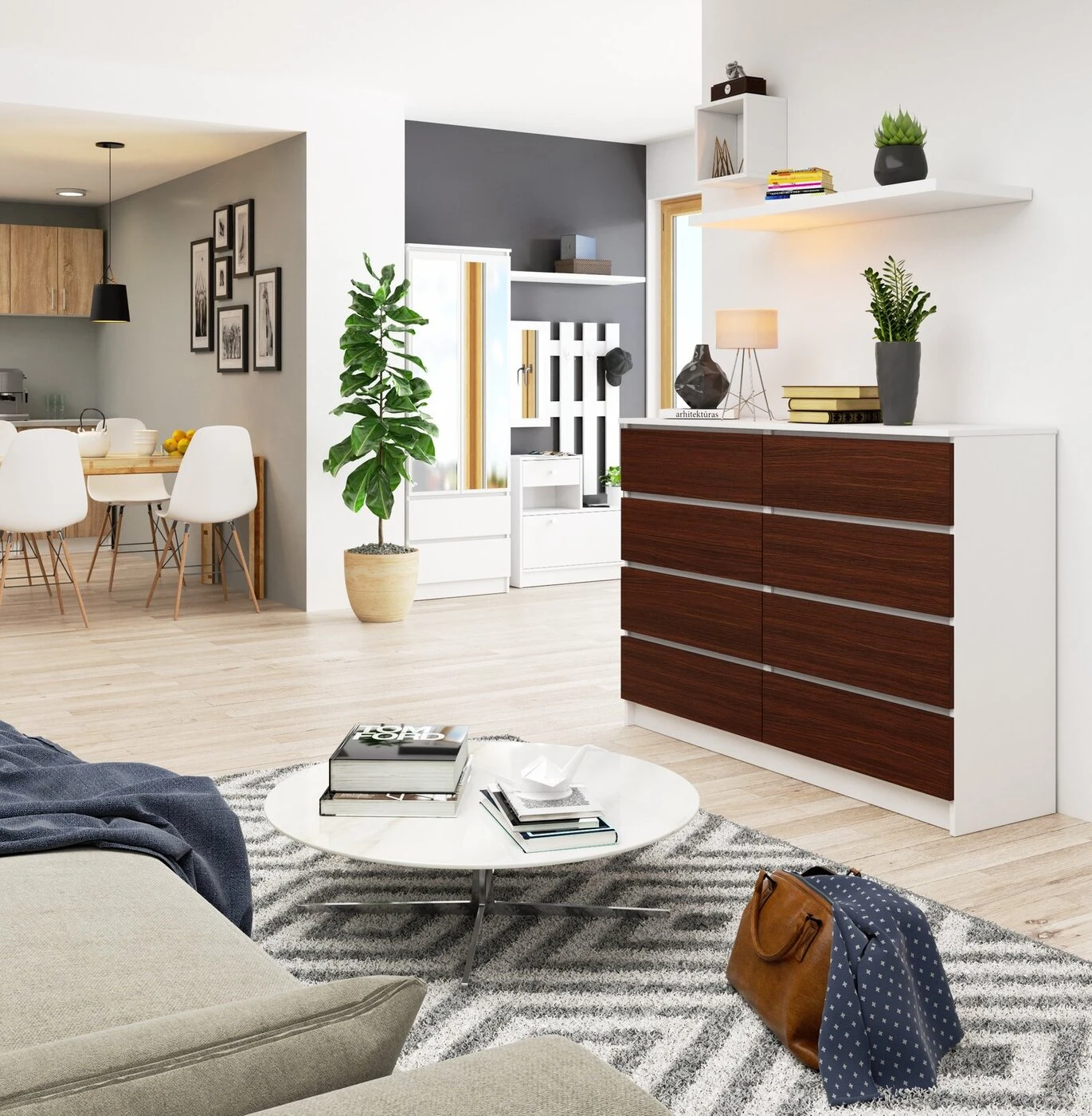 Aprašymas buvo automatiškai išverstas, gali pasitaikyti klaidų. - Komoda pagaminta iš trinčiai atsparios laminuotos plokštės - Stalčių fasadai iš laminuotos plokštės - Stalčiai eina ant metalinių ritinėlių kreiptuvų - Kraštai padengti ABS briauna, užtikrinančia aukštą apsaugą nuo pažeidimų - Savarankiškai surenkama komoda - Pristatyme pateikiamos instrukcijos – 24 mėnesių garantija