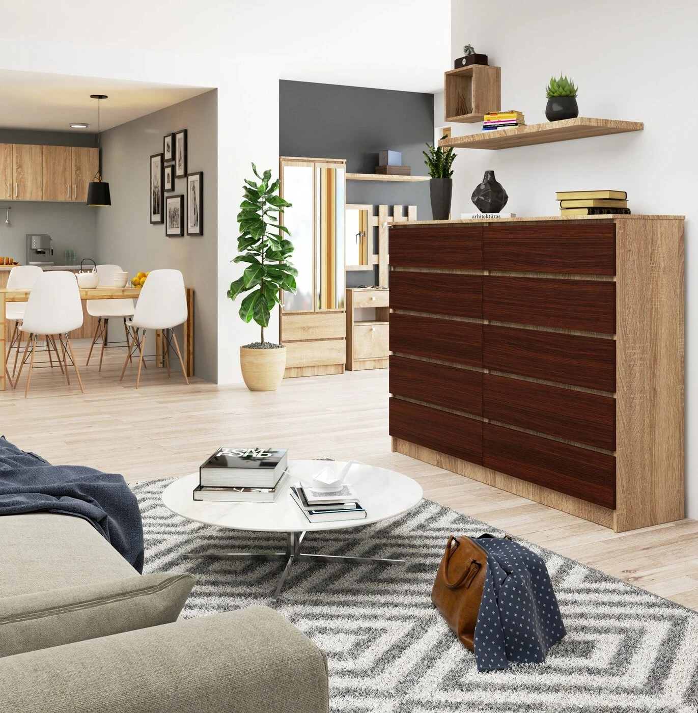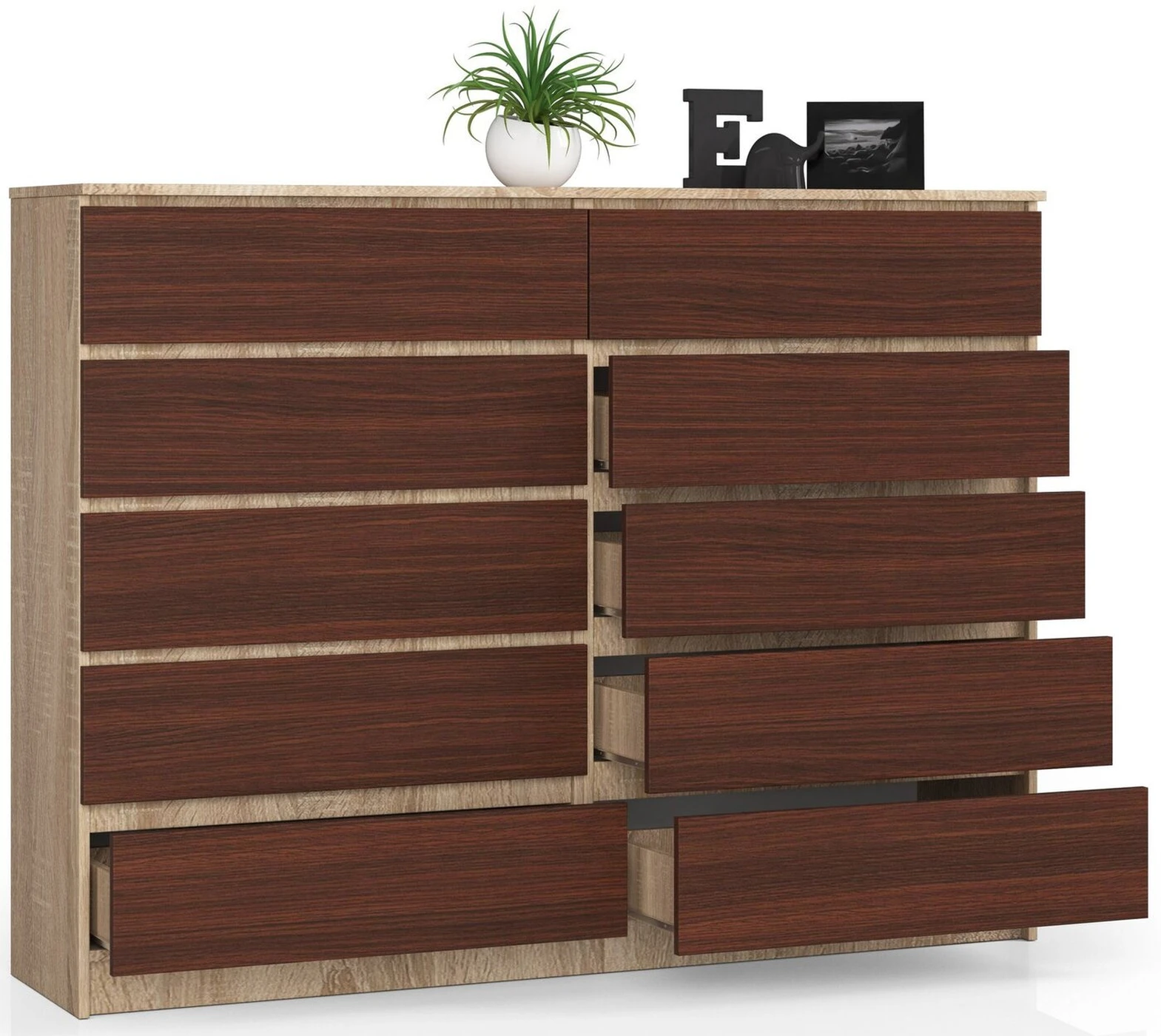 Aprašymas buvo automatiškai išverstas, gali pasitaikyti klaidų. Žmonėms, norintiems rasti didelį ir erdvų baldą, kuriame tilptų kuo daugiau daiktų, pristatyta komoda tikrai patiks. Jame naudojami du madingi, lengvai valomi atspalviai – sonoma ąžuolas ir venge. Tai puikiai tarpusavyje derančios spalvos, kurių dėka visuma dera prie bet kokio interjero. Be vizualinių vertybių, mūsų pasiūlyme esantis įrangos elementas taip pat pasižymi puikia kokybe ir funkcionalumu. Komoda gali būti naudojama svetainėje, miegamajame, darbo kambaryje, jaunimo kambaryje ar bet kuriame kitame interjere, kuriame puikiai tiks 160 centimetrų pločio baldas, susidedantis net iš dešimties erdvių stalčių. Tai idealus produktas tiems, kurie vertina gerą kainos ir kokybės santykį. - Komoda iš dilimui atsparios laminuotos plokštės - Stalčių fasadai Pagaminta iš laminuotos plokštės - Stalčiai juda ant metalinių ritinėlių kreiptuvų - Kraštai padengti ABS briauna, užtikrinančia aukštą apsaugą nuo pažeidimų - Savarankiškas surinkimas komoda - Instrukcija pridedama - Garantija 24 mėn.