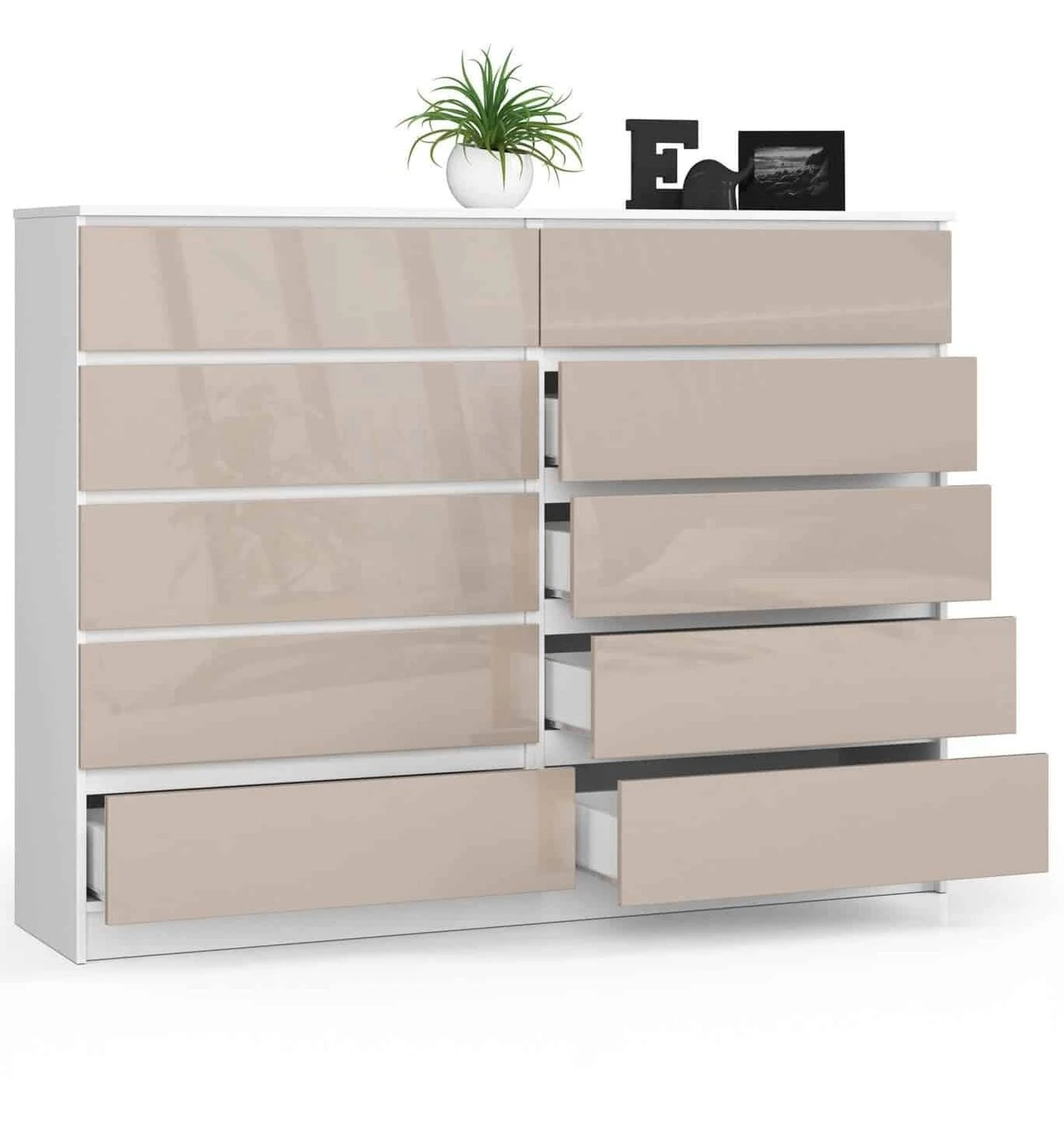 Aprašymas buvo automatiškai išverstas, gali pasitaikyti klaidų. - Komodos korpusas pagamintas iš laminuotos plokštės balto kilimėlio, atsparus dilimui 16 mm - Fasadas pagamintas iš MDF cappuccino blizgus - Stalčiai juda ant metalinio volelio kreiptuvai - Kraštai padengti ABS briauna, kad būtų užtikrinta aukšta apsauga nuo pažeidimų - Savarankiškai surenkama komoda - Pridedamos instrukcijos – 24 mėnesių garantija