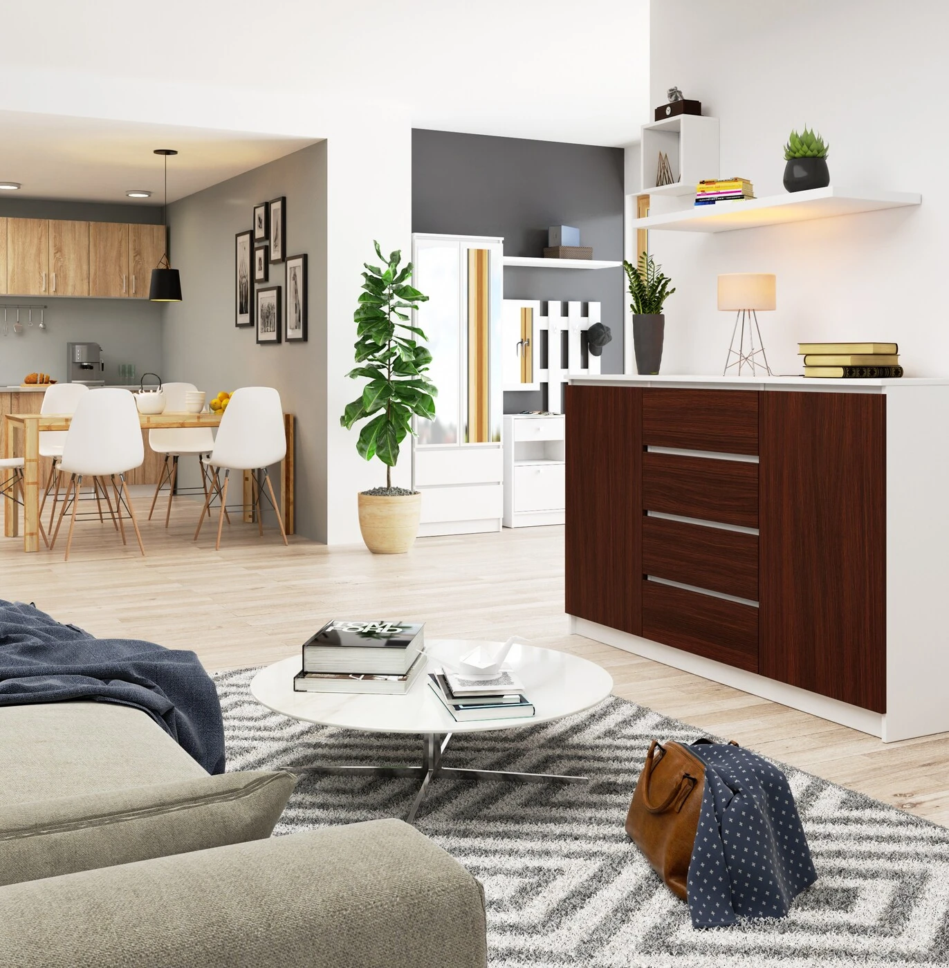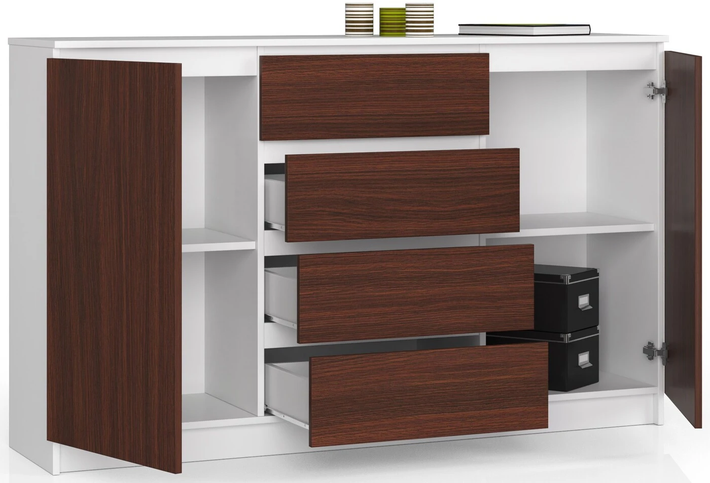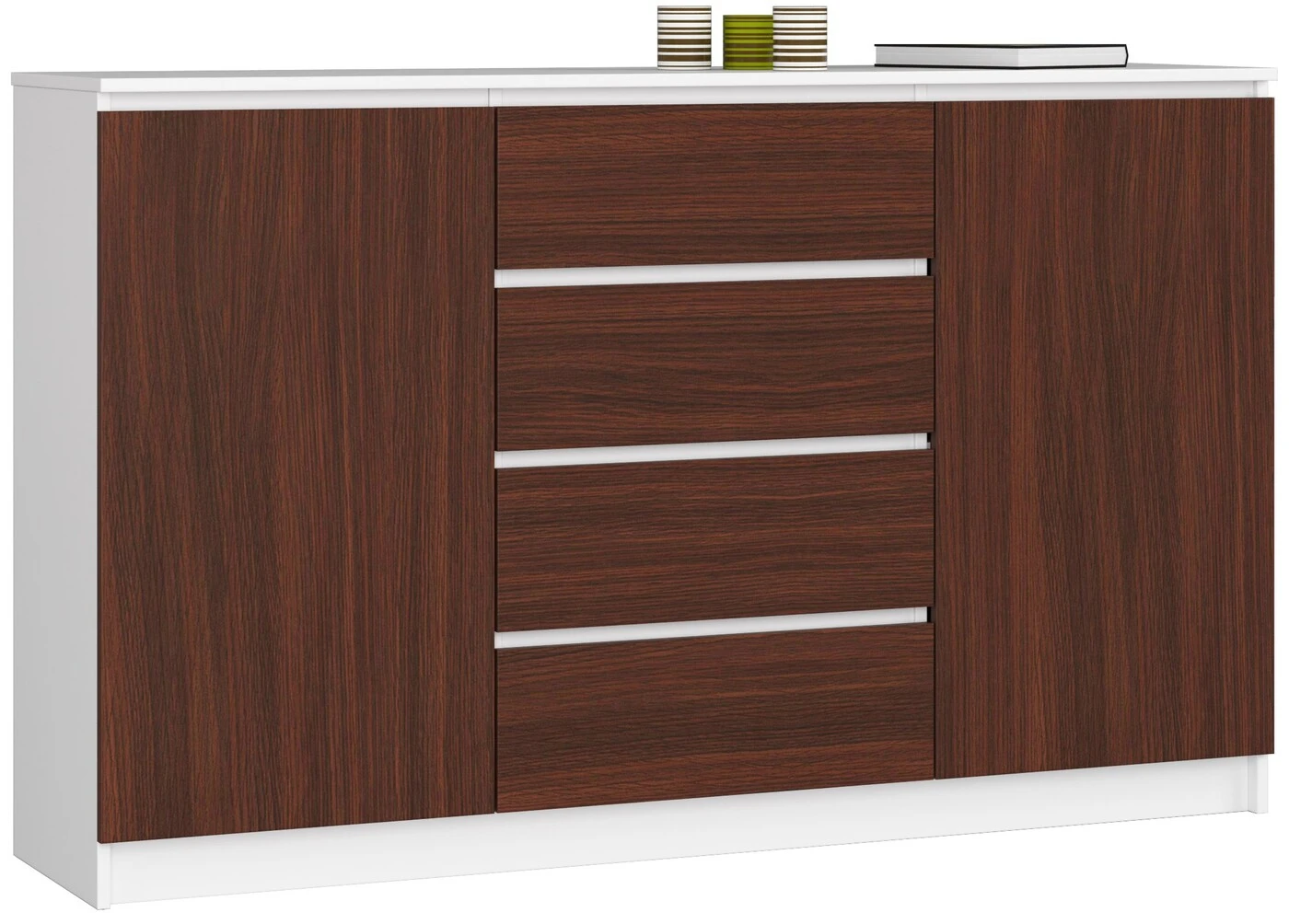Aprašymas buvo automatiškai išverstas, gali pasitaikyti klaidų. Komoda K 160 cm su 2 durelėmis ir 4 stalčiais bei venge atspalvio fasadais puikiai papildys svetainės ar miegamojo išdėstymą. Erdvios komodos leidžia patogiai susidėti mums reikalingus kasdienius daiktus, kurių dėka namuose išlaikysime tvarkingumą Komodos gali būti naudojamos praktiškai kiekvienuose namuose ar butuose. Pagrindiniai šio tipo komodų privalumai: pagamintas iš aukštos kokybės laminuotos plokštės, atsparios trinčiai ir mechaniniams pažeidimams; komodos krašto apvyniojimas ABS apvadu, kuris papildomai apsaugo ją nuo pažeidimų; patogiai naudojami stalčiai, nes jie yra ant metalinių ritinėlių kreiptuvų; li> elegantiška vieno iš madingiausių wenge atspalvių laminuotų plokščių fasadų išvaizda. Komodos klientui pristatomos formoje skirti montuoti savarankiškai, o aukšta medžiagų kokybė ir kruopštus darbas, atkreipiant dėmesį į smulkiausias detales, leidžia patenkinti net išrankiausius klientus. Komoda K 160 cm su 2 durelėmis ir 4 stalčiais bei fasadais venge atspalvyje gali būti svetainės, valgomojo ar miegamojo įrangos elementas, kuriame galėsite susidėti rankšluosčius, patalynę ar kitų rūšių tekstilės gaminius bei smulkūs daiktai, kuriuos norite laikyti vienoje vietoje. Puikiai tiks tiek klasikiniame, tiek skandinaviškame interjere, nes bus praktiškas, visapusiškai funkcionalus ir elegantiškas išdėstymo elementas. Verta pagalvoti apie jų įsigijimą, jei namuose ar bute trūksta baldų, leidžiančių patogiai laikyti.