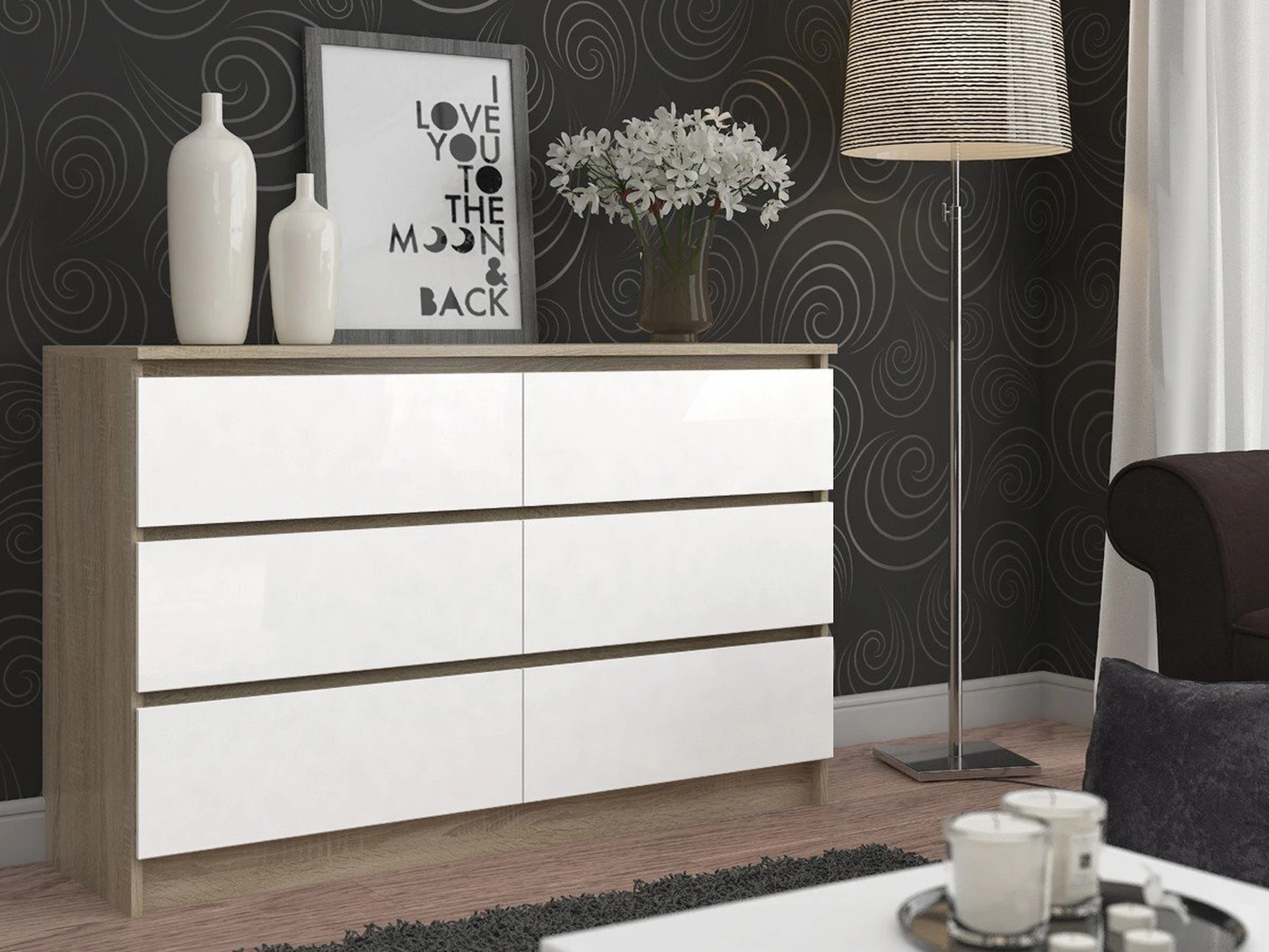 Aprašymas buvo automatiškai išverstas, gali pasitaikyti klaidų. Būtina turėti kiekvienuose namuose, leidžianti kompaktiniuose diskuose laikyti daugybę aksesuarų, drabužių, net batų ir filmų. Naudojamas įvairiais būdais, kas tai? Žinoma, komoda yra geriausia, jei ji yra erdvi, tačiau išlaikoma maža. Kaip tik turime jums tokį pasiūlymą. K 160 cm modelio ilgis yra toks, apie kurį ką tik rašėme. Jis buvo pagamintas iš 16 milimetrų pločio laminuotos plokštės, o tai reiškia didelį atsparumą bet kokiems mechaniniams pažeidimams. Papildomas privalumas ir ilgaamžiškumo garantija yra ABS briaunų naudojimas kraštuose. Komodos viduje yra 6 didelės talpos stalčiai visoms jūsų prekėms. Komoda pasižymi gražia apdaila. Čia buvo naudojamas modernus spalvų derinys, apimantis sonomos ąžuolą ir baltą. Tokia kompozicija bus geras pasirinkimas šviesiems ir erdviems interjerams. Puikiai tiks svetainėje, kaip televizoriaus spintelė, taip pat miegamajame kaip apatinių ar drabužių vieta. Pavyzdys yra 160 centimetrų ilgio, modelio aukštis – 77 centimetrai, o gylis – lygiai 40 centimetrų. Dėl lygaus paviršiaus komodą lengva valyti. - Pagaminta iš laminuotos, atsparios dilimui atsparios plokštės - ABS apvadai, apsaugantys nuo pažeidimų - stalčiai, einantys ant metalinių ritinėlių kreiptuvų - nepriklausomas, bet gana paprastas surinkimas - instrukcijos įtrauktos į komplektą surinkimo procesas - 24 mėnesių garantija.