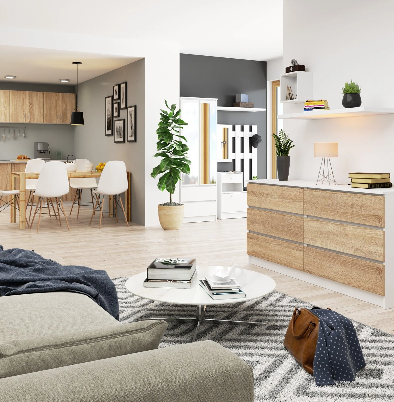 Aprašymas buvo automatiškai išverstas, gali pasitaikyti klaidų. Įsitikinkite, kad savo svetainę sutvarkote kuo geriau ir tuo pat metu sutvarkykite ją estetiškai. Tam jums padės mūsų parduotuvės komoda, kurios spalva yra balta / sonoma. Jis pagamintas iš aukščiausios kokybės laminuotos plokštės, kuri papildomai parodo atsparumą dilimui. Be to, komoda aprūpinta ABS apvadu, užtikrinančiu apsaugą nuo pažeidimų. Mūsų parduotuvės pasiūlyme esanti komoda – tai nepaprasto universalumo baldas. Tinka tiek pagal industrinį stilių įrengtiems salonams, tiek ir labiau klasikiniams. Taip pat puikiai tinka kaimiškam ar skandinaviškam interjerui. Verta pridurti ir tai, kad komodoje sumontuoti net šeši stalčiai, einantys ant kokybiškų metalinių ritinėlių kreiptuvų. Šį baldą nesunkiai sumontuosite patys. Be to, komoda turi ir kitų funkcijų, tokių kaip: - 24 mėnesių garantinis laikotarpis, - instrukcija pridedama prie pristatymo, – spinta tinkama montuoti atskirai.