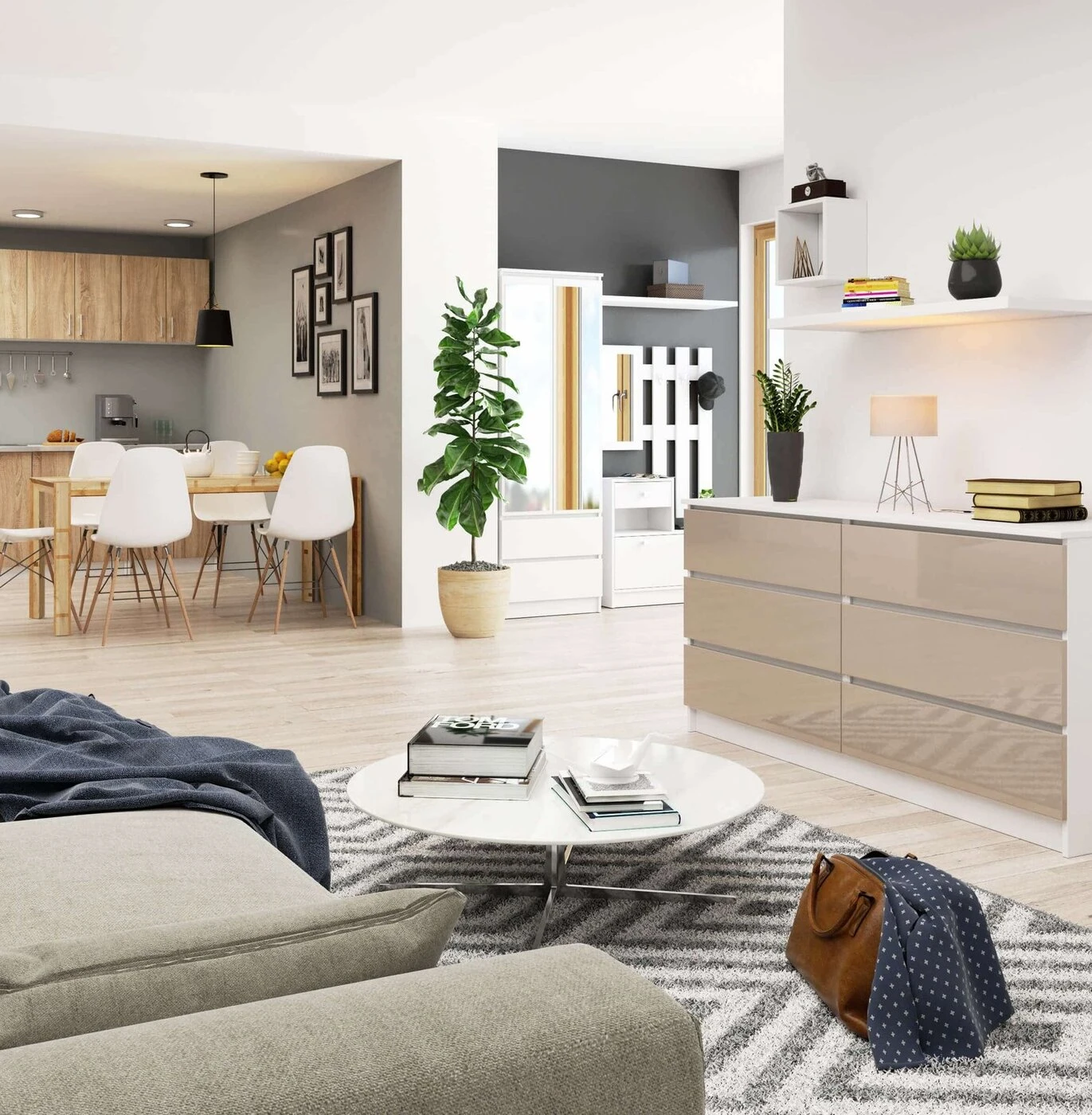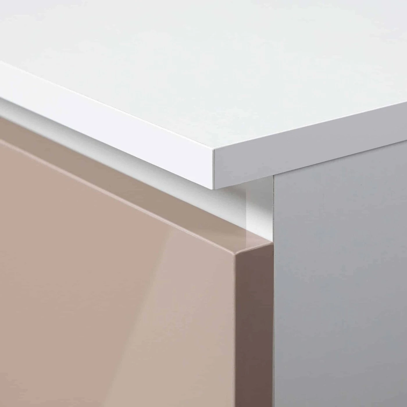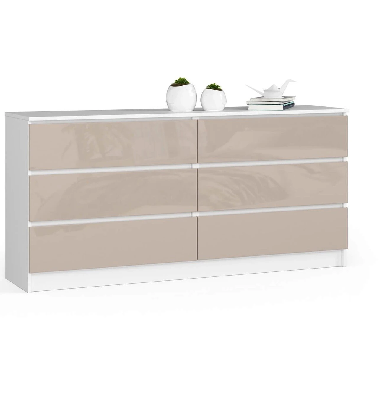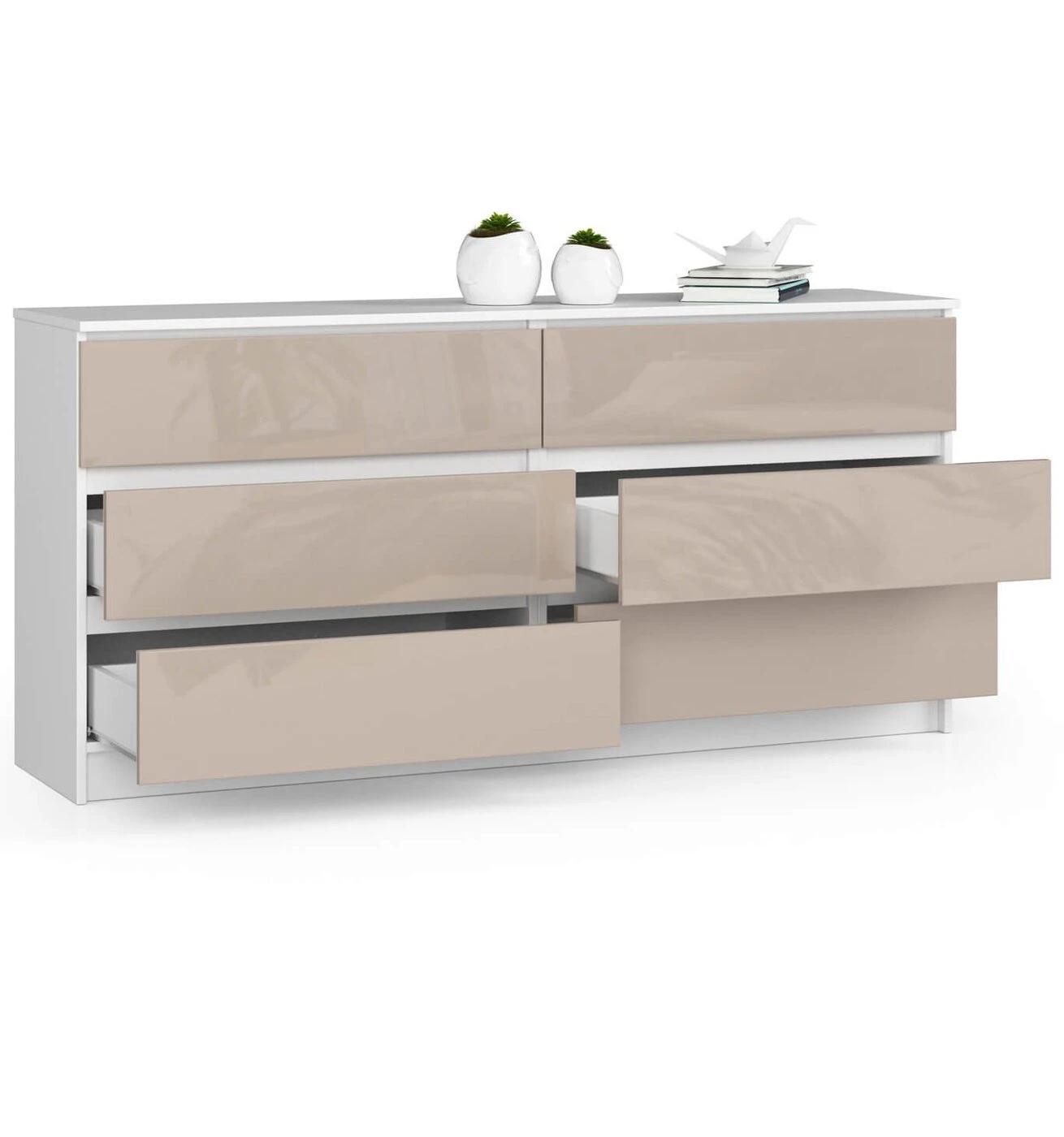 Aprašymas buvo automatiškai išverstas, gali pasitaikyti klaidų. - Komodos korpusas pagamintas iš laminuotos plokštės baltos matinės 16 mm atsparios trinčiai - Priekinės dalys pagamintos iš 19 mm AKRYL plokštės su blizgiu kapučino dekoru - Stalčiai juda ant metalinių bėgelių ritinėlių - Kraštai padengti ABS briauna, užtikrinančia aukštą apsaugą nuo pažeidimų - Savarankiškai surenkama komoda - Pateikta instrukcija – 24 mėnesių garantija