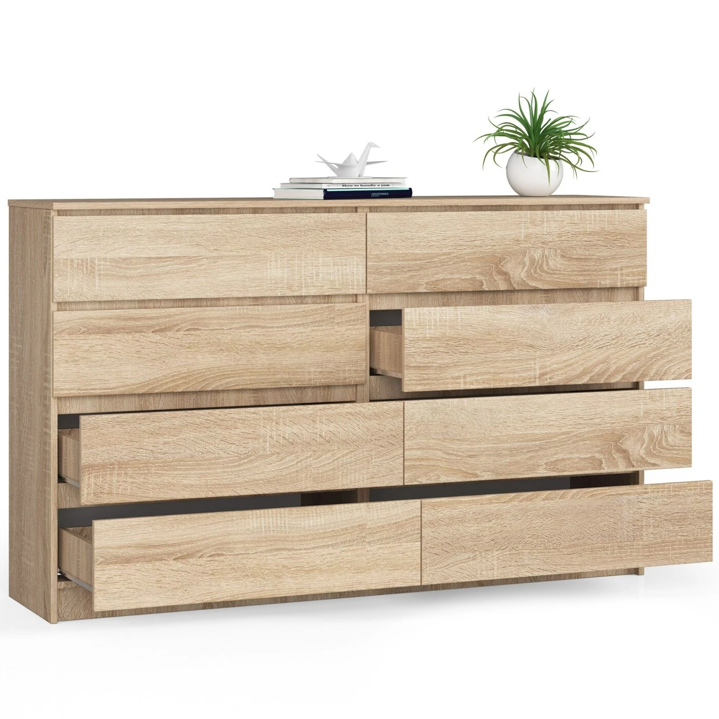 Aprašymas buvo automatiškai išverstas, gali pasitaikyti klaidų. Komoda K 160 cm sonoma ąžuolas išsiskiria šiltomis spalvomis su natūralaus medžio raštu. Dėl to jis puikiai dera prie madingiausių interjero tendencijų, tokių kaip skandinaviškas, klasikinis ar kaimiškas stilius. Natūrali medžio spalva puikiai dera tiek prie šviesių, tiek prie tamsių baldų, tokių kaip sienos, grindys, sofos, pagalvėlės ir kiti dekoratyviniai elementai. Sonoma ąžuolinė komoda skirta visiems, vertinantiems derinį komforto ir funkcionalumo. Tai atsispindi dizaine, susidedančiame iš net 8 plačių ir gilių stalčių. Šis sprendimas labai praktiškas, nes jame galima paslėpti didelius spintos daiktų kiekius ir taip sutaupyti daug vietos spintoje. Svetainė ir miegamasis yra puikios vietos ąžuolinei sonomai moteriškos kelnaitės. Jis puikiai atlieka savo funkcinę funkciją ir tuo pačiu suteikia patalpoms draugišką klimatą. Baldą galima naudoti ir kitose patalpose, nes puikiai tiks visur. - Komodos korpusas pagamintas iš laminuotos plokštės sonoma ąžuolas 16mm atsparus trinčiai - Priekiniai skydai pagaminti iš laminuotos plokštės sonoma ąžuolo - Stalčiai juda ant metalinių ritinėlių kreiptuvų - Kraštai padengti ABS briauna, užtikrinančia aukštą apsaugą nuo pažeidimų - Savarankiškai surenkama komoda - Instrukcija pridedama - Garantija 24 mėn.