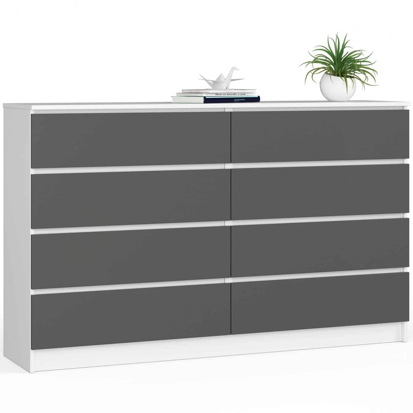 Aprašymas buvo automatiškai išverstas, gali pasitaikyti klaidų. - Komodos korpusas pagamintas iš laminuotos plokštės balto kilimėlio 16mm atsparus trinčiai - Fasadai iš MDF plokštės pilko grafito - Stalčiai juda ant metalo ritininiai kreiptuvai - Kraštai padengti ABS briauna, užtikrinančia aukštą apsaugą nuo pažeidimų - Savarankiškai surenkama komoda - Pridedamos instrukcijos – 24 mėnesių garantija