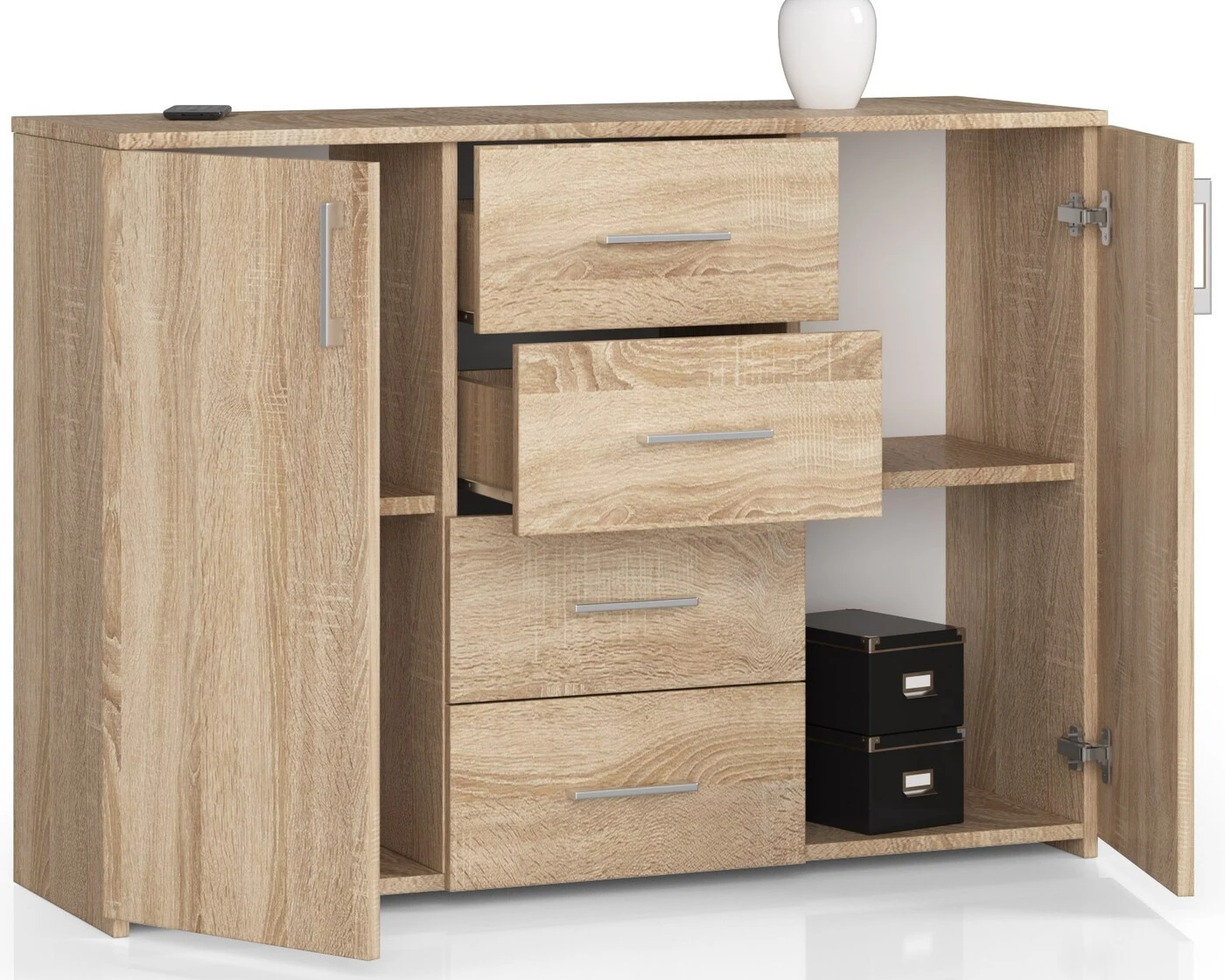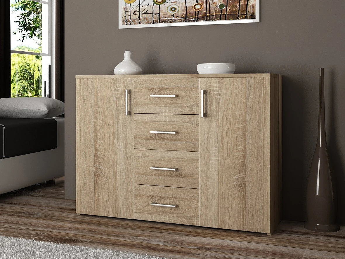 Aprašymas buvo automatiškai išverstas, gali pasitaikyti klaidų. Komoda svetainei, miegamajam ar net prieškambariui iš laminuotos plokštės, atspari dilimui. Kur jis bus pastatytas, priklauso nuo vartotojo pageidavimų ir vidaus apdailos. Šiame pasiūlyme rekomenduojame Sonoma Oak spalvos modelį. Ryškios spalvos pateisins visų šviesaus, erdvaus ir modernaus interjero savininkų lūkesčius. Komoda visiškai pagaminta iš laminuotos plokštės, kurios storis 16 milimetrų. Tai užtikrina ilgą ir be rūpesčių veikimą! - Komoda iš laminuotos plokštės - sonoma ąžuolo spalvos modelis - ABS apvadas - didesnis patvarumas ir atsparumas dilimui - kopija savaiminiam surinkimui - pridedama instrukcija Siūlomas modelis turi keturis stalčius konstrukcijos centre, judančius ant metalinių ritinėlių kreiptuvų. Dėl to jie atsidaro ir užsidaro tiksliai, lengvai ir švelniai. Be to, abiejuose galuose yra gana didelės spintelės didesniems priedams. Taigi vietos tikrai daug. Komoda yra lygiai 110 centimetrų ilgio, 80 centimetrų aukščio ir 35 centimetrų gylio. Bendras šio modelio svoris – 43 kilogramai, daug, kas vis dėlto įrodo baldų kokybę ir ilgaamžiškumą. Komodą galima įsigyti už gerą kainą. - Komoda pagaminta iš dilimui atsparios laminuotos plokštės - Stalčių fasadai pagaminti iš laminuotos plokštės - Stalčiai yra ant metalinio volelio kreiptuvai - Durelių viduje yra viena lentyna - Stalviršis, šonai ir fasadai dengti ABS briauna - Sidabrinės rankenos - Savarankiškai surenkama komoda - Pateiktos instrukcijos - 24 mėnesių garantija