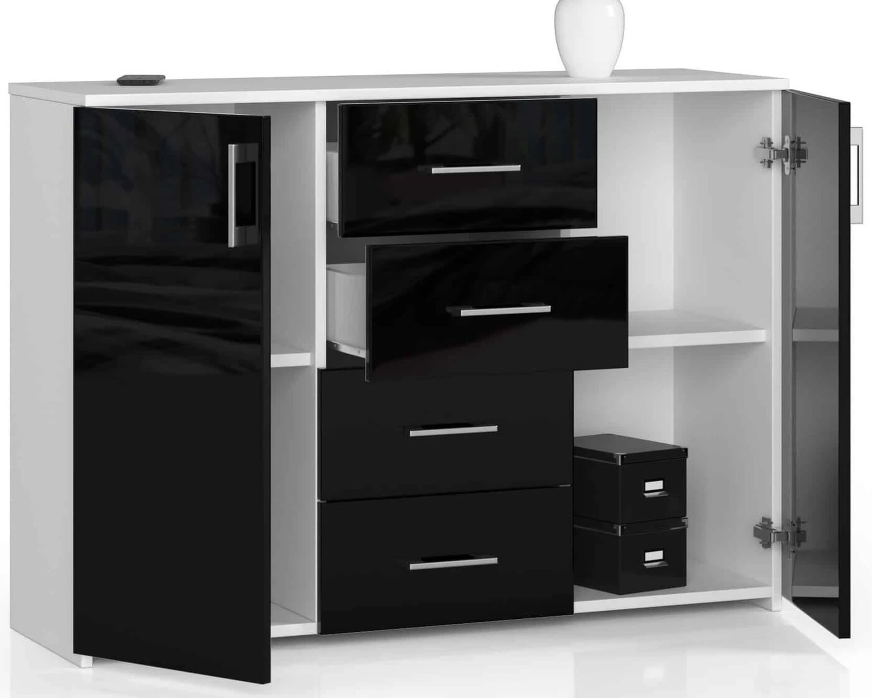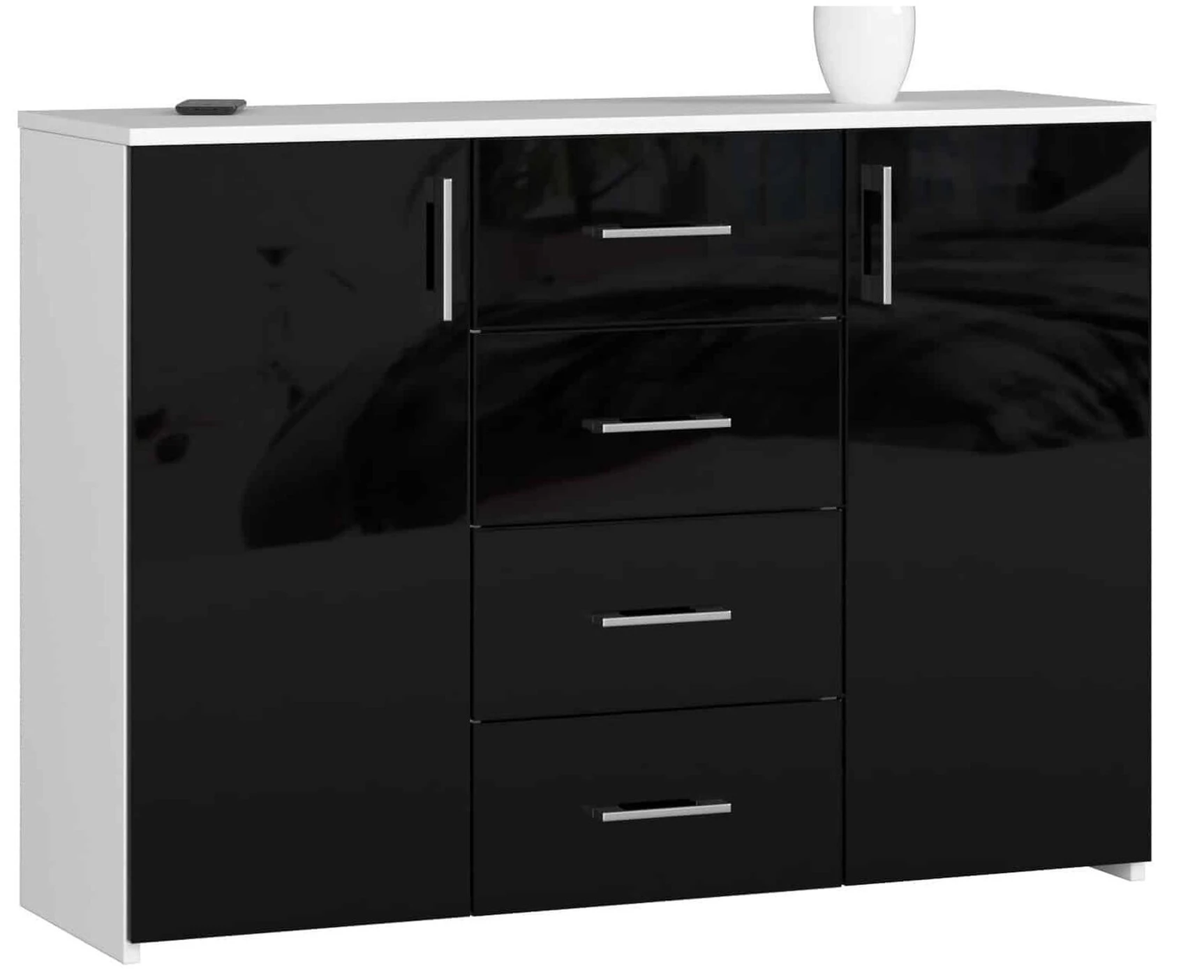Aprašymas buvo automatiškai išverstas, gali pasitaikyti klaidų. - Komodos korpusas pagamintas iš 16 mm baltos matinės laminuotos plokštės, atsparios iki dilimo - Priekiniai skydai pagaminti iš 19 mm AKRYL plokštės su juodu blizgiu dekoru - Stalčiai eina ant metalinių ritinėlių kreiptuvų – durelių viduje yra viena lentyna - Stalviršis, šonai ir fasadai faneruoti ABS briauna - sidabrinės rankenos - savaime surenkama komoda - instrukcijos tiekiama - 24 mėnesių garantija