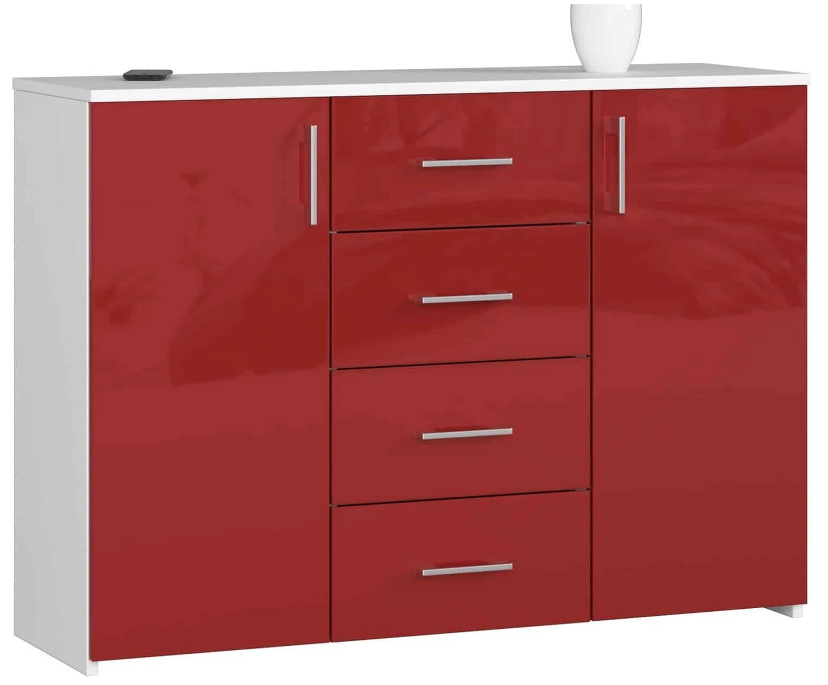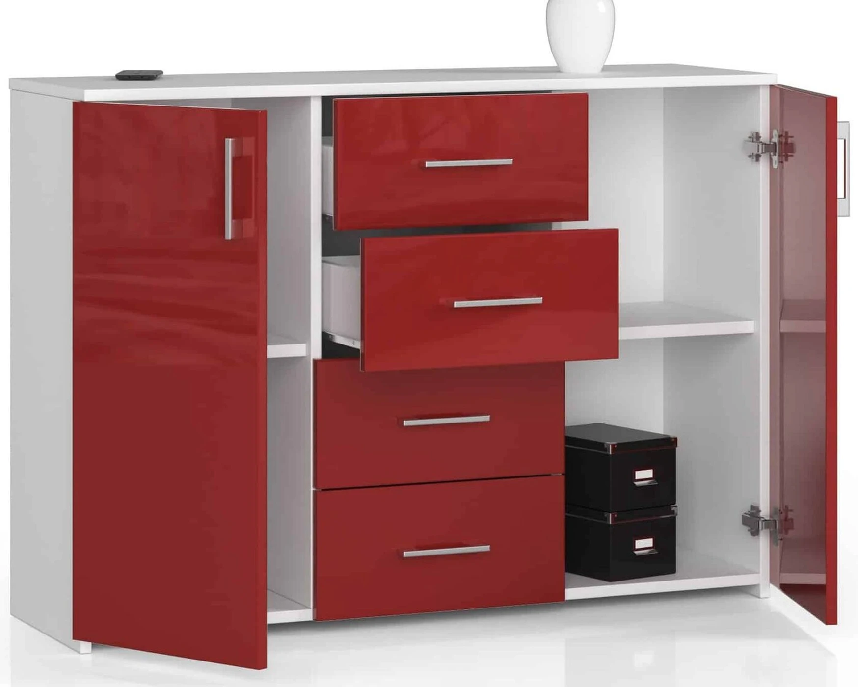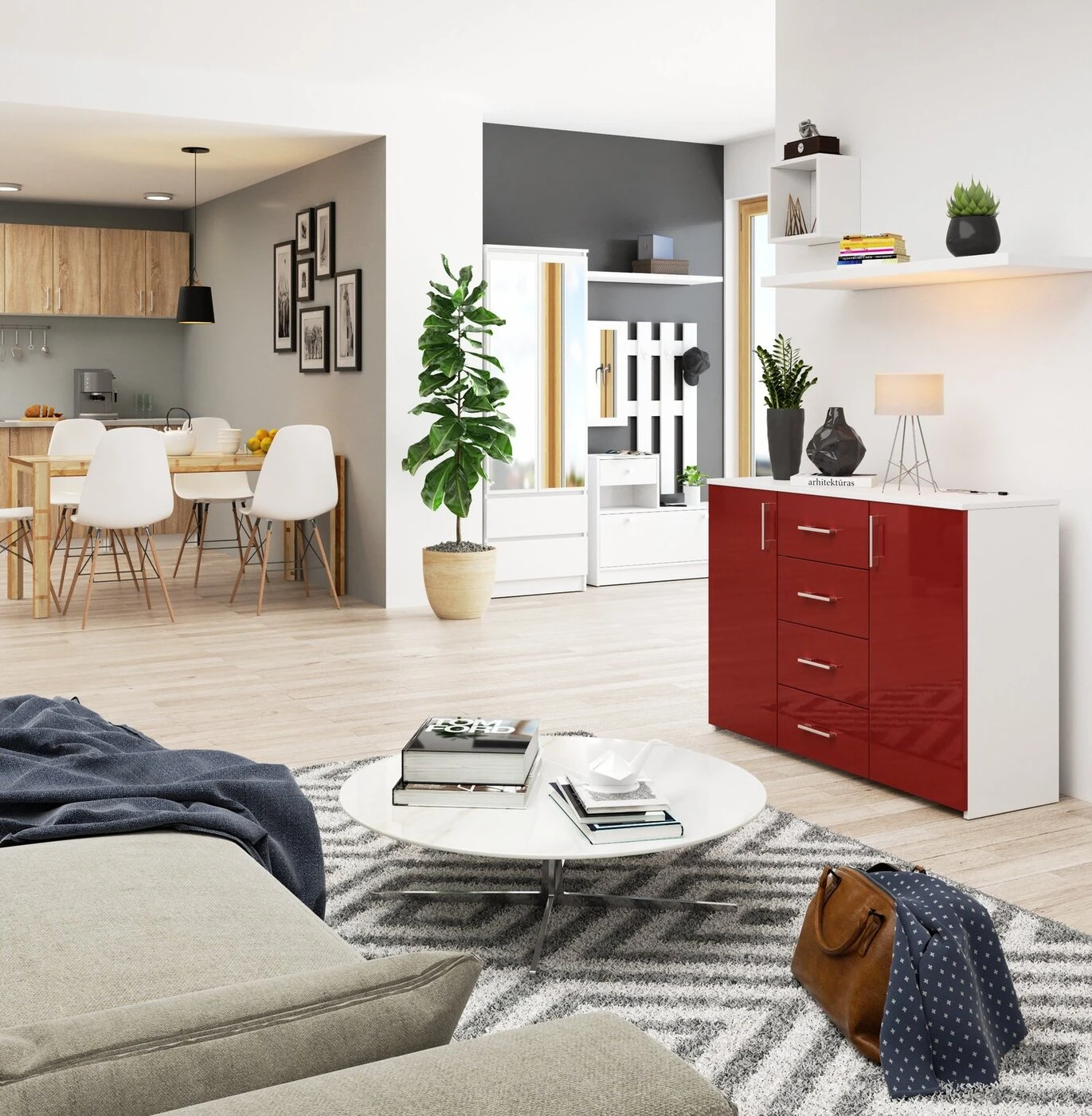 Aprašymas buvo automatiškai išverstas, gali pasitaikyti klaidų. Komoda, modelis K 45, pagaminta gražios, energingos, raudonos spalvos. Blizgios apdailos priekinių dalių raudona puikiai dera su universalia kėbulo balta spalva. Baldai atrodo labai originaliai ir stilingai bei pagyvins net ir pačią vidutiniškiausią erdvę. Baltos/raudonos spalvos blizgus komoda – idealus sprendimas visiems reikliems vartotojams. Jis sukurtas labai funkcionaliai, ką liudija net 4 erdvūs stalčiai ir papildomos lentynos, esančios už durų. Tai puikus dizaino sprendimas, leidžiantis saugoti daug įvairių daiktų. Patogios rankenos, kurios gražiai išsiskiria raudonų fasadų fone – didelis pliusas. Komoda K 45 puikiai tiks modernioje salėje, svetainėje, miegamajame, namų bibliotekoje ir biure. Tai baldas žmonėms, nebijantiems neeilinių sprendimų ir originalių spalvų derinių. Komoda yra baldas ne tik praktiškas, bet ir vizualiai labai patrauklus - Komodos korpusas pagamintas iš laminuotos plokštės balto kilimėlio 16mm atsparus trinčiai - Priekiniai skydai pagaminti iš 19 mm AKRYL plokštės su raudonu dekoro blizgesiu - Stalčiai juda ant metalinių ritinėlių kreiptuvų - Durelių viduje yra viena lentyna - Viršus, šonai ir priekinės dalys padengtos ABS briauna - Sidabrinės rankenos - Savarankiškai surenkama komoda - Instrukcija pridedama – 24 mėnesių garantija