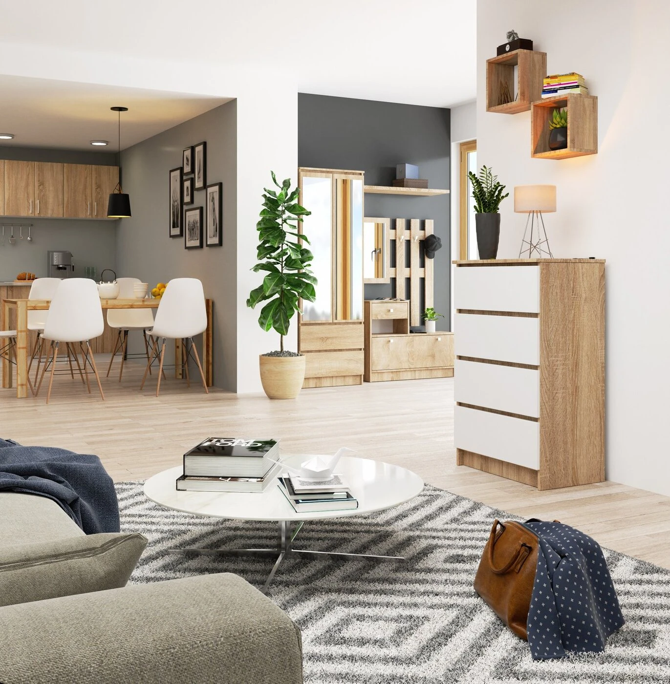 Aprašymas buvo automatiškai išverstas, gali pasitaikyti klaidų. Paprastos formos, tvirta konstrukcija ir nesenstantis dizainas – tai savybės, kurios turėtų apibūdinti tobulus svetainės baldus. Tarp mūsų parengtų pasiūlymų kiekvienas klientas, neatsižvelgdamas į pageidaujamą stilių ir įrengtų patalpų įvairovę, ras sau tinkamą baldą. Mūsų siūlomos komodos yra labai geros kokybės gaminiai, o to pavyzdys gali būti komoda K60 – idealiai tinka mažiems kambariams, yra įdomus dviejų madingiausių spalvų derinys – nemirtinga balta ir itin praktiškas sonoma ąžuolas. . Komodoje yra keturi stalčiai, kuriuose nesunkiai telpa daug tam tikroje erdvėje reikalingų daiktų. Parduodame baldus konkurencingomis kainomis. Kviečiame įsigyti. - Komoda pagaminta iš laminuotos plokštės, atspari trinčiai - Stalčių fasadai iš laminuotos plokštės - Stalčiai juda ant metalinių ritinėlių kreiptuvų. - Kraštai padengti ABS briauna, kad būtų apsaugota nuo pažeidimų. - Savarankiškai surenkama komoda – Pristatyme pateikiamos instrukcijos – 24 mėnesių garantija