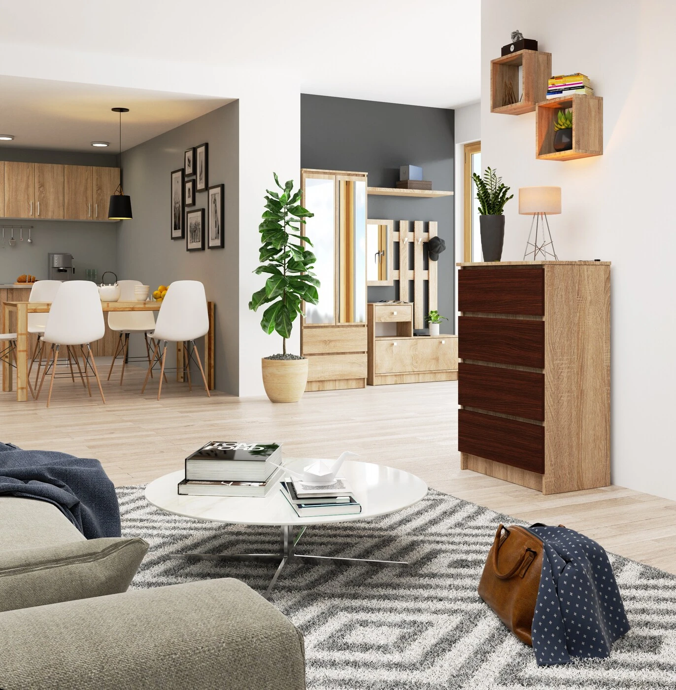 Aprašymas buvo automatiškai išverstas, gali pasitaikyti klaidų. - Komoda iš dilimui atsparios laminuotos plokštės - Stalčių fasadai pagaminti iš laminuotos plokštės - Stalčiai yra ant metalinių ritinėlių kreipiančiųjų - Kraštai padengti ABS briauna, užtikrinančia aukštą apsaugą nuo pažeidimų - Savarankiškai surenkama komoda - Pristatymo vadovas - Garantija 24 mėn.