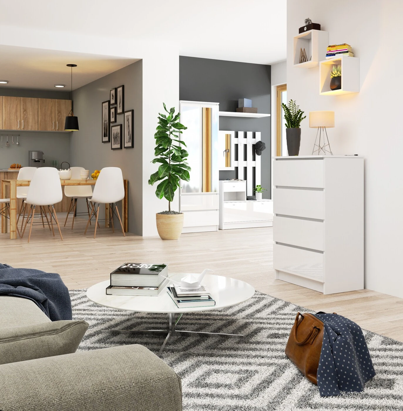 Aprašymas buvo automatiškai išverstas, gali pasitaikyti klaidų. Baltos spalvos komoda K 60 cm yra paprastas, bet elegantiškas baldas, išsiskiriantis nesenstančiu charakteriu. Universalus dizainas leidžia jį naudoti bet kurioje Jūsų pasirinktoje patalpoje – svetainės, jaunimo, vaikų, miegamojo, valgomojo, koridoriaus ar biuro interjere. Spintoje yra keturi erdvūs stalčiai, kurie paprastai atsidaro ir užsidaro. Baltas, blizgus akrilo fasadas yra vertinamas klientų, kurie vertina tiek pasirinktų gaminių vizualines savybes, tiek aukštą kokybę. - Komoda pagaminta iš patvari laminuota lenta, kuri yra atspari dilimui; - Priekinės dalys pagamintos iš MDF ACRYLIC WHITE GLOSS, kurio storis 19 milimetrų; - Naudojami stalčiai juda ant metalinių ritinėlių kreiptuvų ; - priekis, šonai ir viršus padengtas ABS apvadu; - Komoda yra gaminys, skirtas montuoti savarankiškai; - Instrukcija yra komplekte; - Komodos garantija yra dvidešimt keturi mėnesiai;