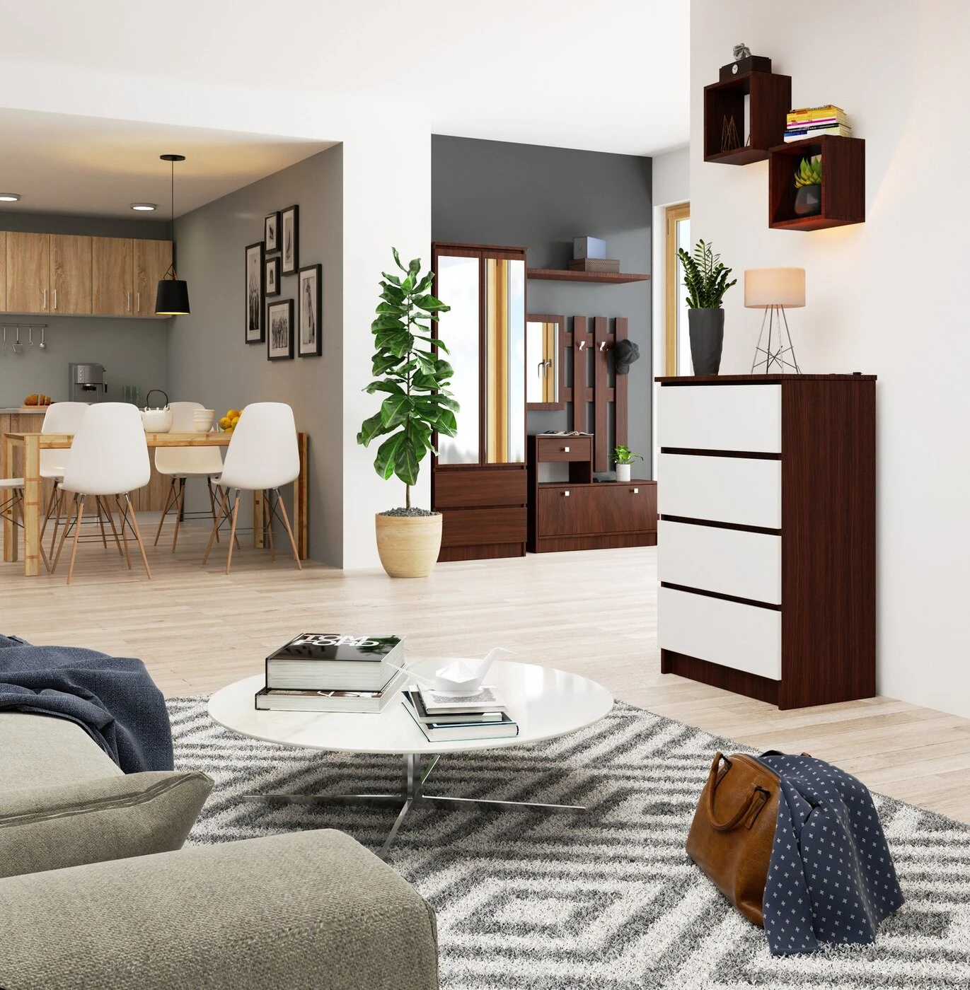 Aprašymas buvo automatiškai išverstas, gali pasitaikyti klaidų. Paprastas, tačiau akį traukiantis šios komodos dizainas yra akivaizdžiausias jos pranašumas. Kontrastingas tamsios venge spalvos derinys su baltos spalvos grynumu pagyvins bet kokį interjerą – nuo svetainės iki siauro koridoriaus, suteikdamas jam charakterio ir išraiškingumo. A Komoda su keturiais talpiais stalčiais yra visų pirma praktiška vieta smulkiems daiktams, dokumentams ar drabužiams laikyti. Miegamajame puikiai tiks kaip patalynės ar naktinių drabužių pagalvių užvalkalų laikymo vieta, jaunimo kambaryje padės palaikyti tvarką paaugliui, o prieškambaryje bus patogi vieta susidėti šalikus, kepures ir kitus aksesuarus. . Pravers ir darbo kabinete ar namų biure. Komoda buvo sukurta kiekvienam, kuris vertina baldus, kurie yra ne tik gražūs, bet ir patvarūs bei funkcinis. Todėl tiek šonai, tiek fasadai pagaminti iš patvarios 16 mm storio laminuotos plokštės, atsparios trinčiai ir smulkiems įbrėžimams, o siekiant papildomai sustiprinti labiausiai pažeidžiamas briaunas, buvo padengtos ABS briauna, kuri garantuoja aukštą apsaugą nuo defektų. Dėl to komoda tarnaus ilgus metus ir vis dar atrodys kaip nauja. Stalčiai dedami ant metalinių ritinėlių kreiptuvų, kurių dėka jie visada juda sklandžiai, netrukdant ir tyliai, todėl iš jų lengva greitai išimti reikiamus daiktus ir uždaryti net nenaudojant rankų. Ergonomiškas tarpų tarp stalčių plotis leidžia išlaikyti minimalistinį komodos dizainą – norint patogiai atidaryti stalčių nereikia jokių rankenėlių, rankenėlių ar rankenėlių. Komoda skirta montuoti savarankiškai ir jai taikoma 24 mėnesių garantija. Prie baldų pateiktoje instrukcijoje yra visos reikalingos instrukcijos, kad net ir didžiausias pasaulietis galėtų susidoroti su surinkimu. - Komoda iš dilimui atsparaus laminato lenta - Stalčių fasadai pagaminti iš laminuotos plokštės - Stalčiai juda ant metalinių ritinėlių kreiptuvų - Kraštai padengti ABS briauna, užtikrinančia aukštą apsaugą nuo pažeidimų - Savarankiškai surenkama komoda br /> - Pristatyme pateikiamos instrukcijos - 24 mėnesių garantija