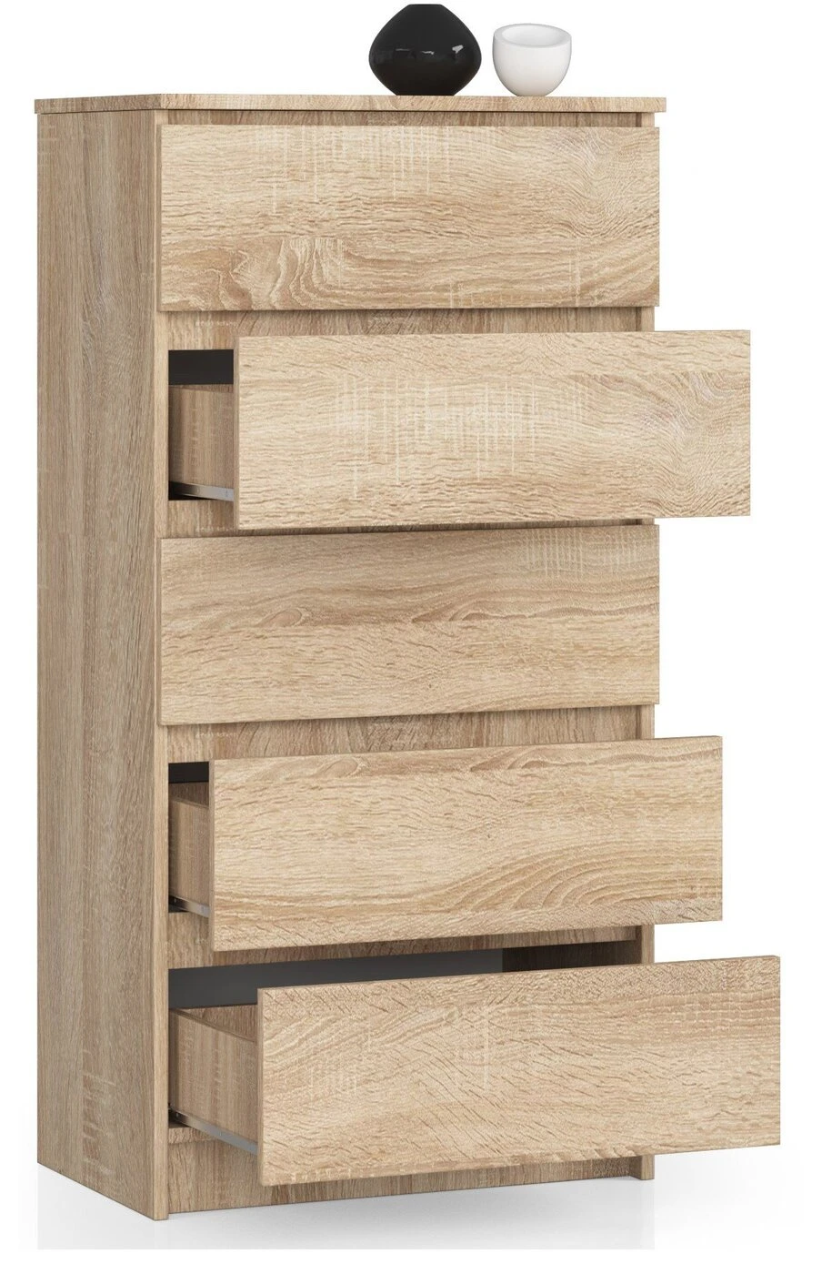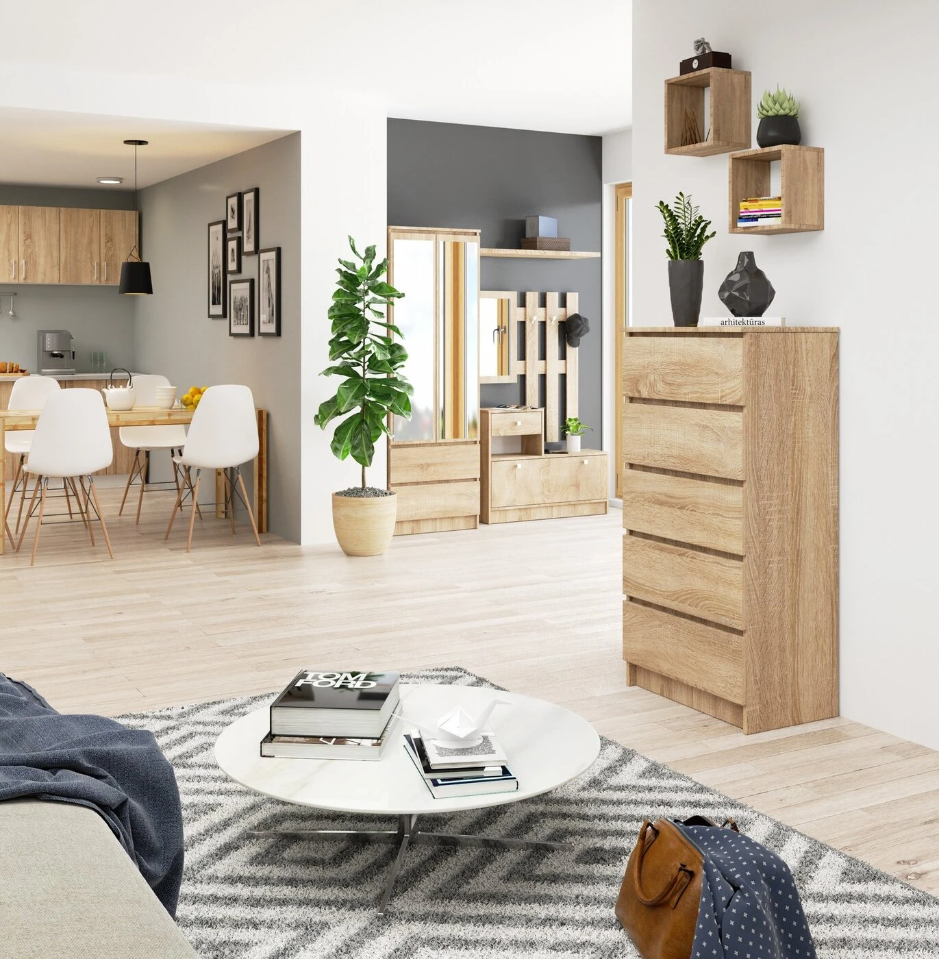 Aprašymas buvo automatiškai išverstas, gali pasitaikyti klaidų. Pristatome aukštos kokybės komodą, kurią sukūrė rinkoje vertinama įmonė Kronospan. Tai atsparus dilimui modelis, todėl tarnaus ilgiau. Papildomas baldų privalumas – stalčių fasadai iš patikimos laminuotos plokštės. Minėti stalčiai veikia ant metalinių ritinėlių kreiptuvų. Be to, buvo pasirūpinta ir ratlankiais iš ABS medžiagos. Komoda dekoruota originalia ir modernia sonoma spalva, kuri tiks šviesiame ir erdviame interjere. Galima patekti į miegamąjį, svetainę ar net prieškambarį – viskas priklauso nuo savo talpos. – Komoda surenkama savaime – pridedama instrukcija – patvari laminuota lenta - ABS apvadai - 5 talpūs stalčiai - CLP baldų sistema - 24 mėnesių garantija Graži sonomos spalva modelis turi penkis erdvius stalčius, veikiančius ant patvarių ritininių kreiptuvų. Stalčiai atsidaro ir užsidaro labai švelniai. Komoda lygiai 60 centimetrų ilgio, modelio aukštis – 121 centimetras, gylis – 40 centimetrų. Gamybai naudojama laminuota plokštė yra 16 milimetrų ilgio, ABS briaunos padidins patvarumą ir prailgins baldo naudojimo laiką. Bendras mūsų siūlomos komodos svoris yra lygiai 36 kilogramai.