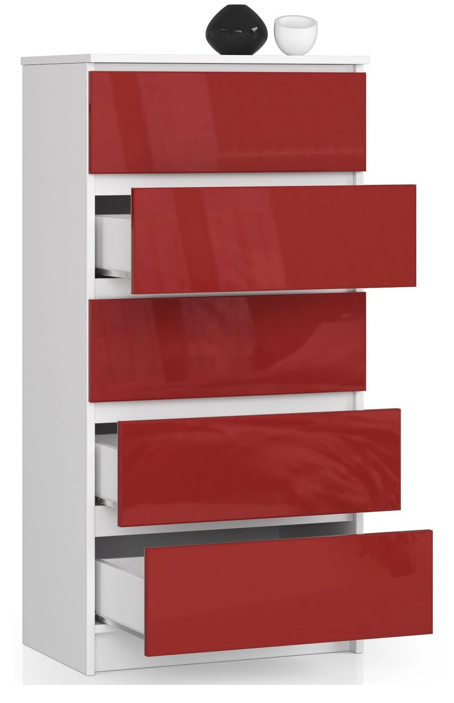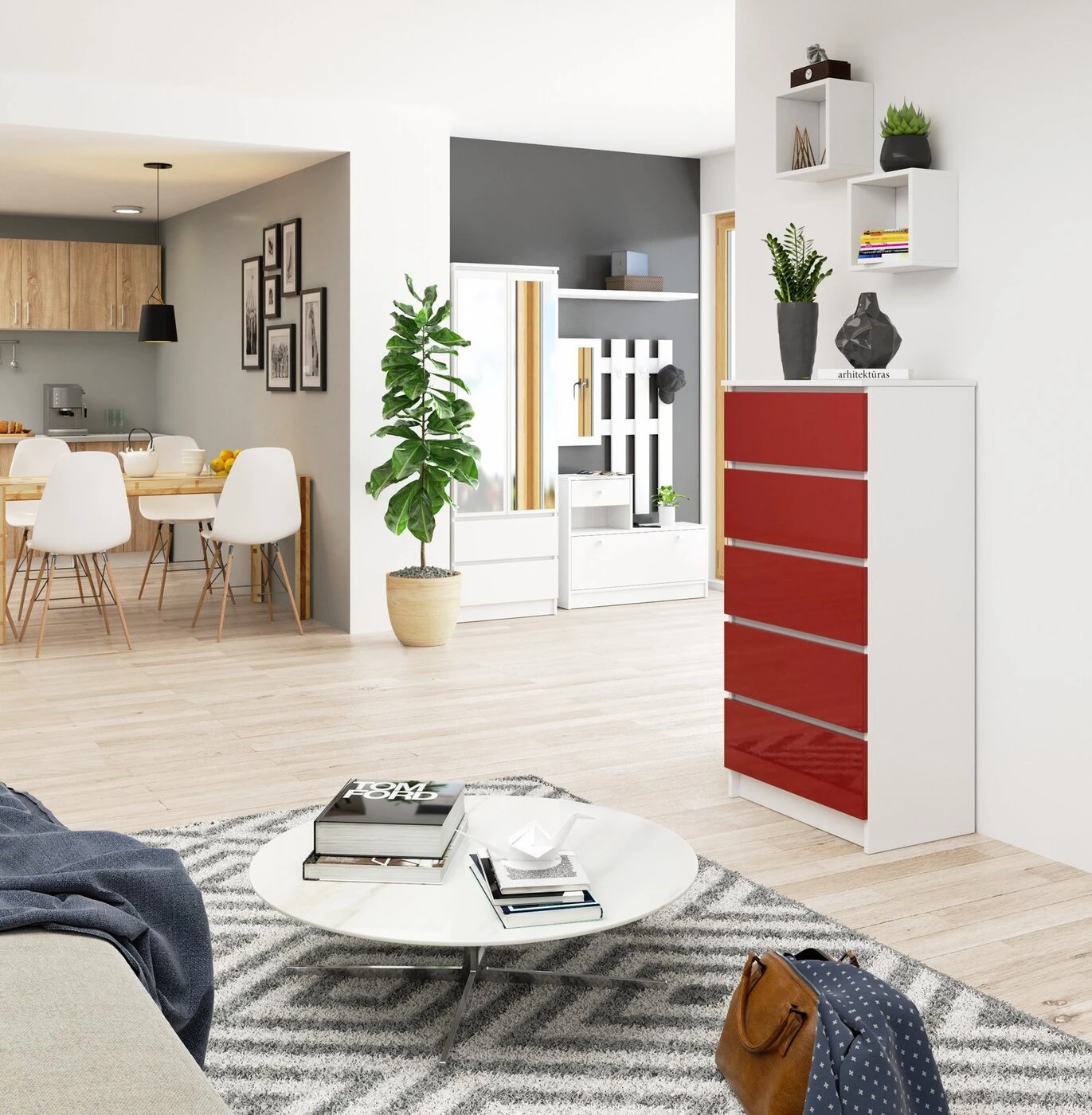 Aprašymas buvo automatiškai išverstas, gali pasitaikyti klaidų. Ar jums patinka neįprasti pasiūlymai ir originalus interjeras? Ieškote nepastebimo baldo, kuris pavogs jūsų širdį ir leistų sukurti svajonių kambarį? Pristatoma K60 komoda su penkiais erdviais stalčiais tikrai pateisins Jūsų lūkesčius. Tai baldas, kuriame dera patrauklus dizainas, funkcionalumas ir puiki kokybė. Įdomiai suprojektuoti baldai patiks pirmiausia jaunam žmogui, nebijančiam intensyvių spalvų ir turinčiam įdomių minčių derinimui. Komodai ir kitiems šios serijos pasiūlymams garantuojame patrauklią kainą. - Komoda iš dilimui atsparios laminuotos plokštės - Priekinės dalys pagamintas iš 19 mm MDF akrilo, raudono blizgesio - Stalčiai yra ant metalinių ritinėlių kreiptuvų - Stalviršis, šonai ir fasadai yra faneruoti ABS apvadu - Savarankiškai surinkimo komoda - Instrukcija pridedama - Garantija 24 mėn.