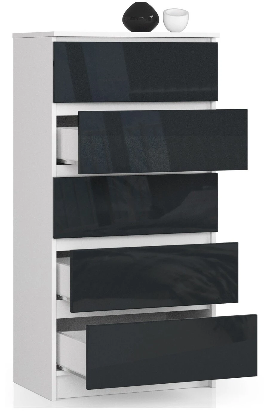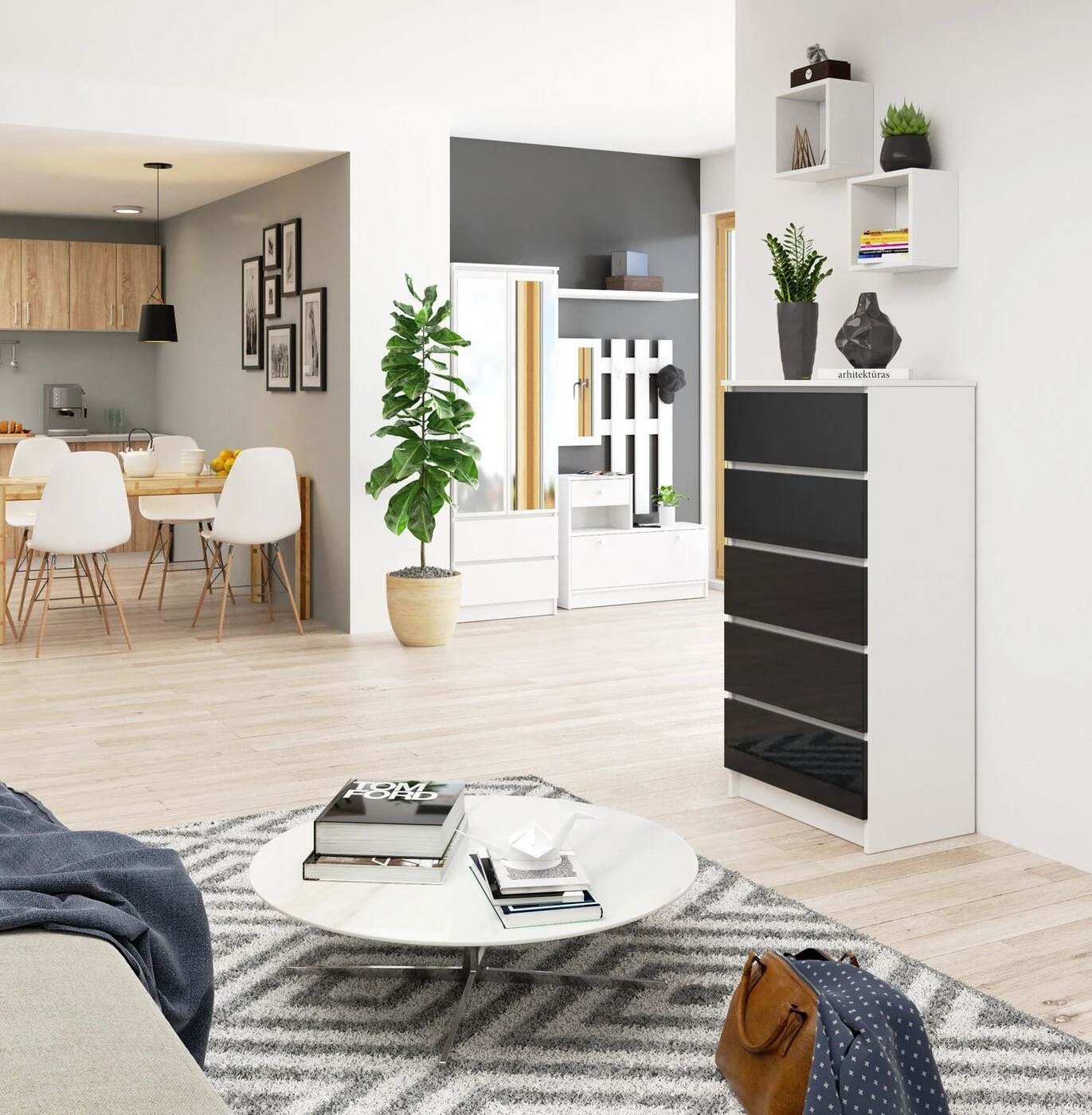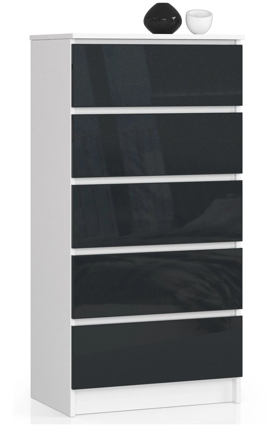 Aprašymas buvo automatiškai išverstas, gali pasitaikyti klaidų. Komoda K 60 cm. su penkiais stalčiais yra balto korpuso ir grafito spalvos akrilo fasadų derinys. Madingas blizgesys turi įtakos baldo vizualinei vertei, o tvirta struktūra – ilgaamžiškumui. Pateiktas sprendimas labai gerai veiks daugelyje gyvenamųjų ir biurų patalpų. Jis gali būti naudojamas svetainėje, miegamajame, valgomajame, taip pat jaunimo kambaryje, suteikiant daug vietos įvairiems daiktams laikyti. - medžiaga, iš kurios pagaminta komoda, yra laminuota dilimui atspari plokštė; - grafito fasadai iš 19 mm akrilo akrilo grafito blizgaus MDF plokštės; - baldų stalčiai judėti ant metalinių ritinėlių kreiptuvų; - stalviršis , šonai ir fasadai padengti patvariu ABS briauna; - Dėl paprastos konstrukcijos baldas dažniausiai naudojamas išdėstymui modernus ir skandinaviškas interjeras; - Komoda skirta savarankiškam, bet paprastam surinkimui ir pridedama instrukcija; - Garantija galioja dvidešimt keturis mėnesius.